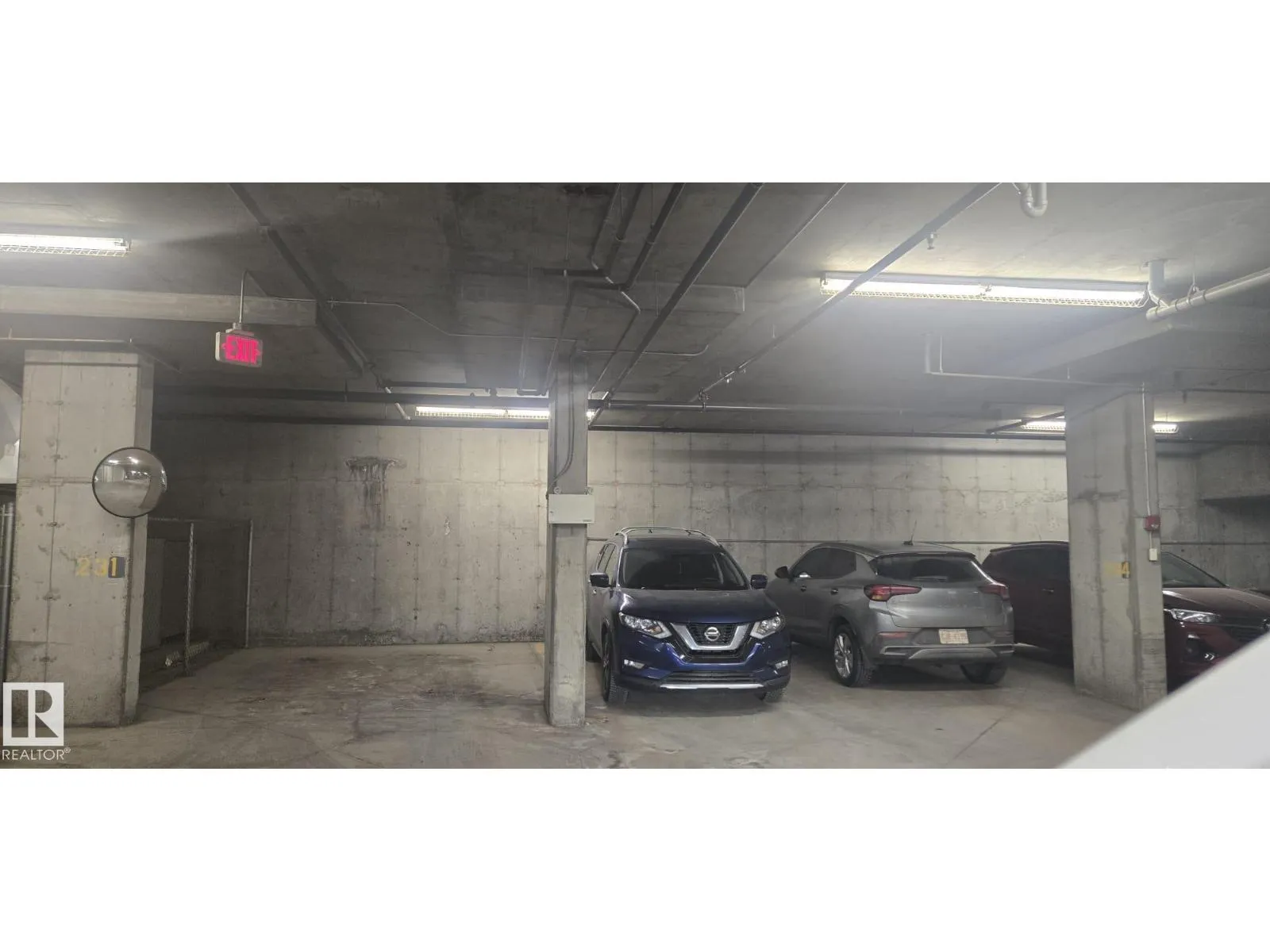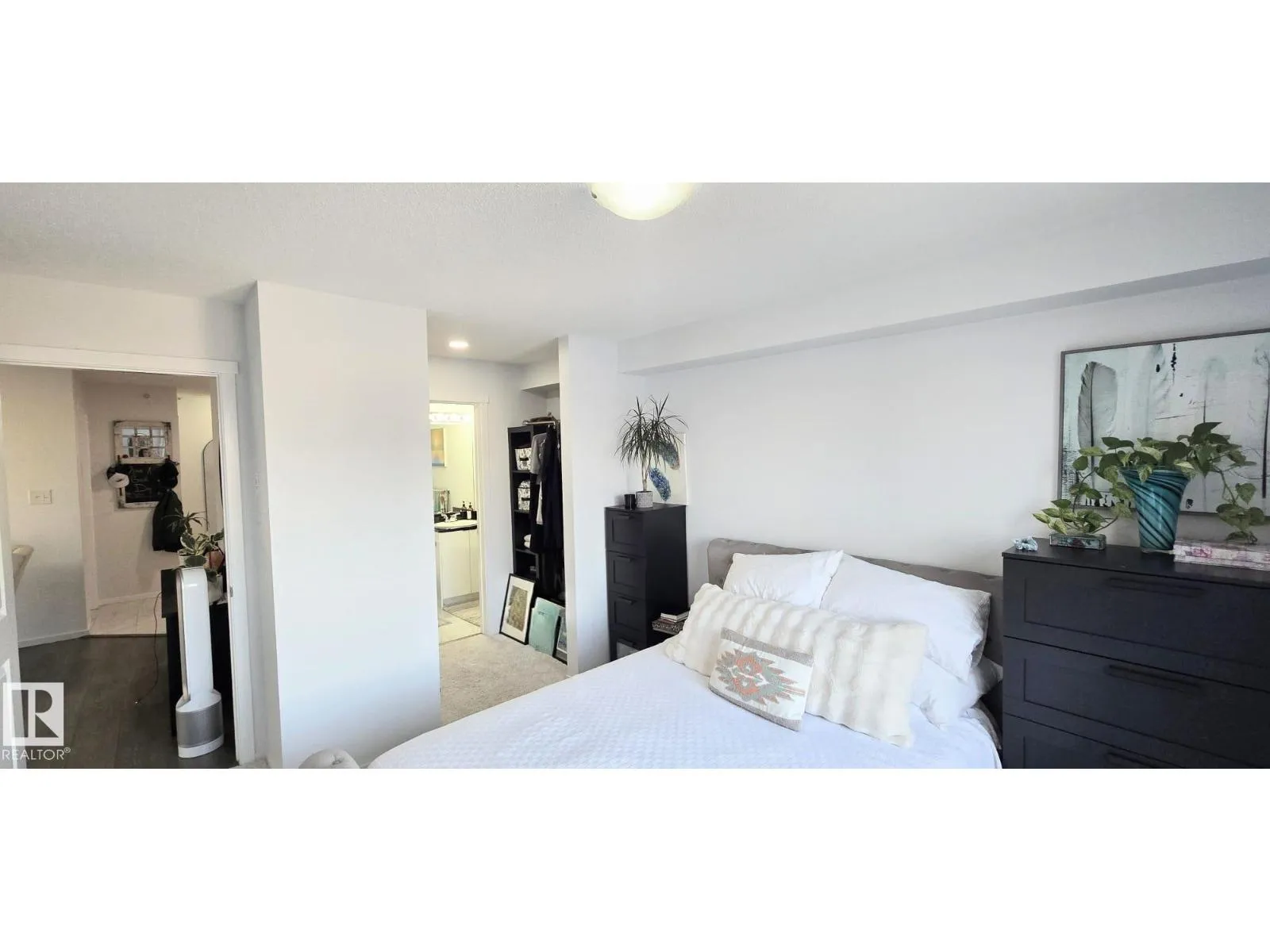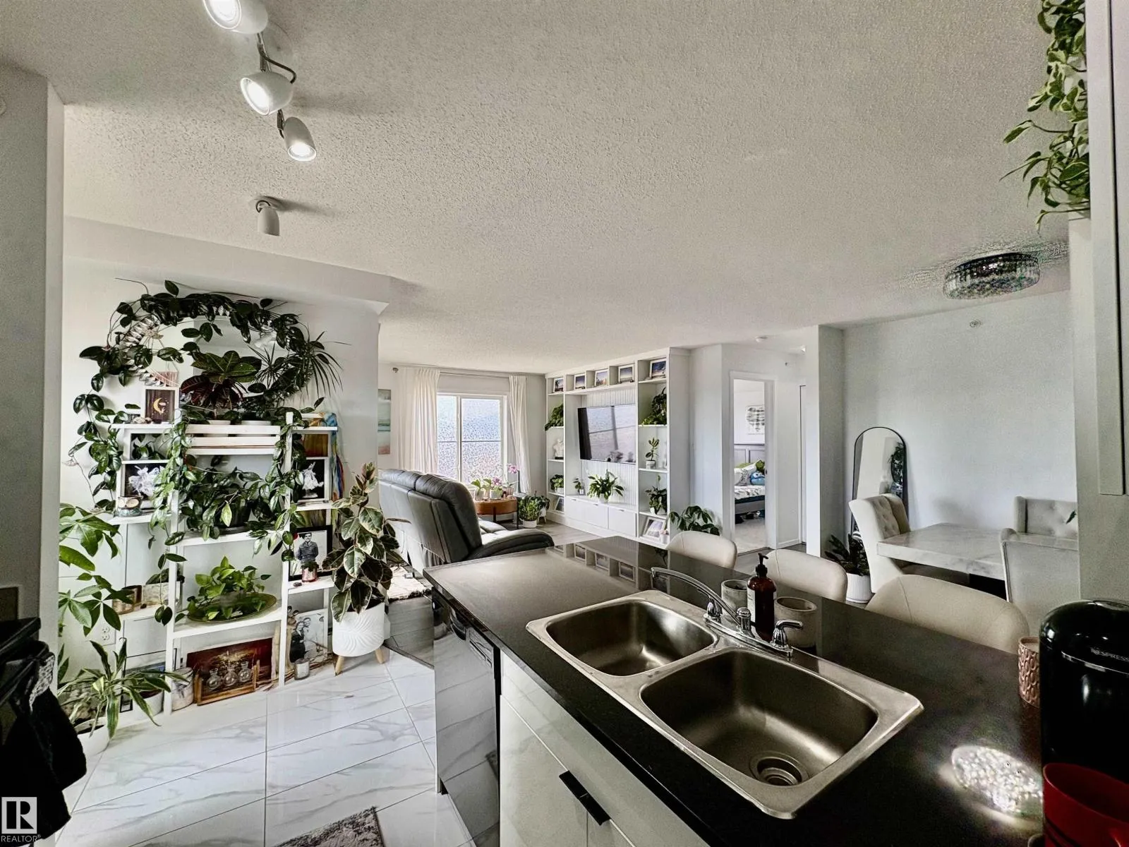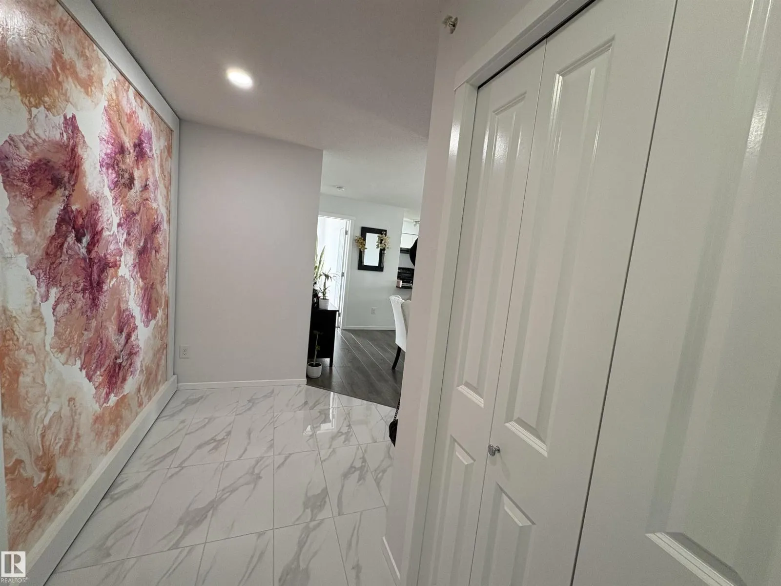 Bright, sunny top-floor corner unit with 2 bedrooms, 2 baths, den with desirable south-west exposure with lake views! This beautifully renovated home features a brand-new kitchen with quartz countertops, ceramic tile floors, fresh paint, plush carpeting, updated bathrooms, and stylish lighting throughout, as well as a custom-built-in TV wall unit and a new washer-dryer. All renovations have been completed within the last year, offering modern comfort and peace of mind. Step out onto the private deck and enjoy the serene surroundings and downtown skyline view. This spacious layout includes two bedrooms plus a den/office, with loads of windows that flood the home with natural light. A cleverly designed hidden office adds both functionality and charm, making this space truly unique. Includes a titled heated underground parking stall for added comfort and convenience. Shows fantasticâmove-in ready! (id:27476)