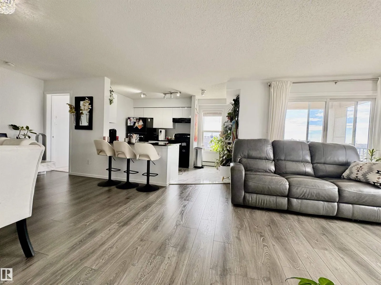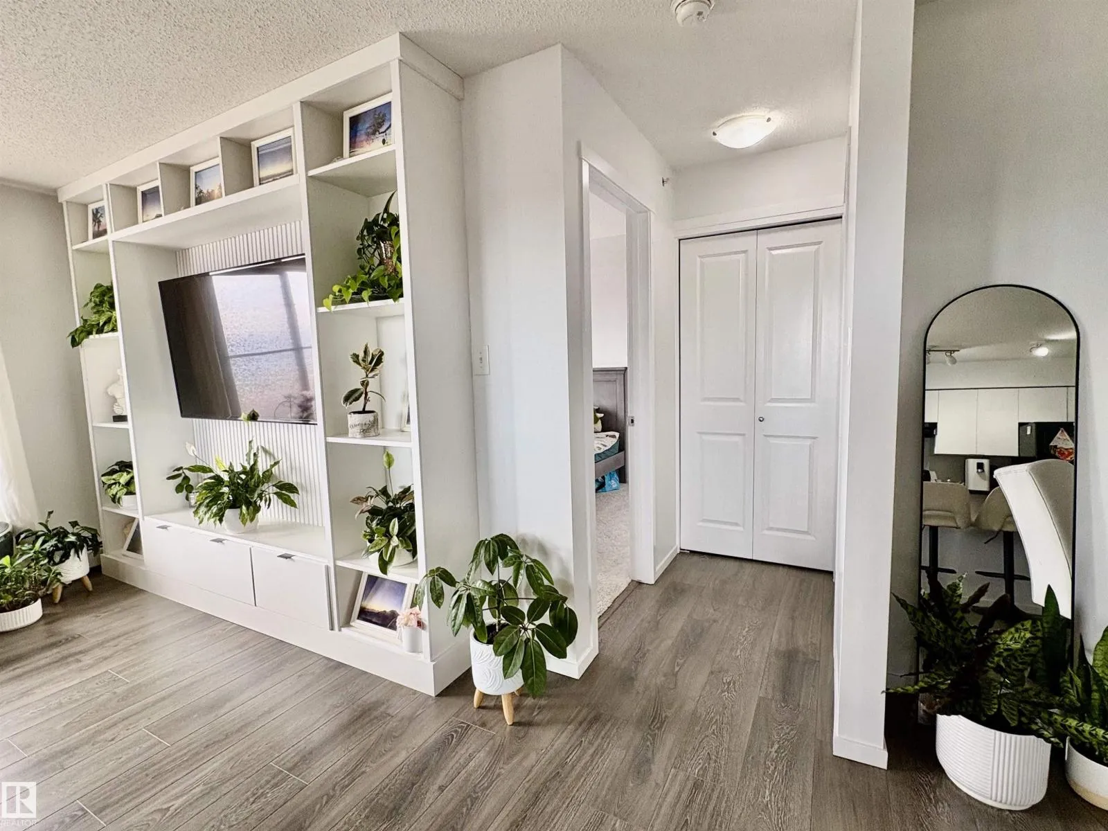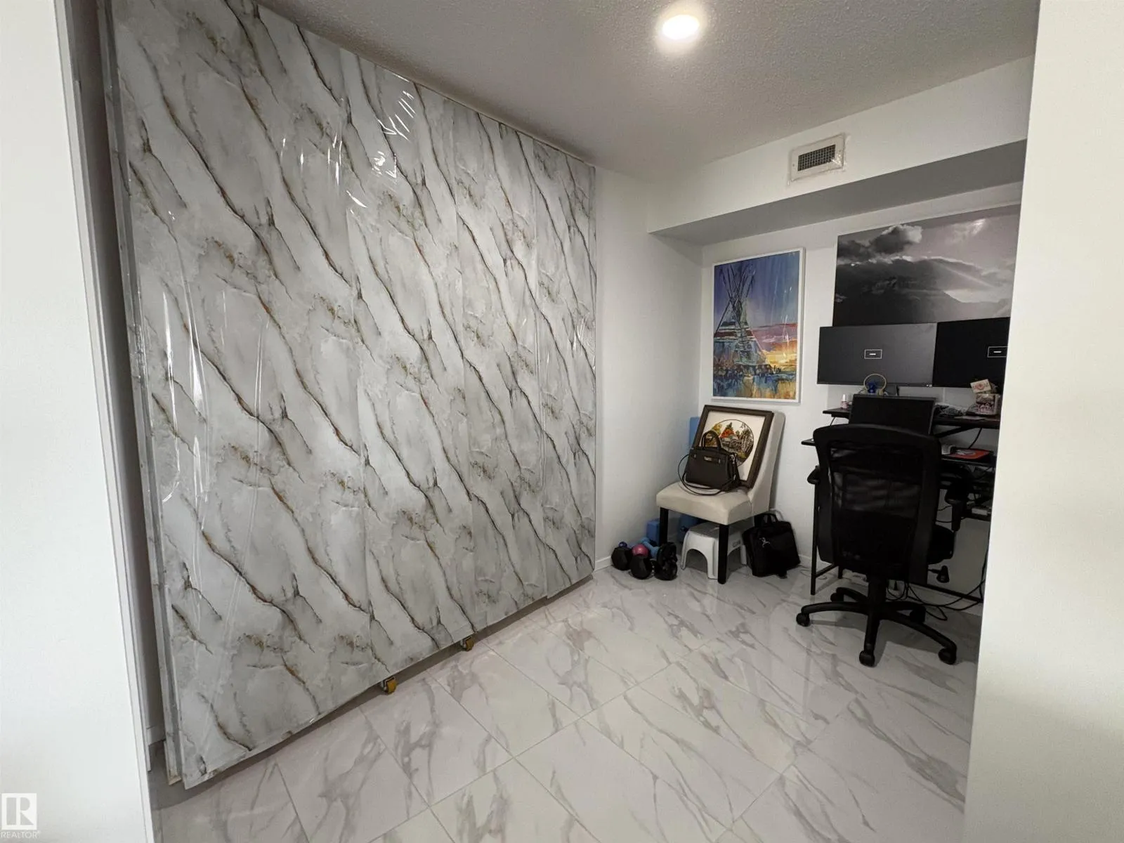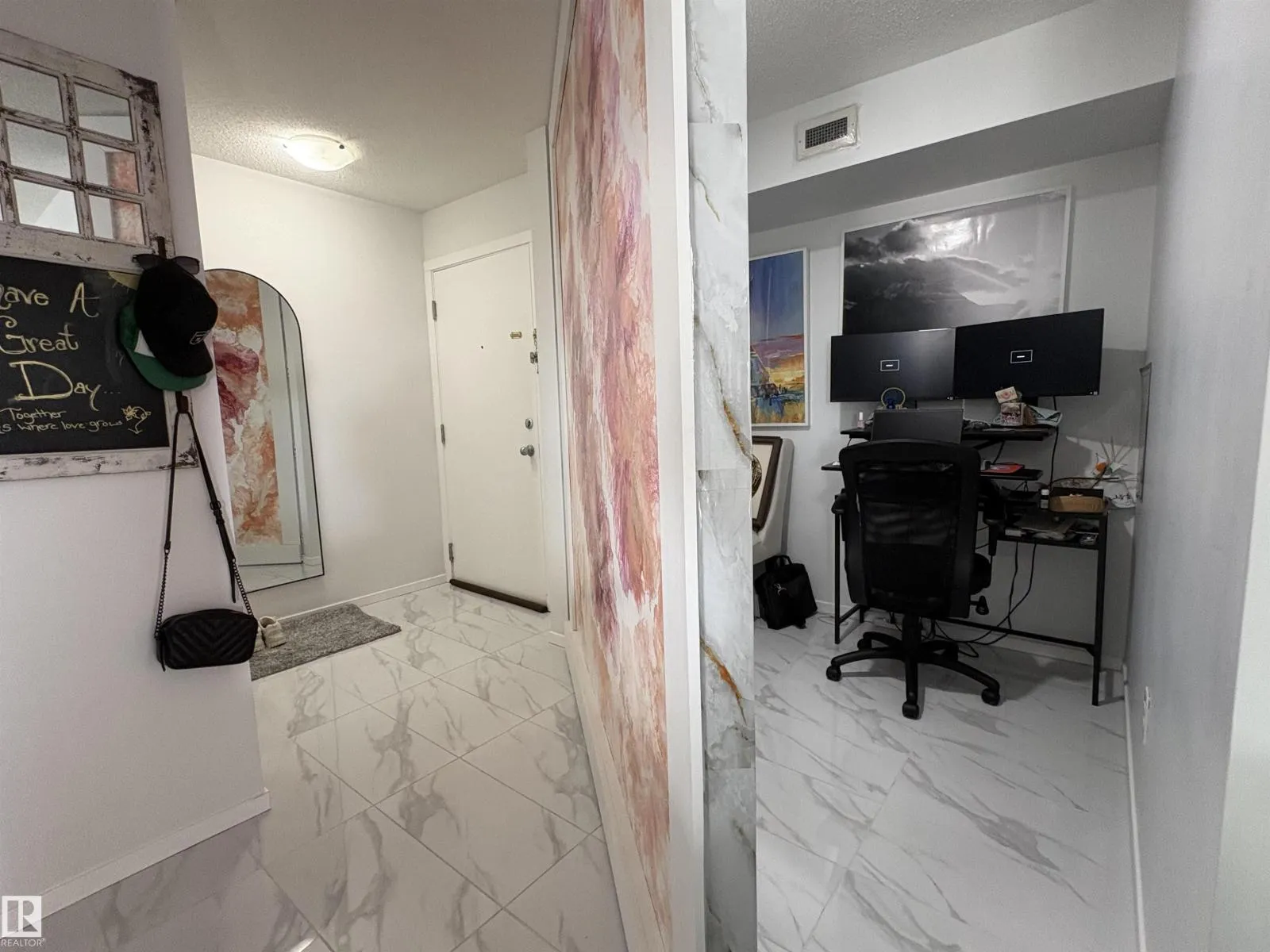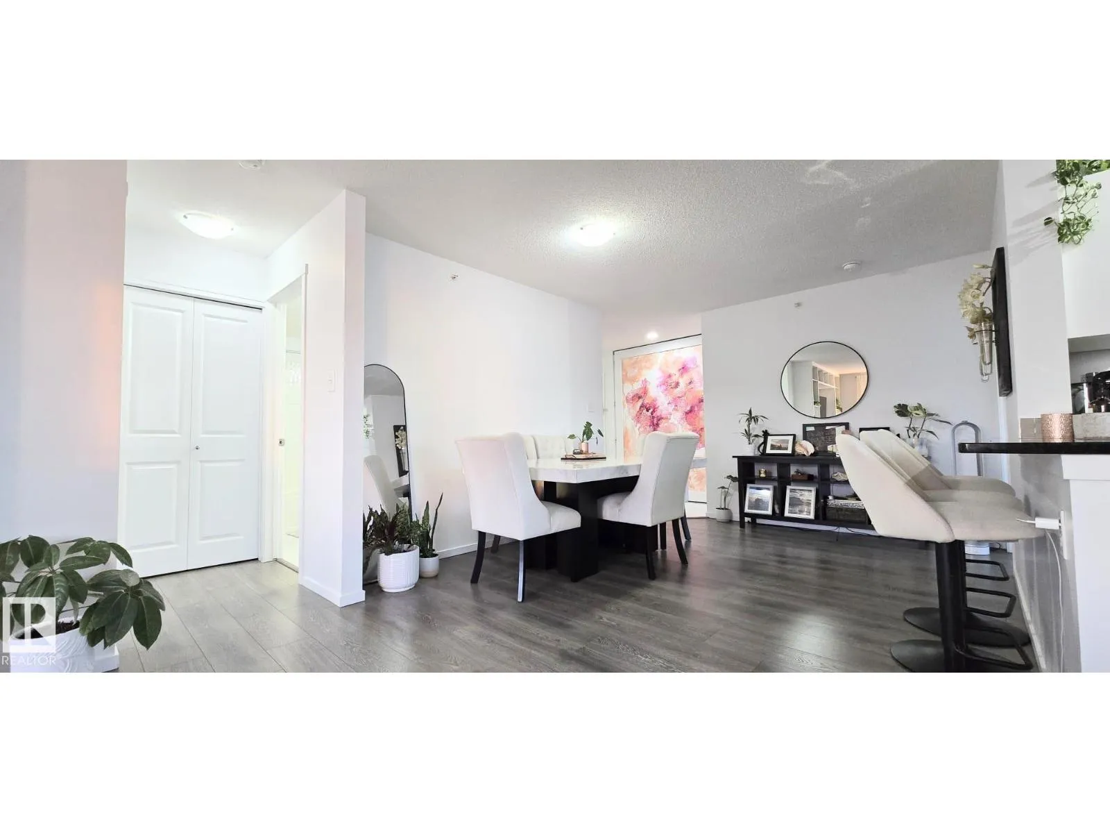 Bright, sunny top-floor corner unit with 2 bedrooms, 2 baths, den with desirable south-west exposure with lake views! This beautifully renovated home features a brand-new kitchen with quartz countertops, ceramic tile floors, fresh paint, plush carpeting, updated bathrooms, and stylish lighting throughout, as well as a custom-built-in TV wall unit and a new washer-dryer. All renovations have been completed within the last year, offering modern comfort and peace of mind. Step out onto the private deck and enjoy the serene surroundings and downtown skyline view. This spacious layout includes two bedrooms plus a den/office, with loads of windows that flood the home with natural light. A cleverly designed hidden office adds both functionality and charm, making this space truly unique. Includes a titled heated underground parking stall for added comfort and convenience. Shows fantasticâmove-in ready! (id:27476)