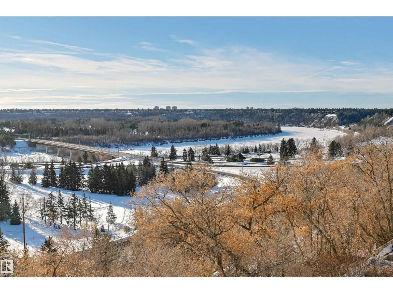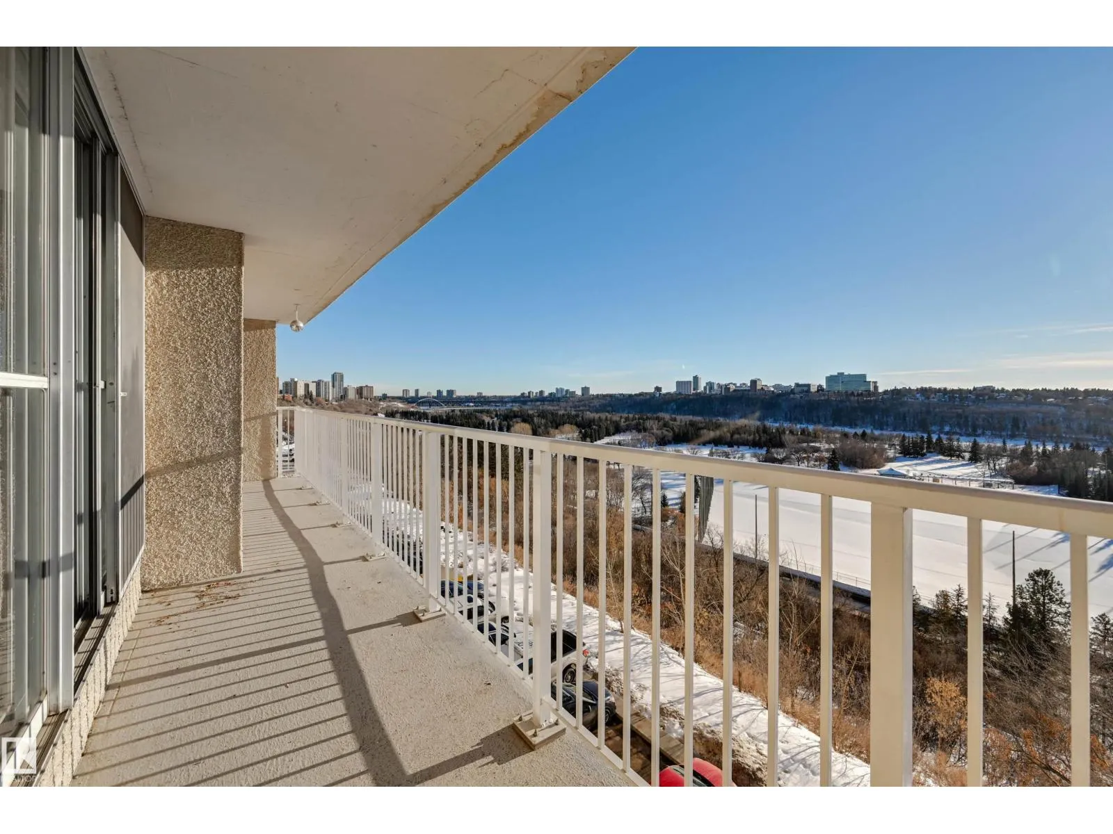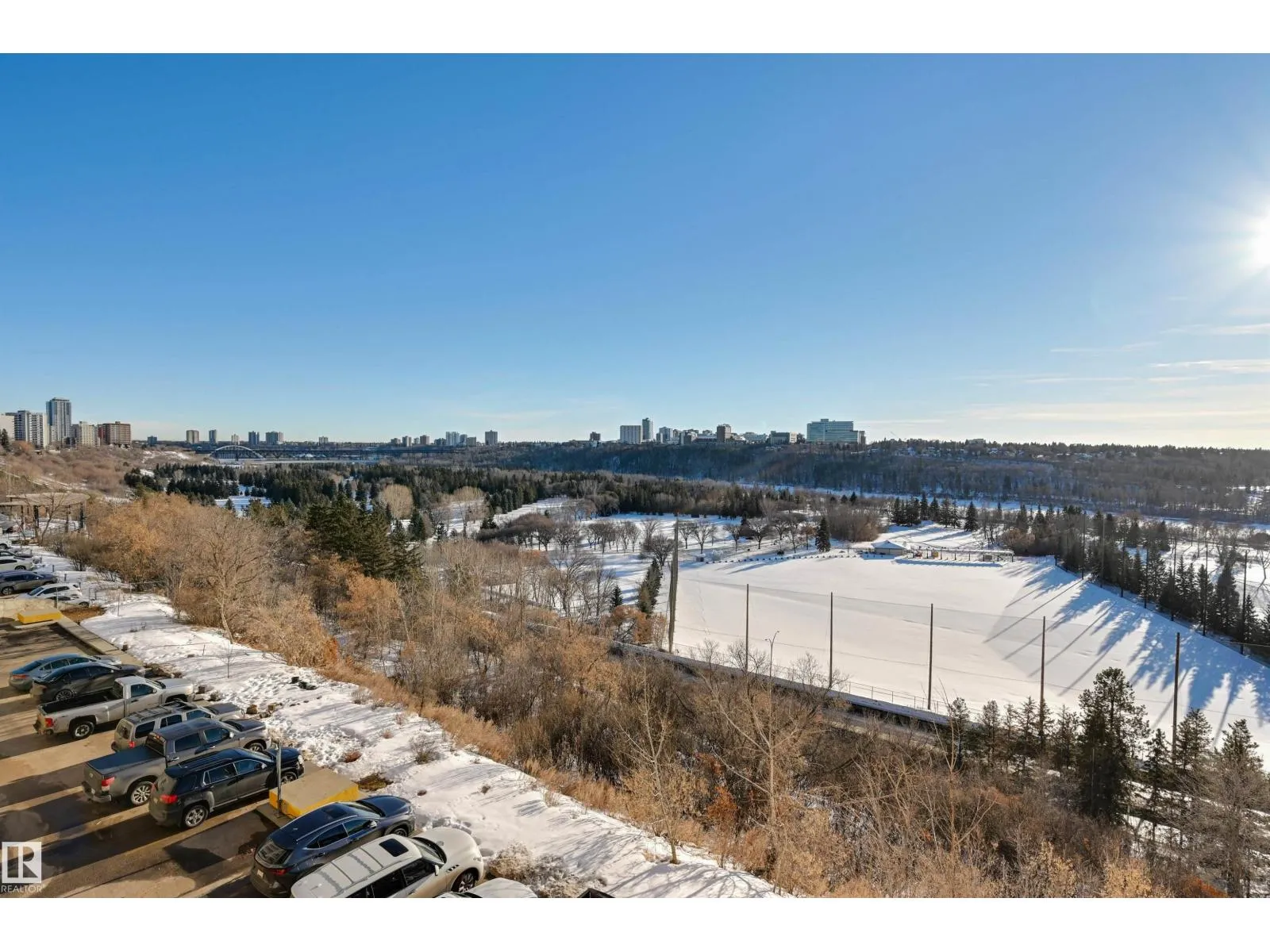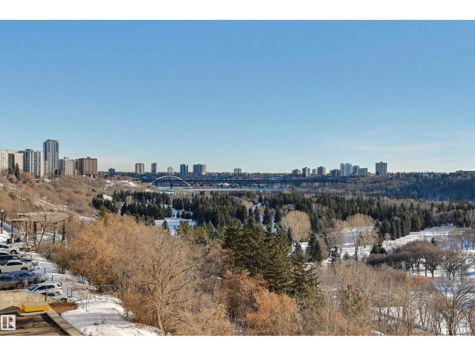 SPECTACULAR RIVER VALLEY VIEW from every window in this BRIGHT, COMPLETELY RENOVATED 1126 sq.ft. 2 bedroom 1.5 bathroom condo in TOP OF THE VALLEY conveniently located with transportation at your doorstep, close to unique shops, restaurants, coffee shops, Art Galleries, the Brewery District, the river valley walking/biking trails & quick access to the U of A. Spacious living room overlooking the river & access to the sunny south facing balcony. The gourmet kitchen is open to the living area with espresso color cabinetry, granite countertops, S/S appliances. The dining room has built-in cabinets. The primary suite is complete with a walk-in closet & a 2 piece bathroom. Spacious 2nd bedroom & a 4 piece bathroom with tile tub surround, new vanity & toilet. Laminate flooring throughout except for tile in the bathrooms. Large storage room. The condo fees include heat, water, power, laundry & underground parking. The building features a completely remodelled exercise room & lobby. Shows very well! (id:27476)