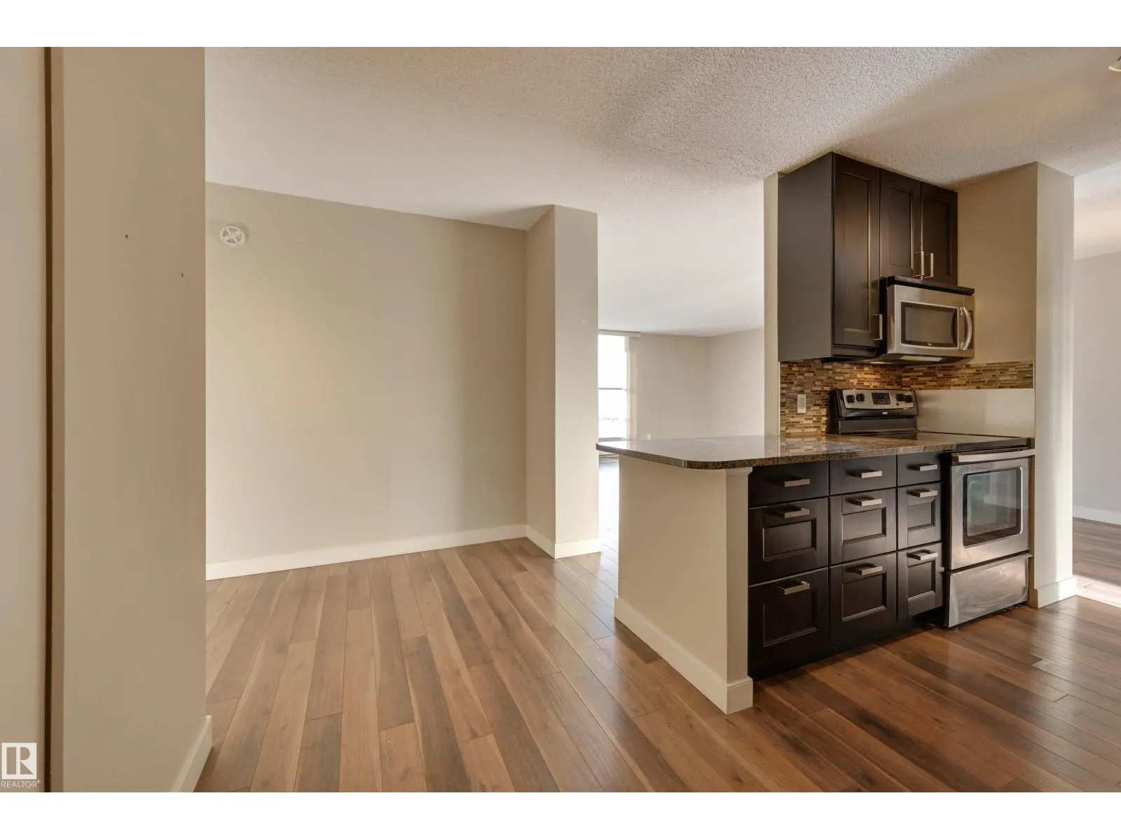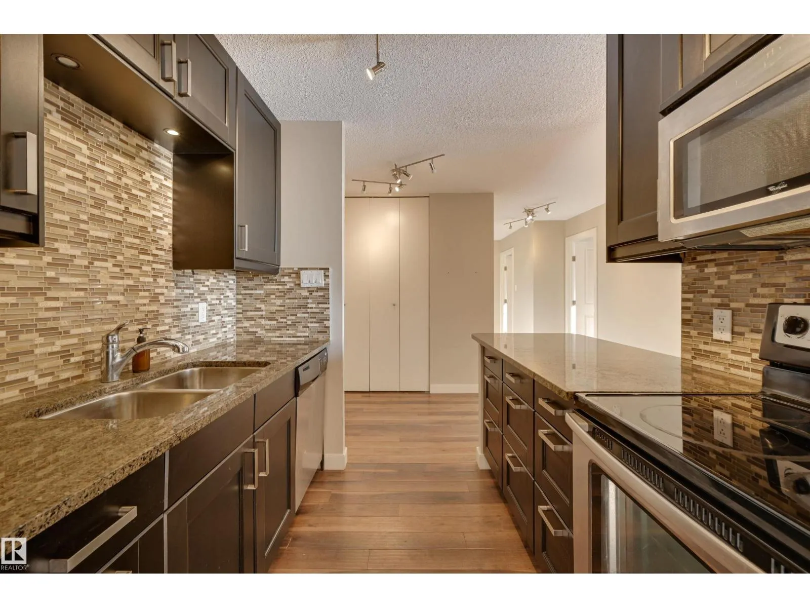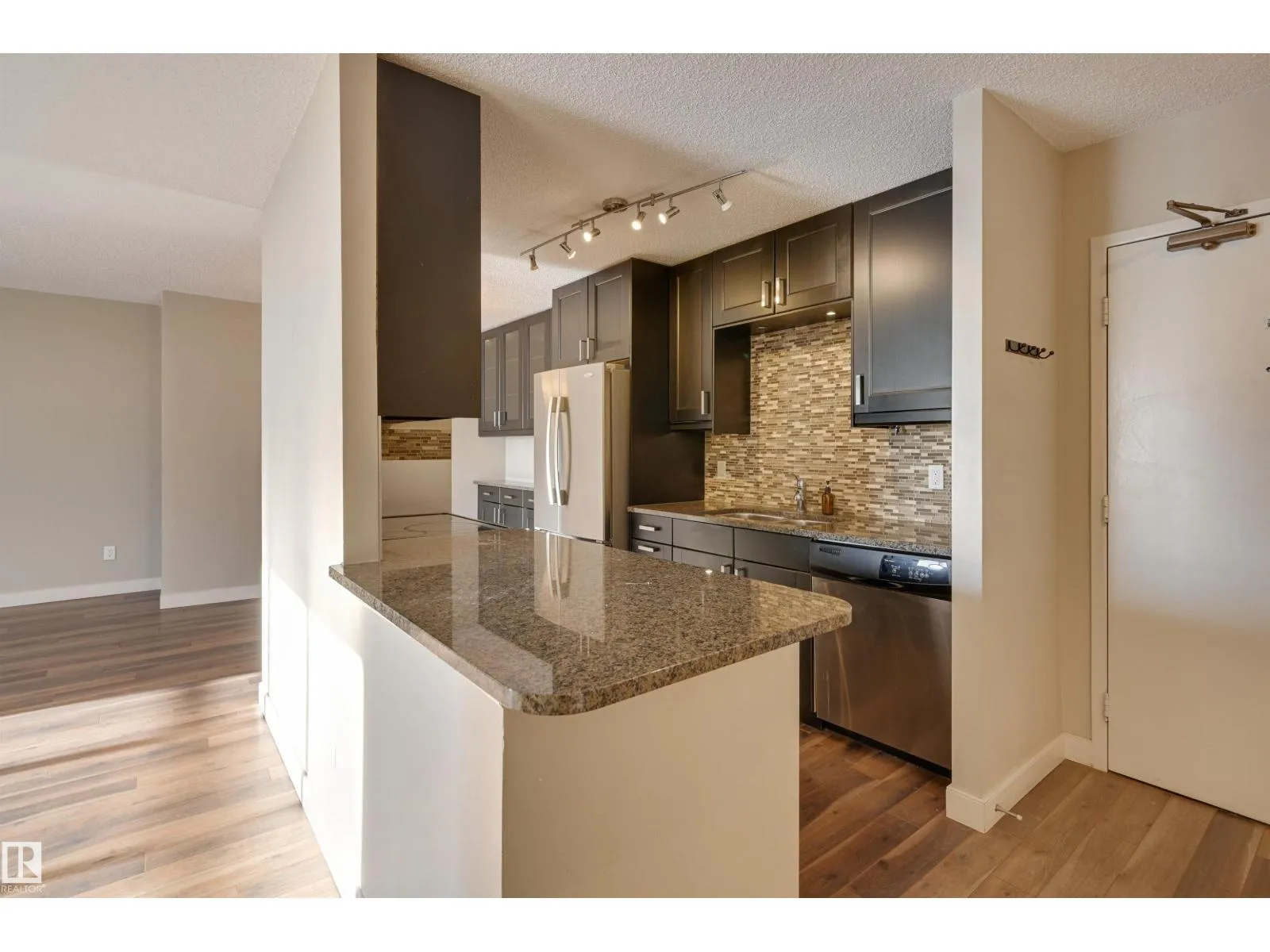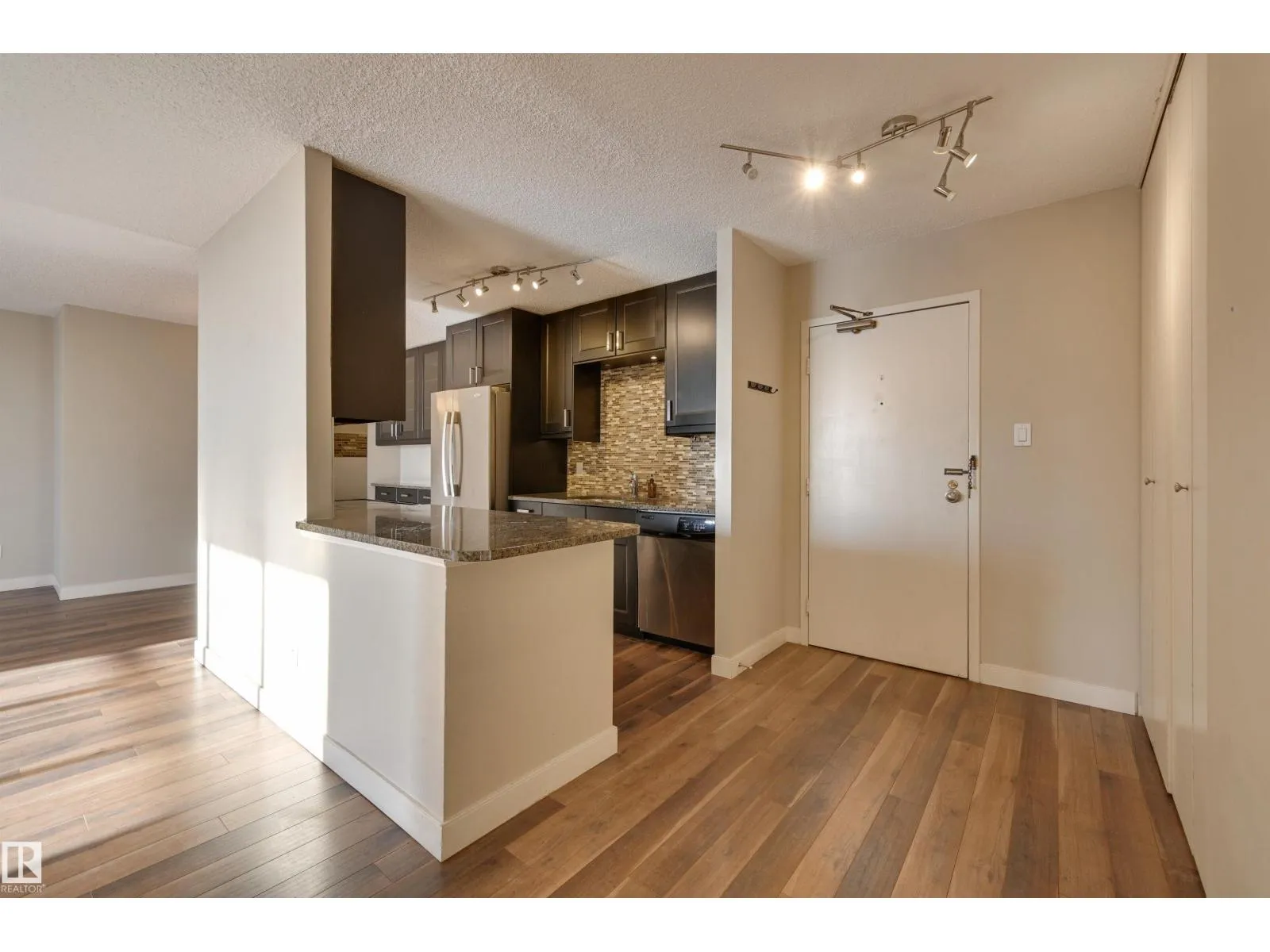 SPECTACULAR RIVER VALLEY VIEW from every window in this BRIGHT, COMPLETELY RENOVATED 1126 sq.ft. 2 bedroom 1.5 bathroom condo in TOP OF THE VALLEY conveniently located with transportation at your doorstep, close to unique shops, restaurants, coffee shops, Art Galleries, the Brewery District, the river valley walking/biking trails & quick access to the U of A. Spacious living room overlooking the river & access to the sunny south facing balcony. The gourmet kitchen is open to the living area with espresso color cabinetry, granite countertops, S/S appliances. The dining room has built-in cabinets. The primary suite is complete with a walk-in closet & a 2 piece bathroom. Spacious 2nd bedroom & a 4 piece bathroom with tile tub surround, new vanity & toilet. Laminate flooring throughout except for tile in the bathrooms. Large storage room. The condo fees include heat, water, power, laundry & underground parking. The building features a completely remodelled exercise room & lobby. Shows very well! (id:27476)