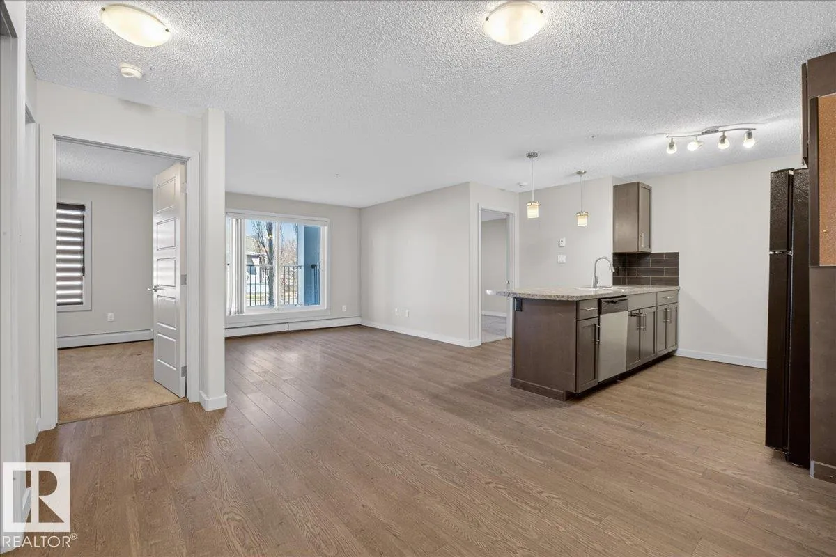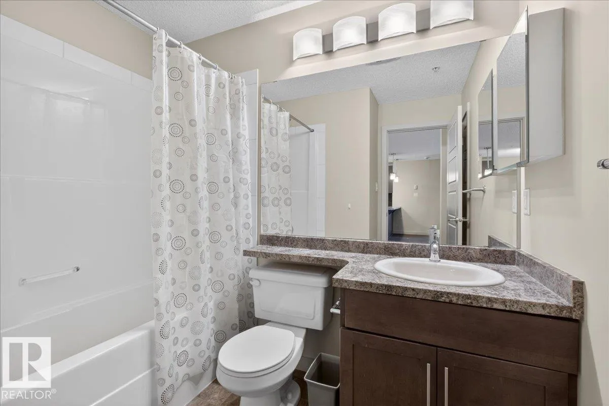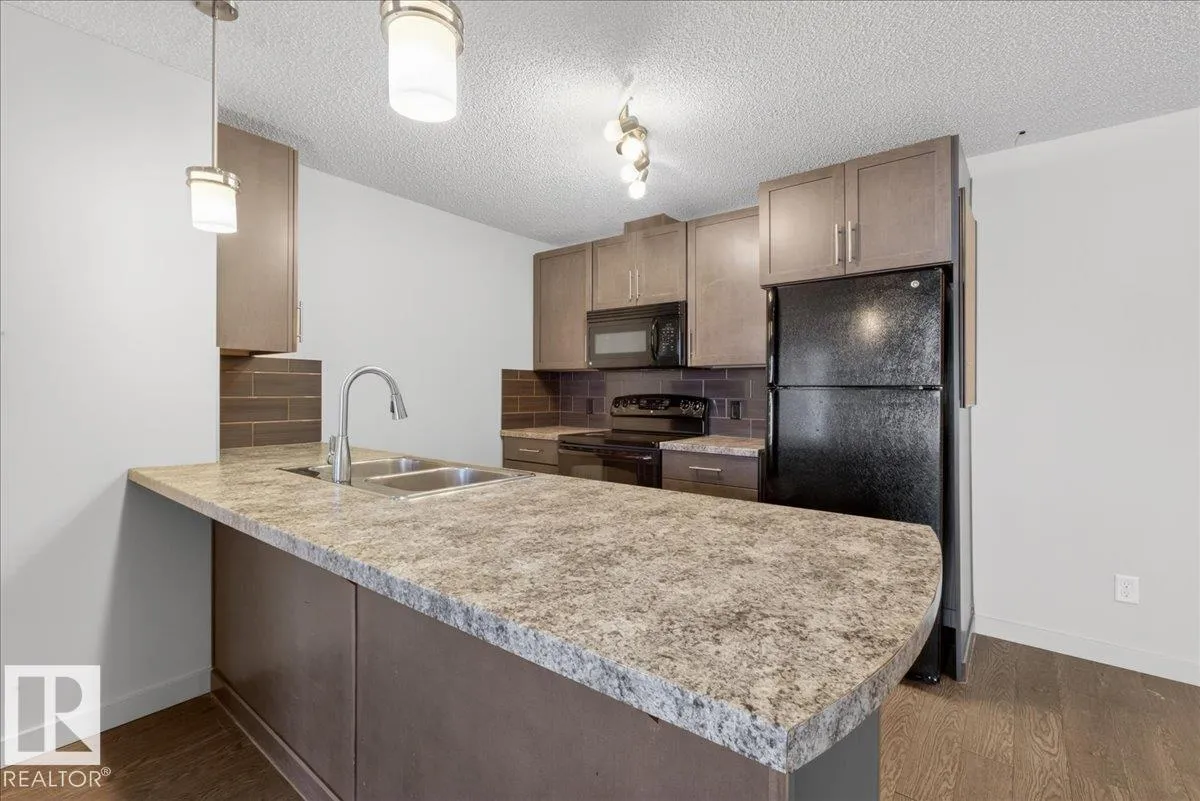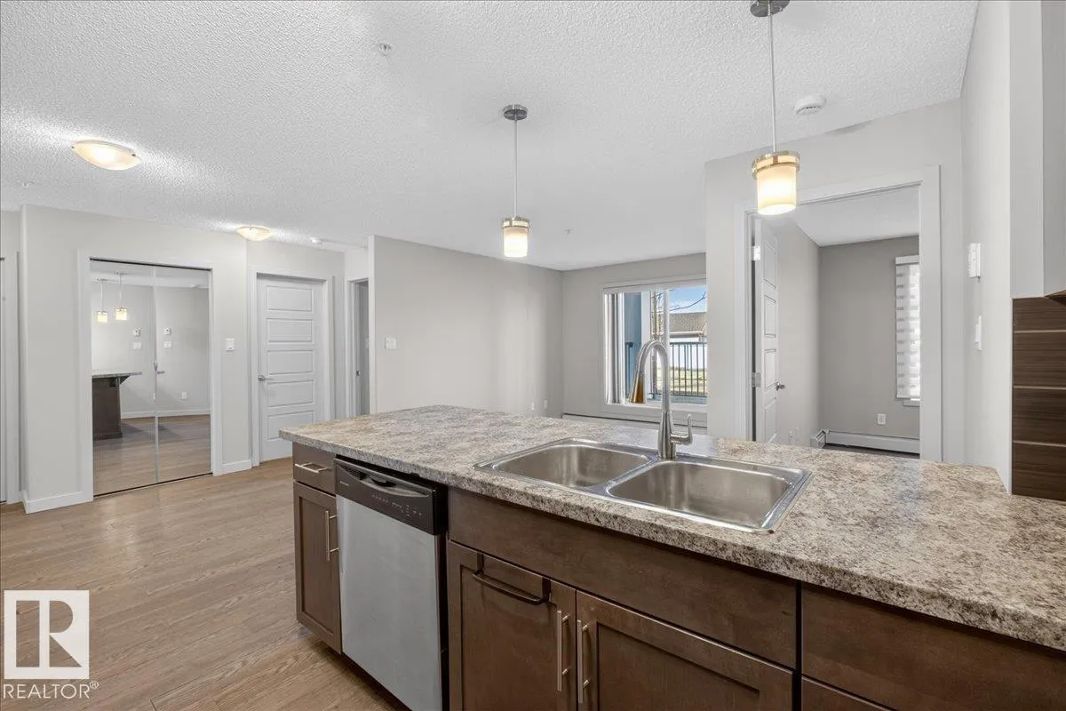 This beautiful 2 bed 2 bath 815 sq ft. condo in the neighborhood of Summerside is a must see! The open concept kitchen, dining room and living room are bright with lots of natural light and feature laminate flooring. The kitchen has rich brown wood cabinetry with tiled backsplash and tons of storage for the home chef. Primary bedroom features carpet flooring, generous walk- in closet, and 3pc en suite bath. This condo also has another well sized carpeted bdrm and a 4pc bath. This amazing condo also has convenient in- suite laundry, air conditioning, nice sized deck to enjoy the fresh air, a titled secure underground parking stall plus bicycle storage, and plenty of additional parking around the building. The building features an exercise room, social room and guest suite. HOA fees include access to Summerside Lake and its amenities! The location offers easy access to parks and green space with walking trails, shopping centres and restaurants, schools, public transit and quick access to the Henday. (id:27476)