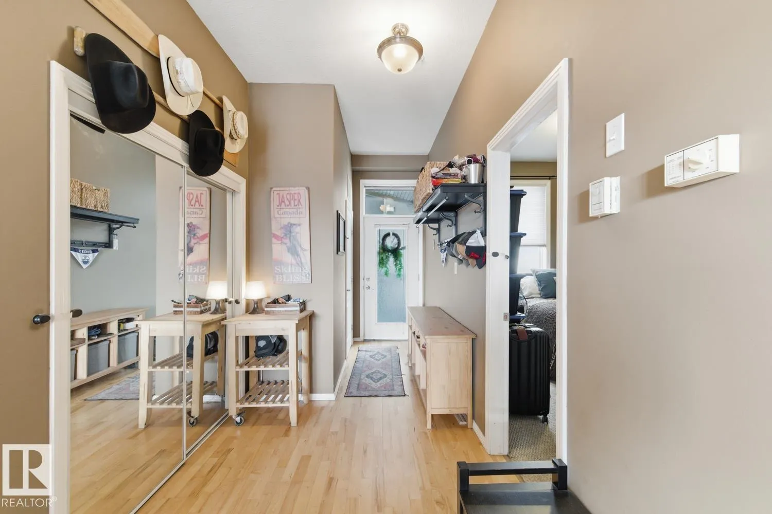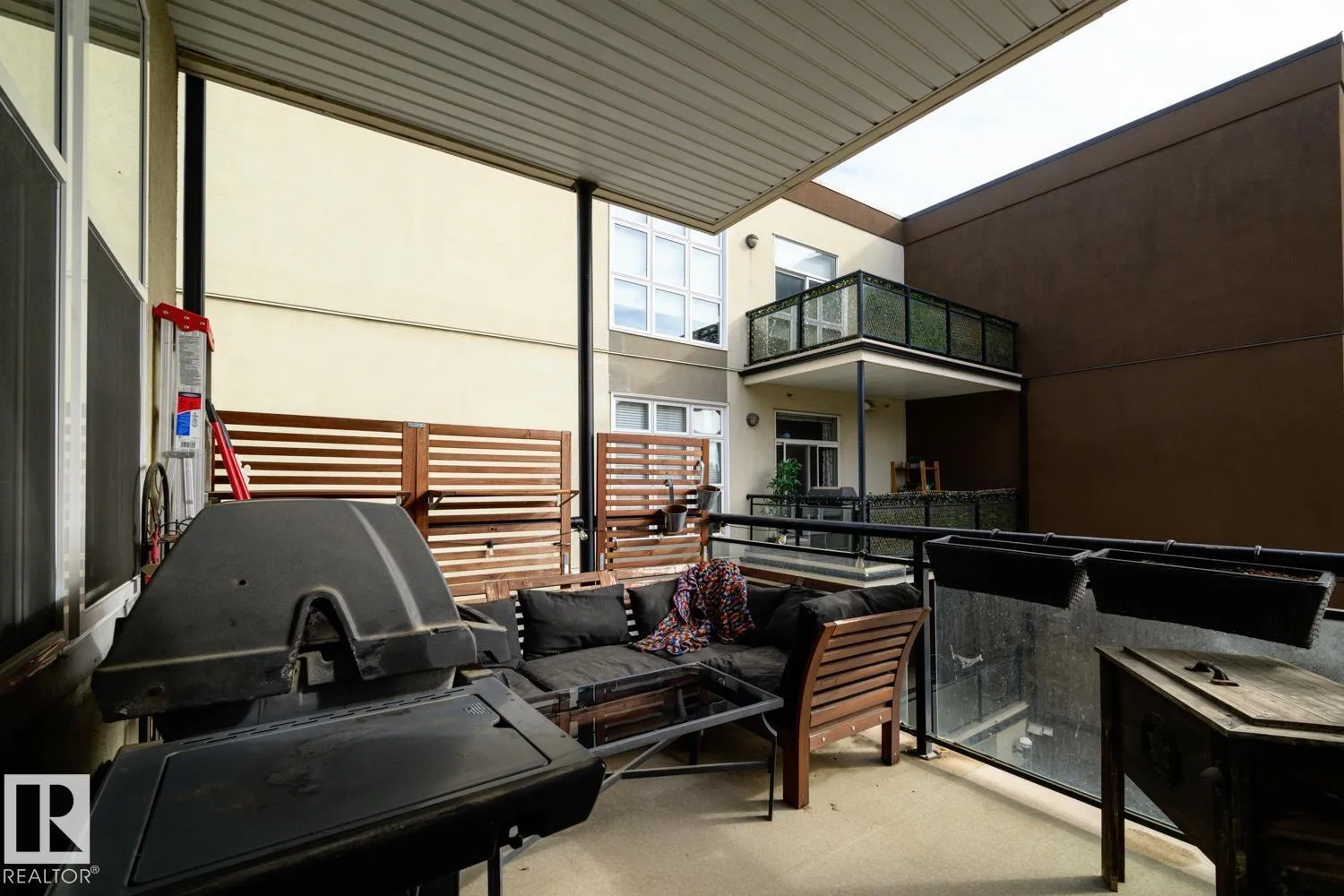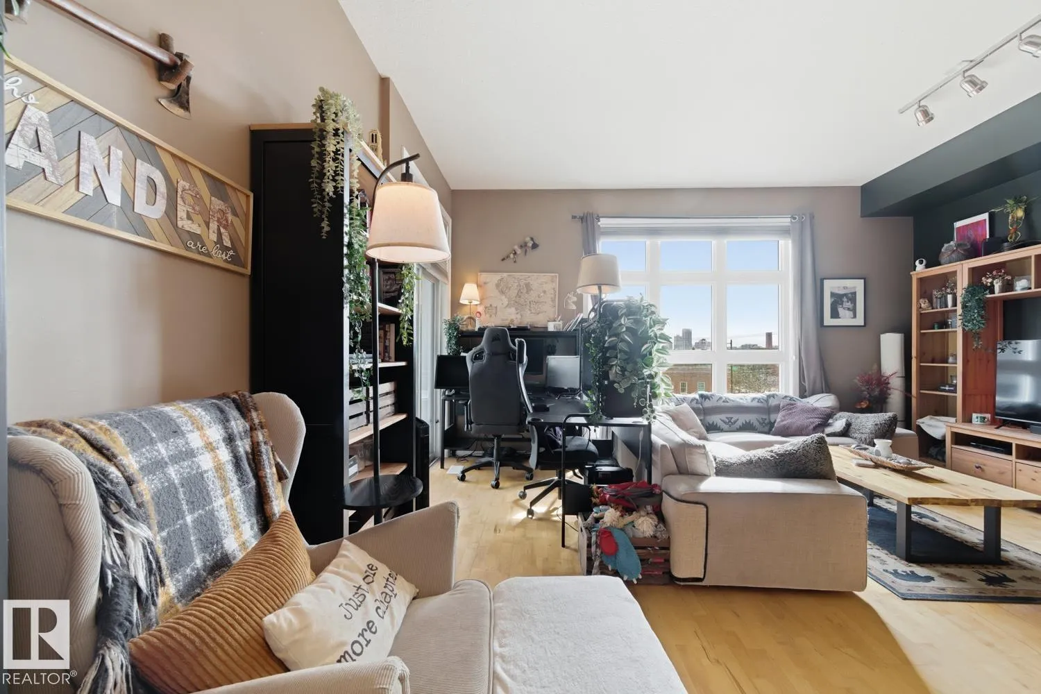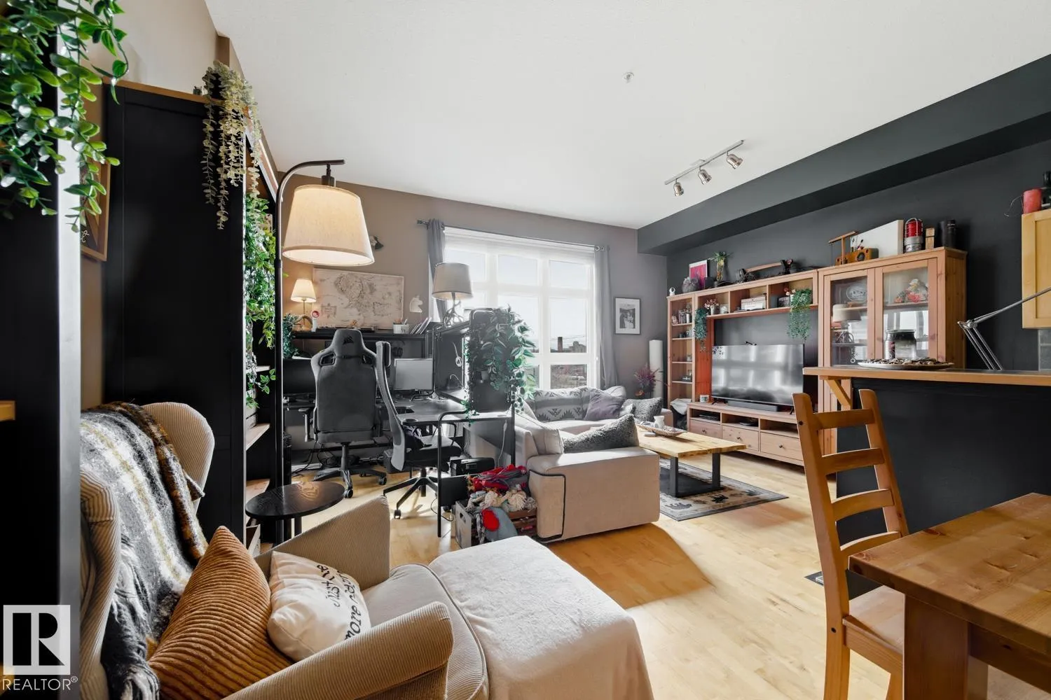 Functional 2-Bedroom in Glenora Gates. This two-bedroom unit offers a straightforward, open-concept layout that makes the most of its footprint. The 10-foot ceilings are the standout feature here, giving the entire home a sense of breathing room that you don't often find in standard builds. A practical setup featuring maple shaker cabinets and a large central island that provides extra prep space and casual seating. Large east-facing windows bring in plenty of morning sun across the main living area. The open floor plan comfortably accommodates a dining area and a living room. It currently handles a full furniture set and a workspace, proving its versatility. The unit is finished with engineered hardwood flooring in the main areas and ceramic tile in the entries and bathroom. Convenient in-suite laundry, and an east-facing balcony. Comes with a heated underground parking stallâa must-have for Edmonton winters. This is a well-kept, lived-in home in a great central location. (id:27476)