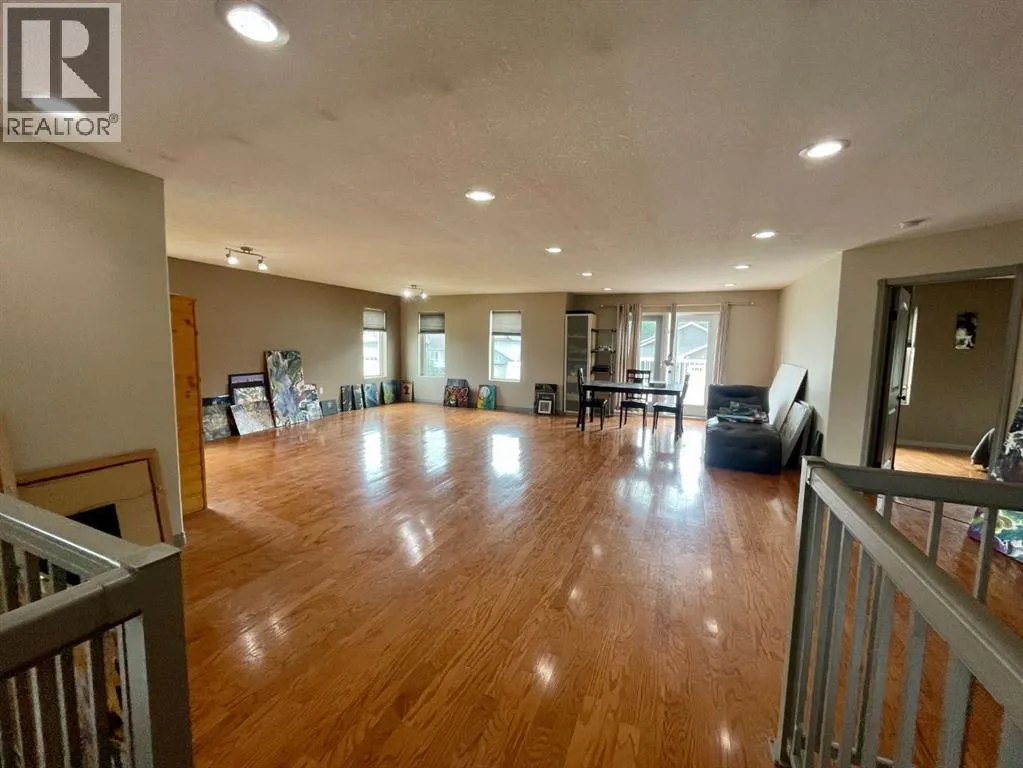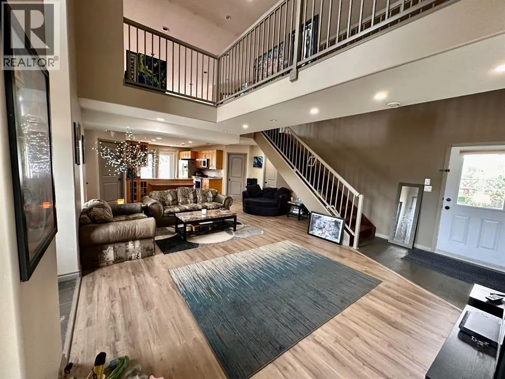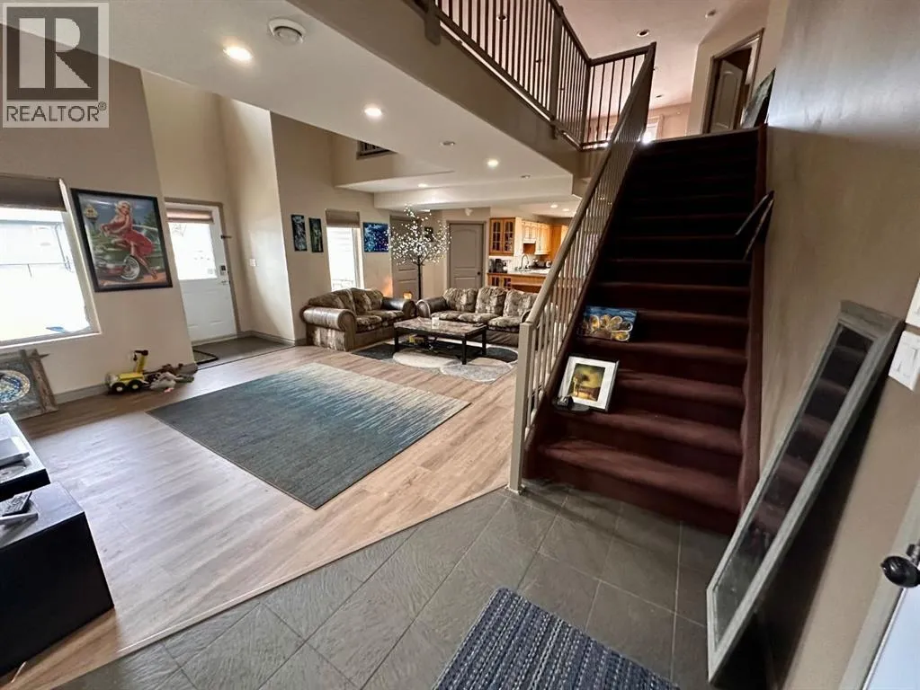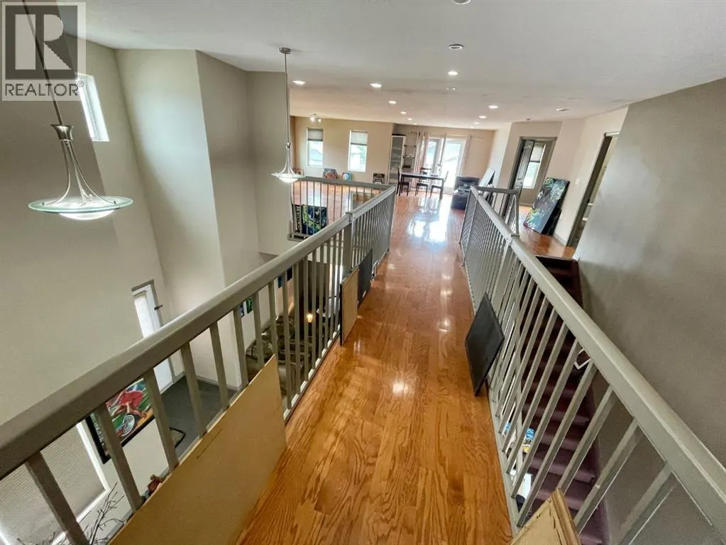 Spacious custom built 5 bedroom, 3 bathroom home located near schools, playgrounds, walking trails, and the new hospital! Home boasts an open concept kitchen and dining area with oak cabinets by Theo and breakfast nook, in-floor heating, triple glazed windows, ceramic tile and engineered hardwood flooring and California knockdown ceilings. Large primary bedroom on main level that features a huge walk in closet and a beautiful ensuite with controlled jetted tub with small tv, lights, and a separate shower with side jets and a waterfall. Upstairs you're greeted by a gigantic living room with French Doors leading to the balcony, bedroom, 4 piece bathroom, and walkway over the main level taking you to the enormous bonus room/bedroom over the garage. 30' x 26' attached heated garage and tonnes of parking. Don't miss your chance to own this one of a kind custom built home located in our family oriented Hillendale Subdivision! (id:27476)