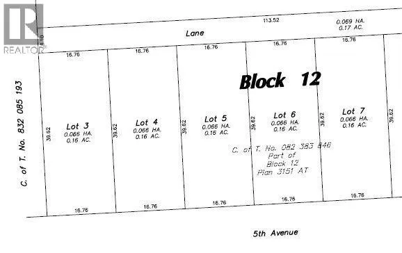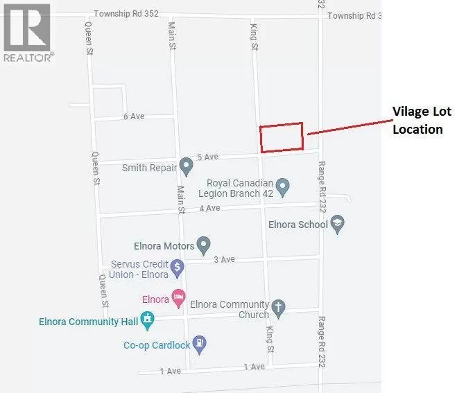 Large lot consisting of 5 parcels, each measuring 55' wide by 130' deep (7150 sq ft each for a total of 35,720 sq ft). Combined lots equal approximately .8 acres.The properties run along 5th Ave and King St. Services can be tied in to lines that run along King St. The alley (not developed) runs across the back from King St. to Princess St. The property is located in the Village of Elnora just east of Highway 21, approximately 45 minutes south east of Red Deer. Elnora is a quiet little Village where kids can play and you do not need to worry about them. The K-8 school is one block south on Princess St. (id:27476)