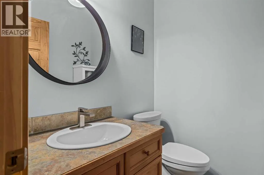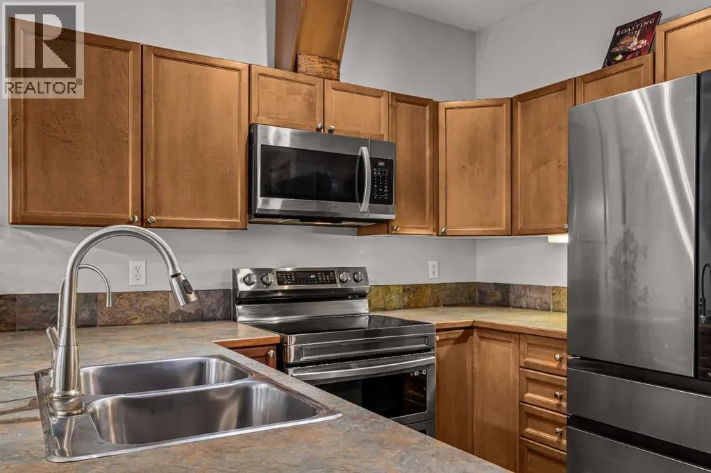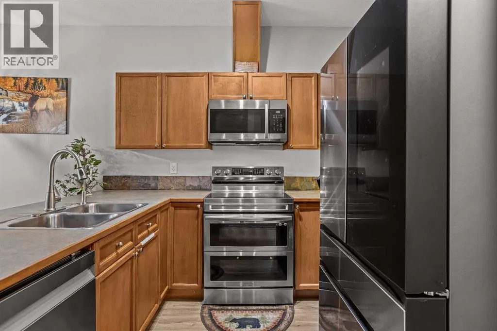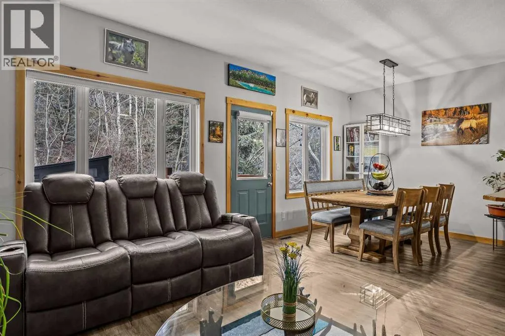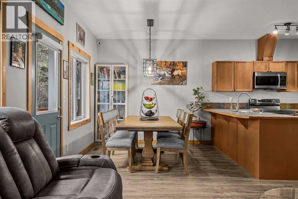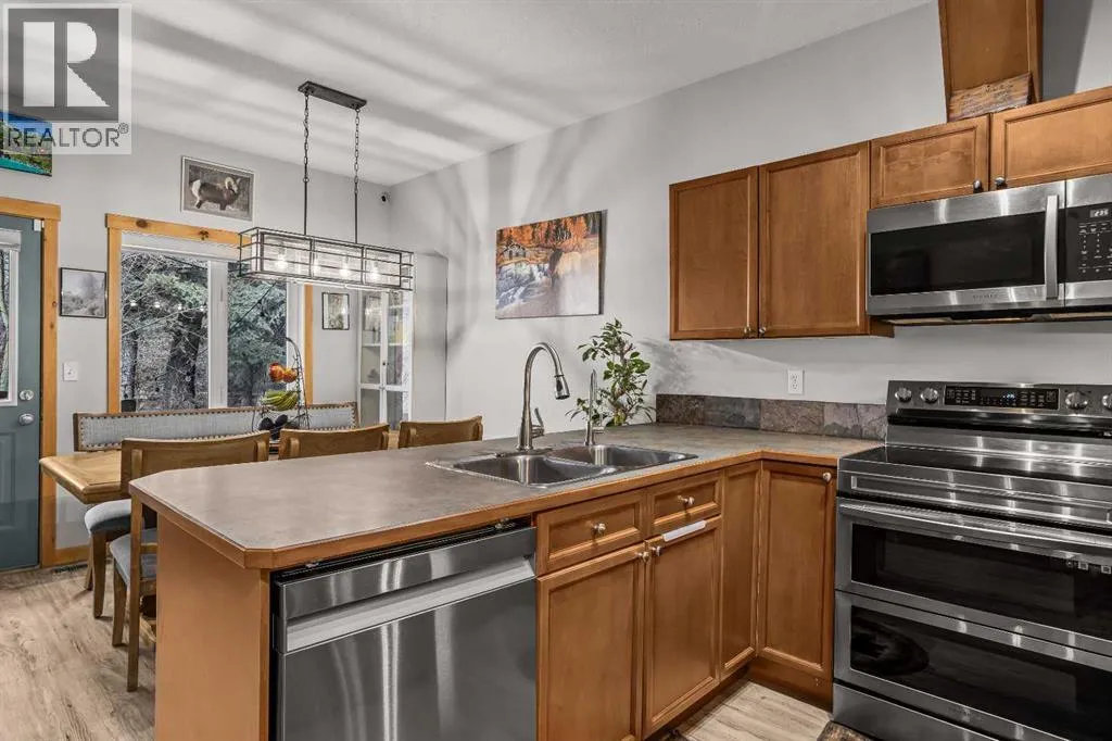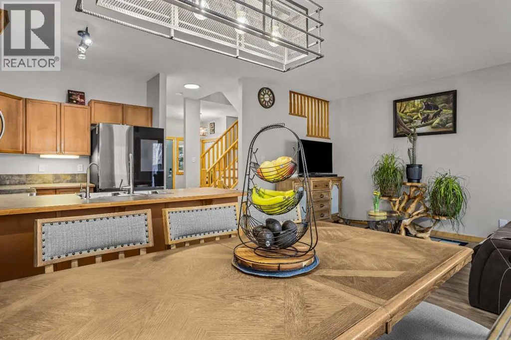 Welcome to mountain living in the charming hamlet of Exshaw, just 10 minutes from Canmore and surrounded by endless hiking, biking, and outdoor adventure. Offering over 1,800 SF, this well-appointed 3 bed, 3 bath townhome blends comfort, functionality, and lifestyle with an attached garage, convenient driveway parking, and a charming front porchâan ideal spot to enjoy your morning coffee while taking in the mountain views. Step inside to a spacious foyer that opens into a bright, open-concept main floor. The kitchen is beautifully updated with new Samsung Bespoke stainless steel appliances and a large peninsula island, flowing effortlessly into the dining and living areasâgreat for both everyday living and entertaining. From here, step out to your fully fenced backyard backing onto private greenspace with no rear neighbors, perfect for pets, summer evenings, and unwinding in nature. Retractable screens on exterior doors invite in the fresh mountain air, while brand new A/C keeps things cool on warmer days. Upstairs, a generous guest bedroom with dual closets and mountain views offers flexible space for family or visitors, along with a 4-piece bath and brand new washer/dryer. The primary suite provides a peaceful retreat with a walk-in closet, beautifully updated ensuite with tiled glass shower, and a Juliet balcony. The lower level adds even more versatility with a spacious rec room, third bedroom, full bath, and second laundryâideal for guests, movie nights, or added flexibility. With low condo fees and a low-maintenance lifestyle, this is an ideal full-time home or mountain escape. (id:27476)