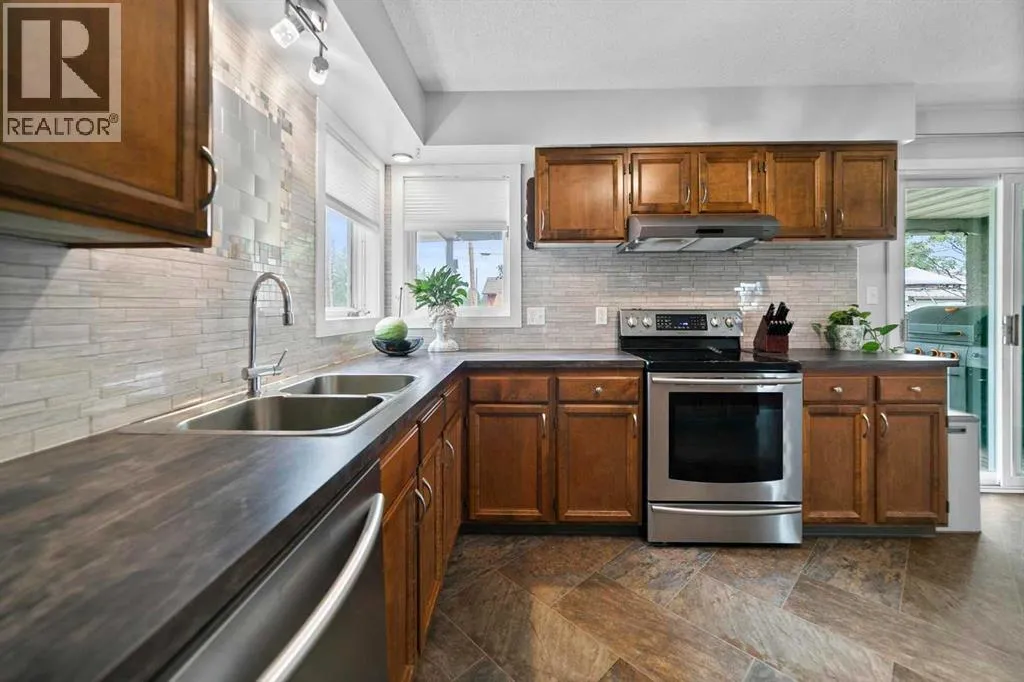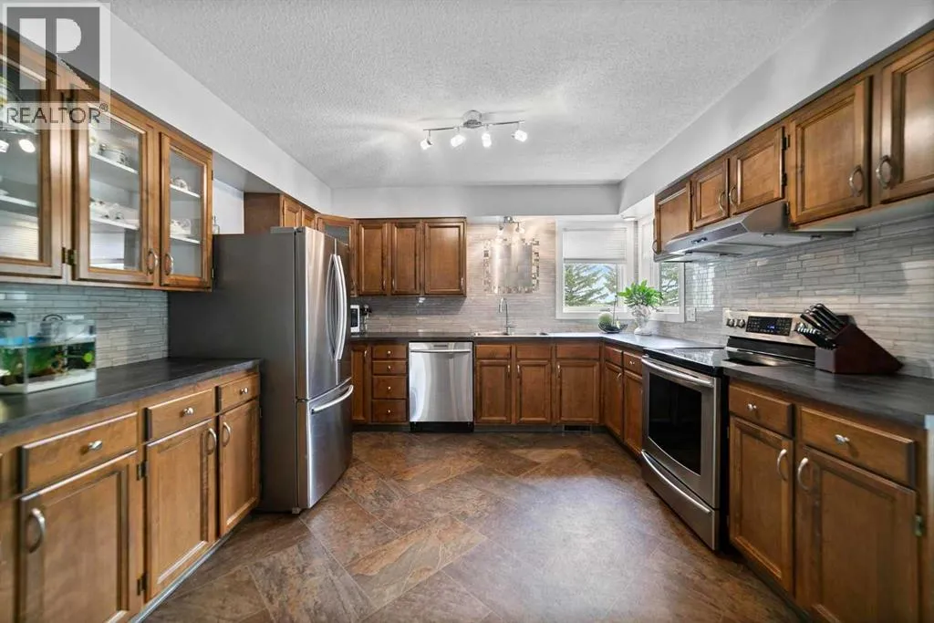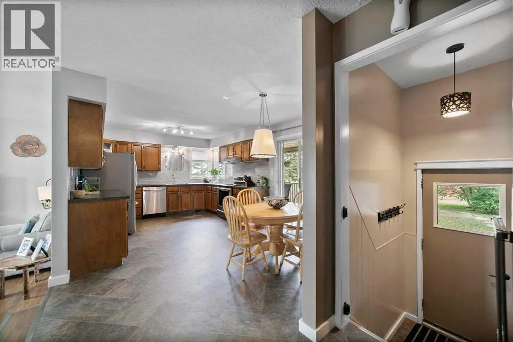 Nicely updated and maintained family home sitting on a corner lot siding farmlands with amazing views! This 5 bedroom, 2 bath bungalow is spacious with a massive updated kitchen/dining area. Right off of the dining area is a sliding patio door leading to a large covered deck. The sunken living room is bright and airy, well laid out with a bay window. The main bath was renovated with a walk-in shower as well as a nice soaker tub. To top it all of the laundry is on the main floor for convenience. The basement is mostly finished (some flooring to be laid) with a sunken family room 2 bedrooms and a 3pc bath. Shingles were replaced in 2022, newer HE furnace and hot water tank. (id:27476)