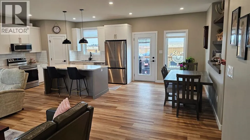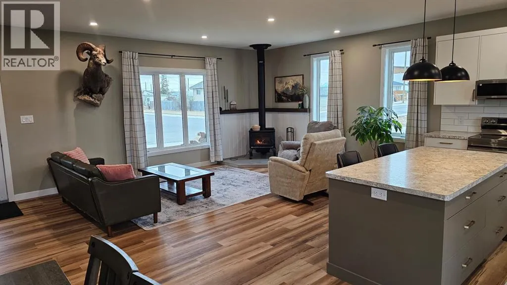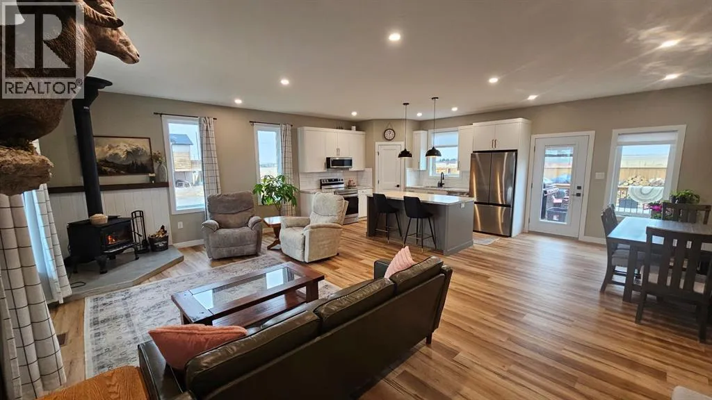 This move-in ready 4 bedroom, 2 bathroom home offers a bright open-concept layout perfect for modern living. The stylish kitchen features white cabinetry, stainless steel appliances, a large island with seating, and pendant lighting, flowing seamlessly into the spacious living area with beautiful flooring and a cozy wood stove. All four bedrooms are well-sized, complemented by two full bathrooms for added convenience. Outside, enjoy attractive curb appeal with a covered front porch, landscaped yard, and a spacious drivewayâideal for comfortable everyday living and easy entertaining. (id:27476)
