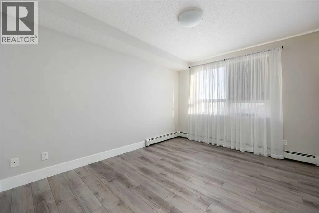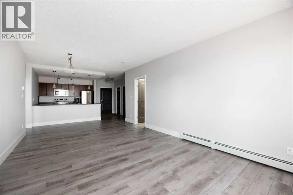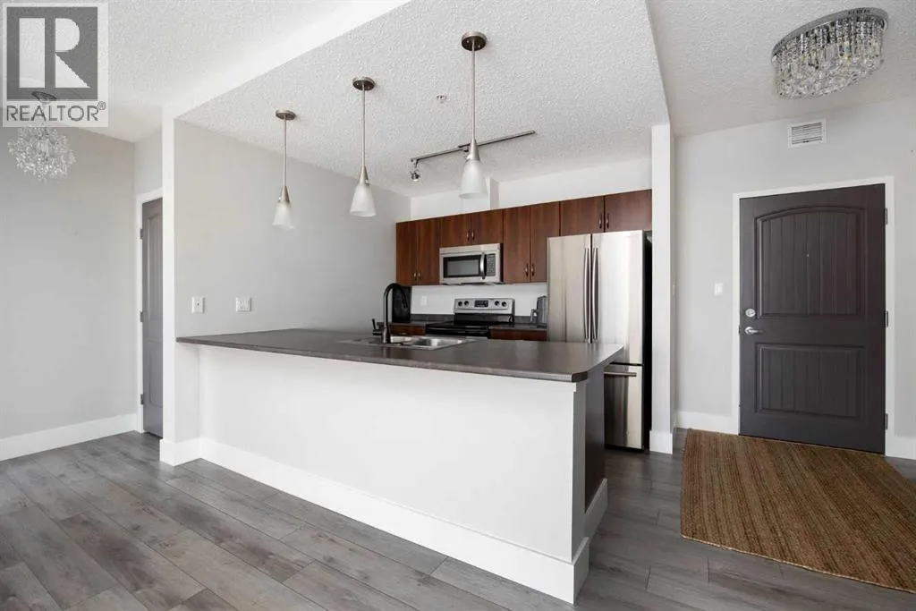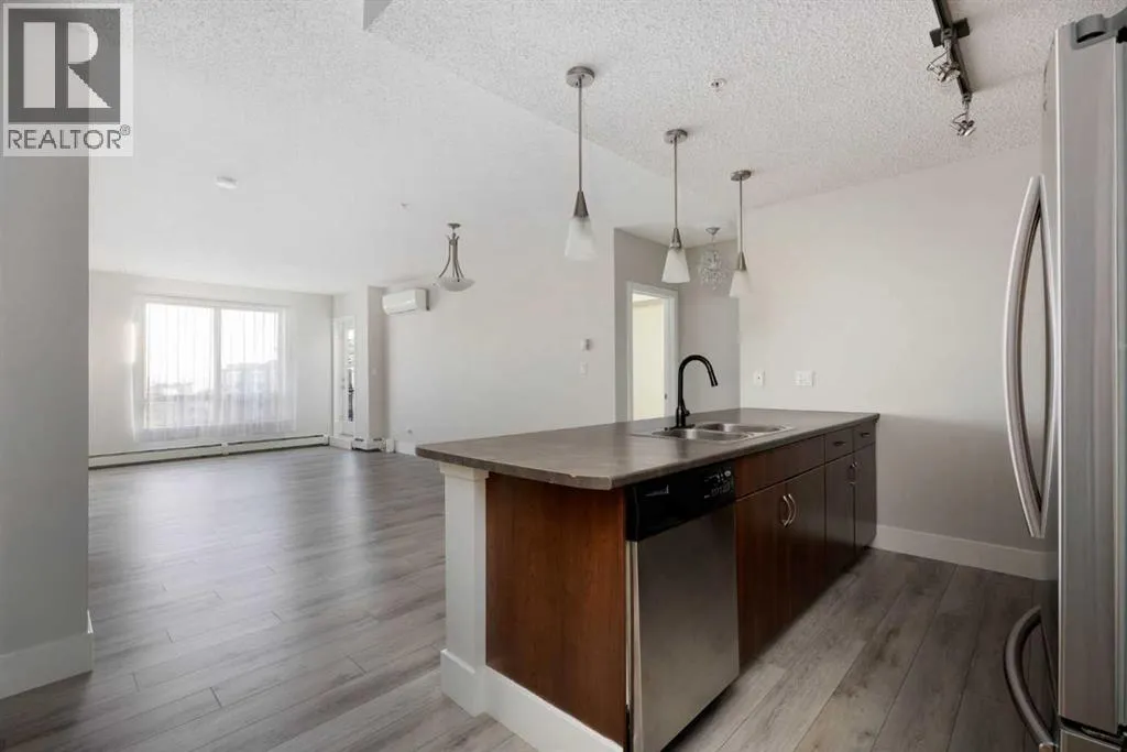 Gorgeous top floor unit at the Peaks! This updated, two bedroom unit with stunning laminate flooring, brand new carpet, new updated ensuite bathroom with stunning tile, and an eye catching vanity with tons of storage. The primary walk through closet has been transformed with custom built ins for better functionality and design. This unit comes with two large bedrooms, two full bathrooms, a laundry room with additional storage, plus the kitchen and living area is bright, modern and inviting for any new owners needs or style. Bonus features such as updated lighting, A/C, BBQ gas hook up, two titled parking stalls, one surface and one underground, as well as a large storage locker located in a separate secure room. This concrete condo building has security cameras, is always well maintained, has a car wash bay in the underground parking, a gym, and social room. There is also a community playground, and is located walking distance to schools, shopping, walking trails, restaurants and bus routes. Are you looking for low maintenance, modern styling, secure living, and centrally located? Call to view this beautiful unit today! (id:27476)