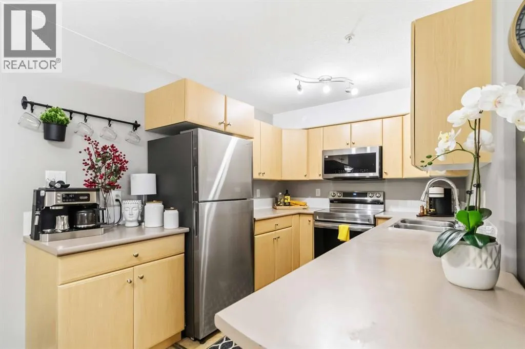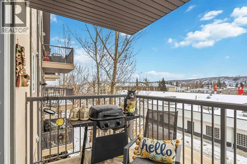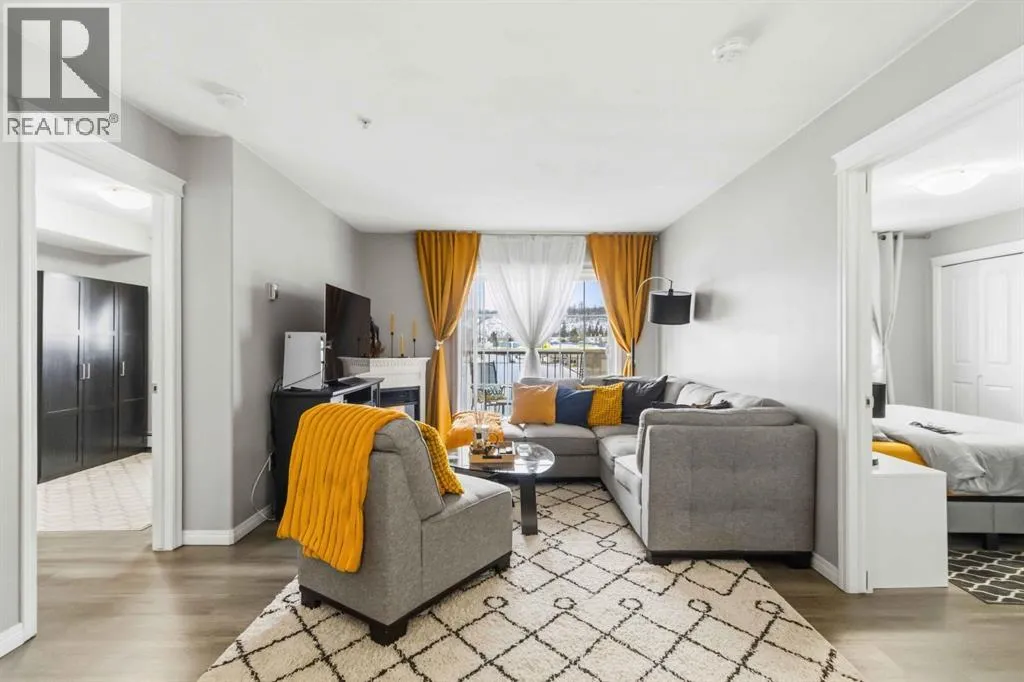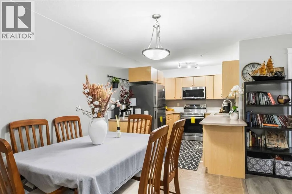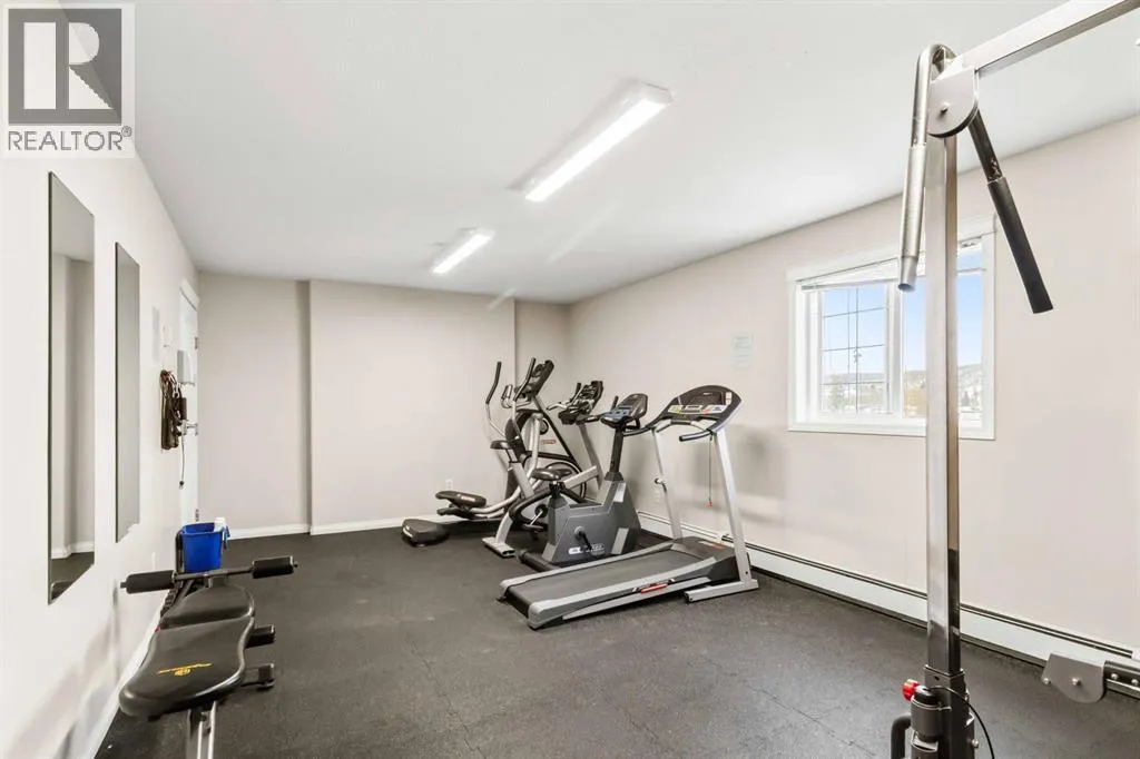 Welcome to this beautifully maintained 2 bedroom, 2 bathroom condo in Rundlestone Estates, a well managed and impeccably clean building centrally located downtown, just steps from shopping, restaurants, schools, walking trails, and more. This open concept unit is located on the same floor as the buildingâs gym, offering both convenience and accessibility. Inside, youâll find fresh neutral paint, no carpet, and brand new stainless steel appliances (2025), along with a new kitchen faucet and thoughtful touches throughout. The kitchen offers ample cabinetry, new appliances, and a convenient coffee station, while the dining area comfortably fits a six seat table (which can stay if desired). The spacious living room features a cozy corner fireplace and access to a private balcony. The primary bedroom includes two closets and a full ensuite, while the second bedroom is privately situated on the opposite side of the unit, adjacent to the second full bathroom perfect for guests or a home office. This unit also comes with one underground parking stall (#312) located just steps from the elevator, plus access to 40+ visitor parking stalls on both the north and south sides of the building. Condo fees include heat and water, and the unit can be sold partly furnished. This is a rare opportunity to own a move in ready condo that truly has it all. Book your showing today, this one wonât last. (id:27476)