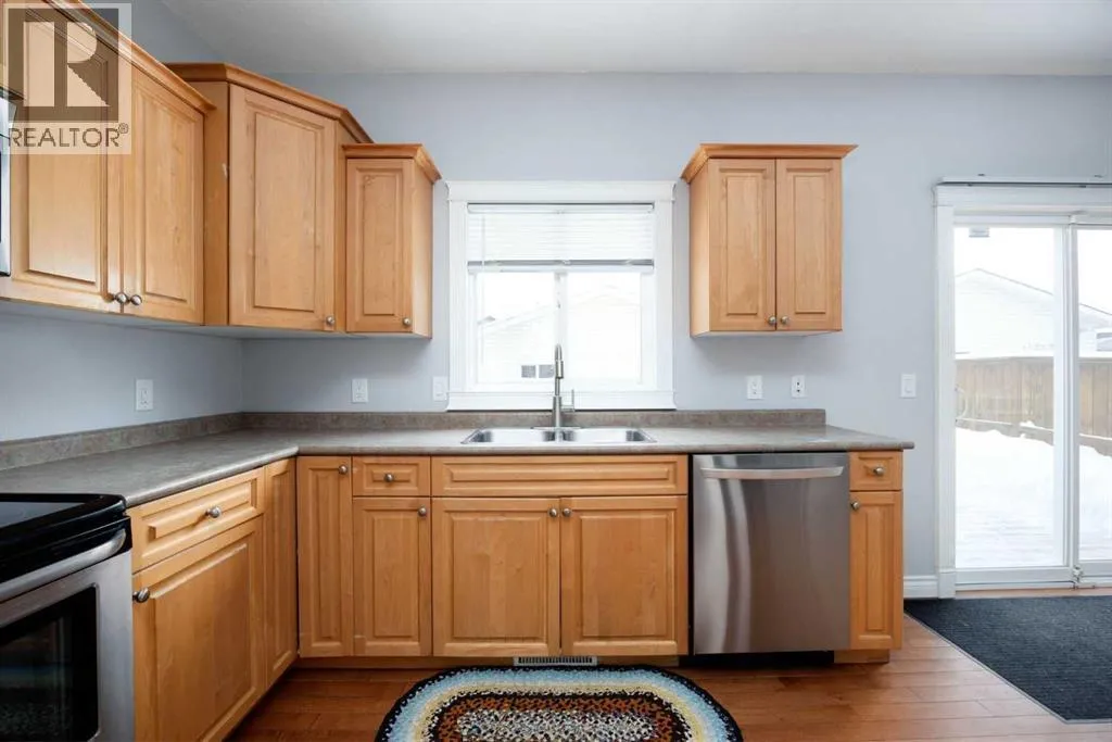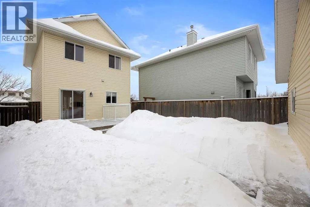 Welcome to this charming 2-storey single-family detached home tucked away on a quiet crescent in the mature community of Timberlea, offering the perfect blend of comfort, functionality, and everyday appeal. With inviting curb presence, a front yard and a fully fenced backyard, plus convenient back alley access just 1 door down, this property is designed for easy living. Step inside to a bright and open living room featuring a beautiful bay window and cozy electric fireplace, creating a warm and welcoming space to gather. The dining area flows seamlessly into the spacious kitchen, complete with hardwood flooring, walk-in pantry, stainless steel appliances, and a brand new dishwasher (2024), while patio doors off the dining room lead to a large deck overlooking the backyard - ideal for summer BBQs and relaxing evenings around the fire pit. The main floor also offers a convenient half bathroom for guests. Upstairs, luxury vinyl plank (LVP) flooring runs throughout 3 generous bedrooms, including a very spacious primary bedroom highlighted by 2 large windows that flood the room with natural light, a ceiling fan for added comfort, and a walk-in closet with built-in shelving. The full bathroom features a double vanity and a tub/shower combination with access from both the hallway and directly from the primary bedroom, offering thoughtful functionality for busy mornings. The fully developed basement adds even more living space with a rec room accented by crown molding, a full bathroom with a tiled tub/shower combination, and a laundry area featuring washer and dryer (both updated in 2023). Comfort is top of mind with air conditioning and a hot water tank updated in 2023. Outside, the OVERSIZED DOUBLE DETACHED GARAGE is heated, painted, insulated, includes built-in shelving and is accessed from the back alley, providing ample parking and workspace year-round. Located close to schools, parks, and everyday amenities, this home offers exceptional value in an established neighbo urhood. Whether youâre upsizing, downsizing, or buying your first home, this Timberlea gem is ready to welcome you. (id:27476)