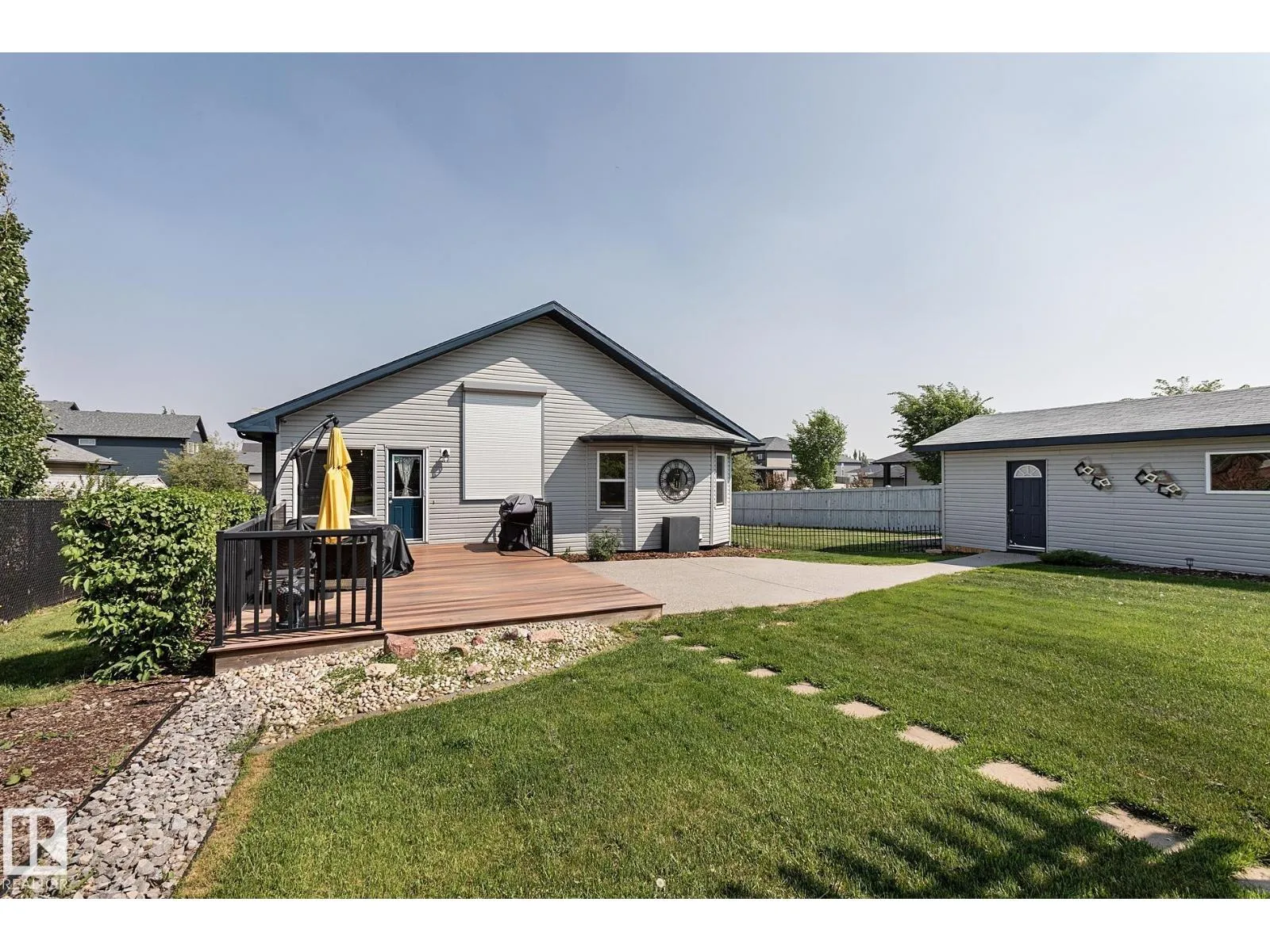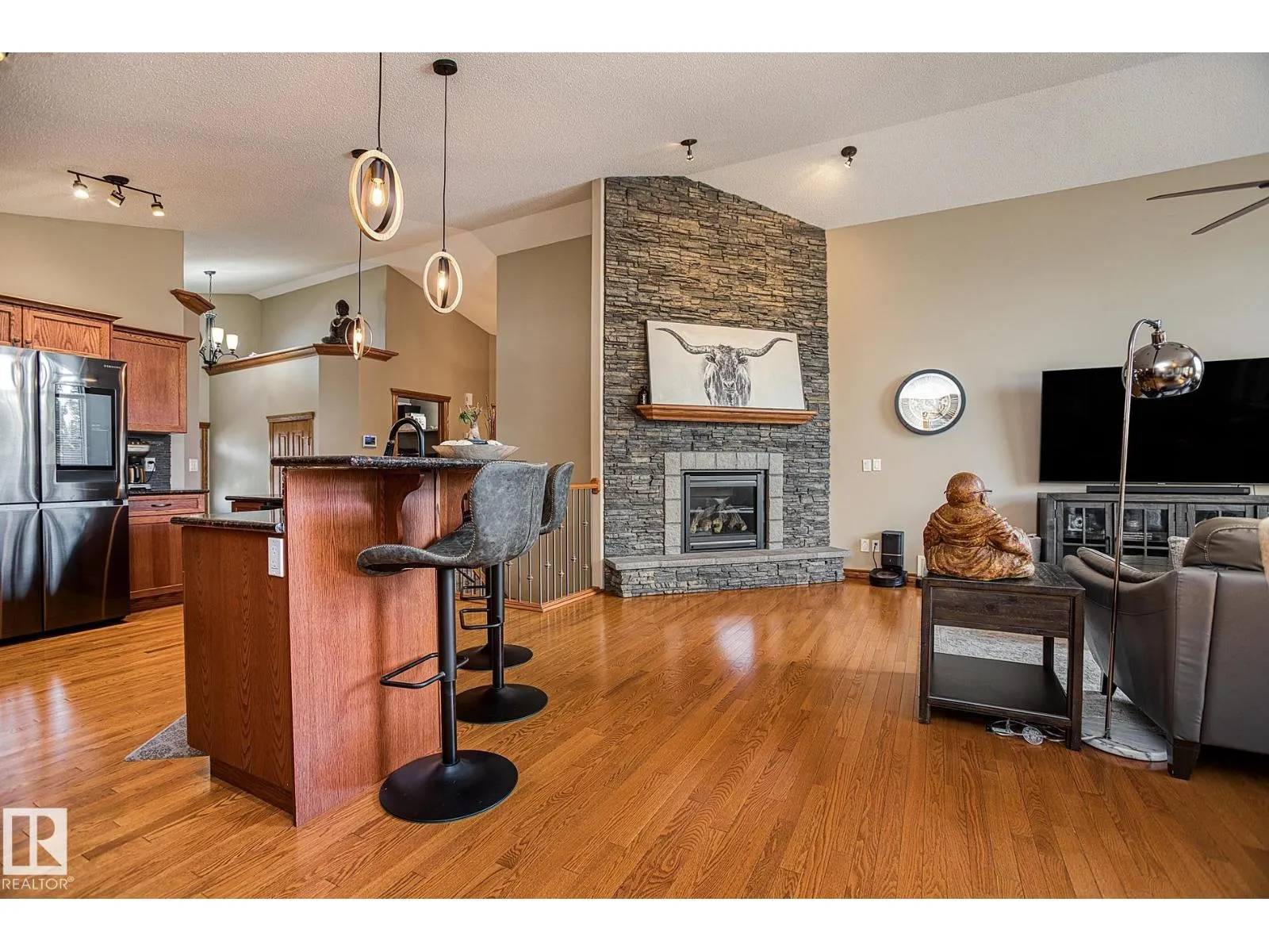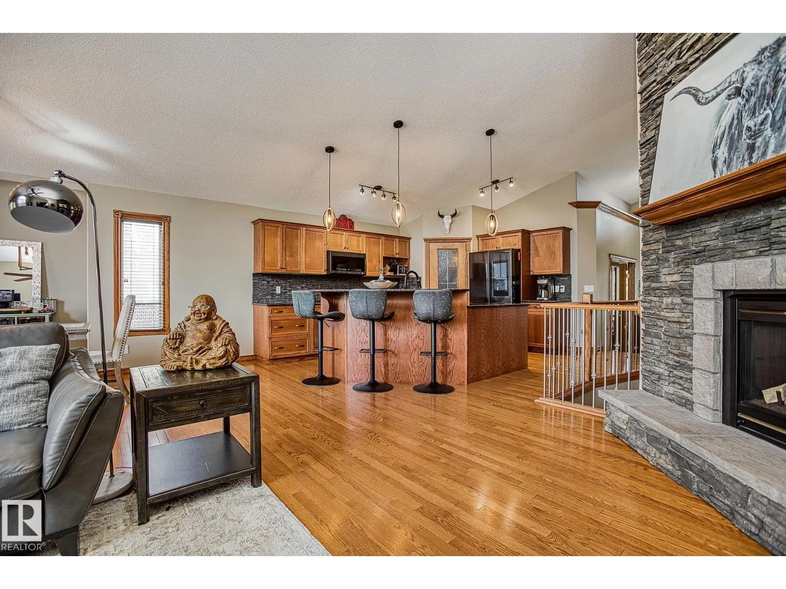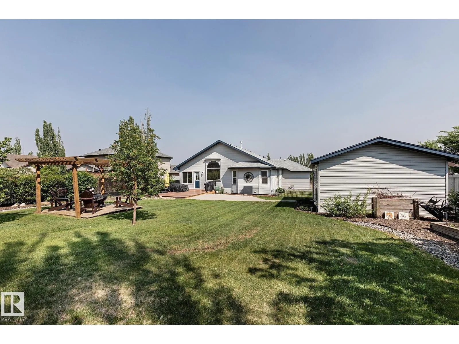 TRIPLE GARAGE-BUNGALOW on 1/3 ACRE LOT! Welcome to this immaculate 1757 sq ft bungalow in sought-after Southfort Estates! Situated on a fully landscaped 1/3-acre lot, this home blends comfort and elegance with vaulted ceilings, hardwood floors, and two cozy gas fireplaces. Natural light fills the open-concept layout, leading to a chef-inspired kitchen with NEW black stainless steel appliances with smart hub fridge, stylish cabinetry, and generous counter space. The dining area opens to the Backyard Oasis including a Fire Pit, Shed that can fit a car, & composite deckâideal for entertaining and soaking up the sun's rays. The luxurious primary suite features vaulted ceilings, a walk-in closet, and a spa-like ensuite. The basement is partially finished with a spacious rec room, additional bedroom, and full bathâoffering flexible living space & tonnes of storage. Not to be missed - Main floor den, remote window shutter, tile accents, central vac. garage with Radiant Heating. Flexible possession. A true gem! (id:27476)
