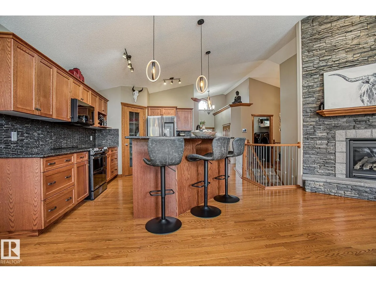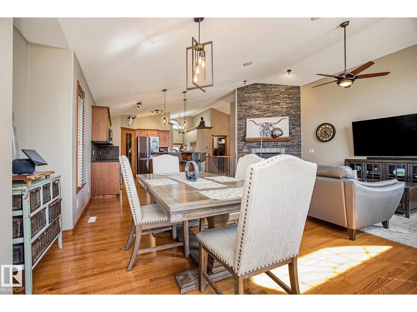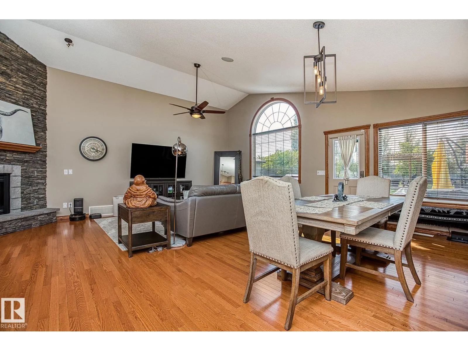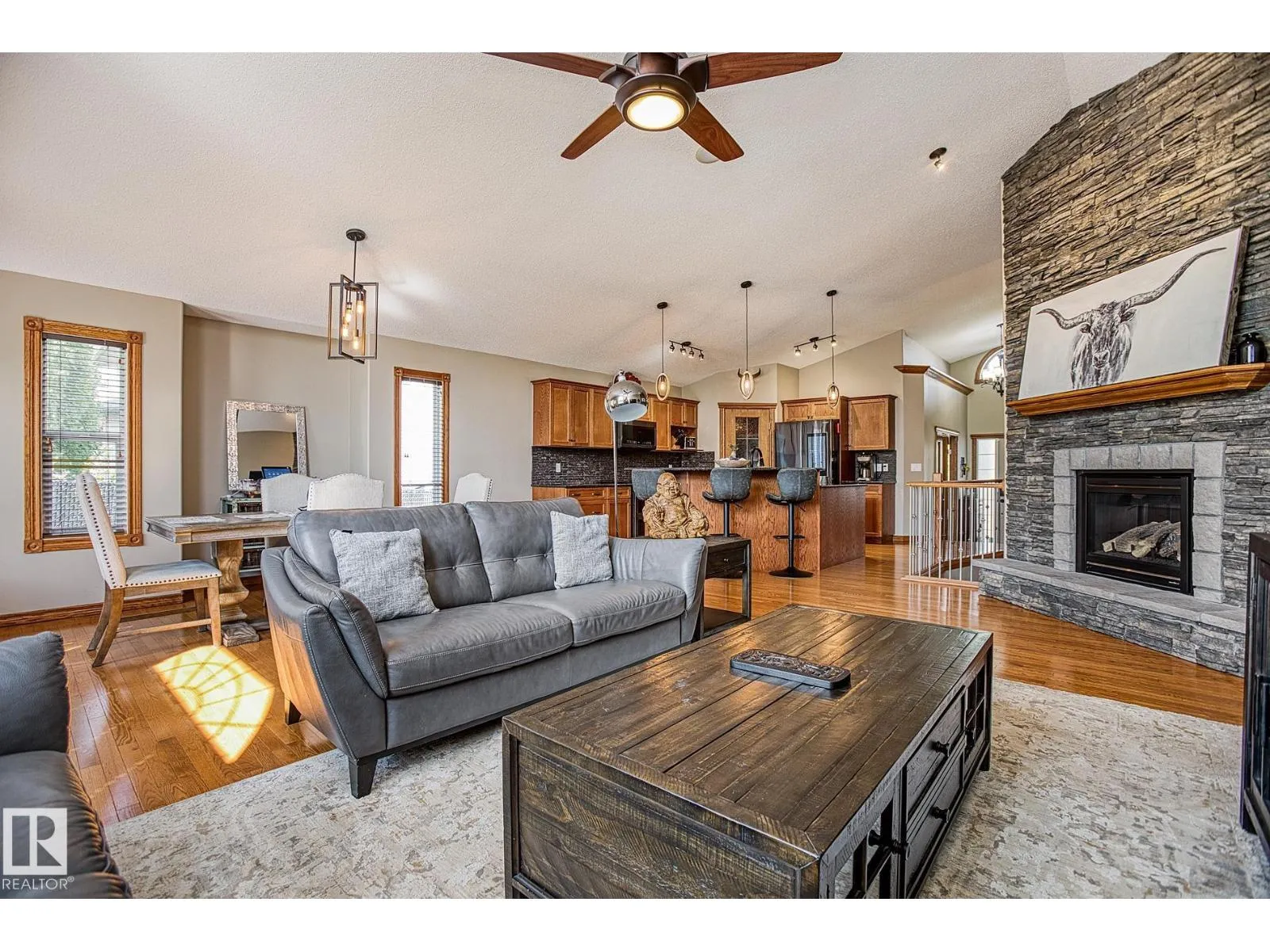 TRIPLE GARAGE-BUNGALOW on 1/3 ACRE LOT! Welcome to this immaculate 1757 sq ft bungalow in sought-after Southfort Estates! Situated on a fully landscaped 1/3-acre lot, this home blends comfort and elegance with vaulted ceilings, hardwood floors, and two cozy gas fireplaces. Natural light fills the open-concept layout, leading to a chef-inspired kitchen with NEW black stainless steel appliances with smart hub fridge, stylish cabinetry, and generous counter space. The dining area opens to the Backyard Oasis including a Fire Pit, Shed that can fit a car, & composite deckâideal for entertaining and soaking up the sun's rays. The luxurious primary suite features vaulted ceilings, a walk-in closet, and a spa-like ensuite. The basement is partially finished with a spacious rec room, additional bedroom, and full bathâoffering flexible living space & tonnes of storage. Not to be missed - Main floor den, remote window shutter, tile accents, central vac. garage with Radiant Heating. Flexible possession. A true gem! (id:27476)
