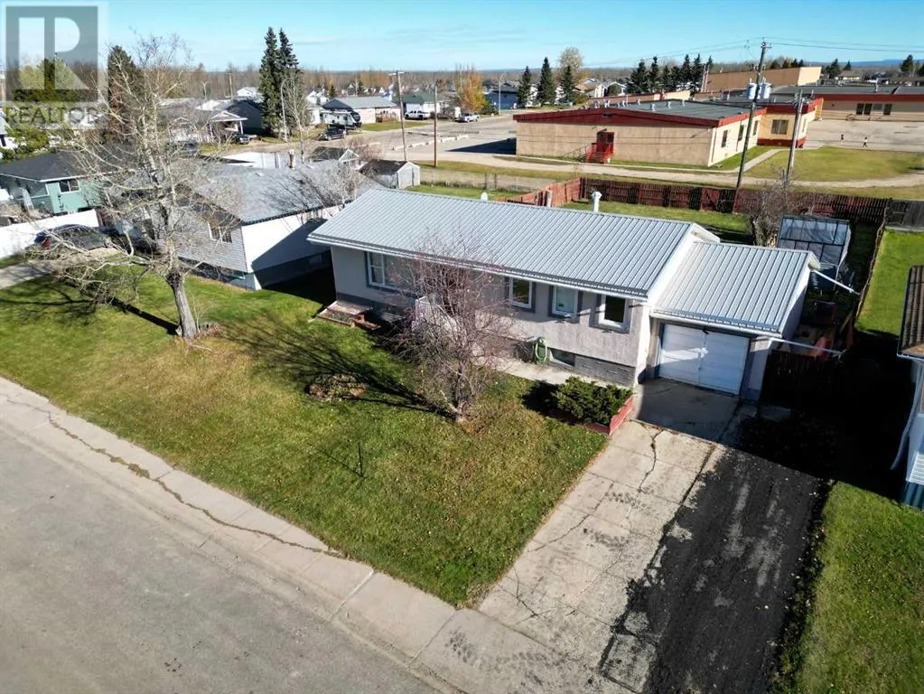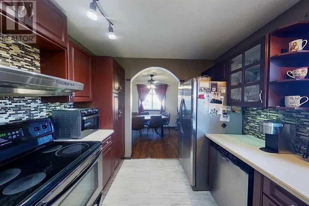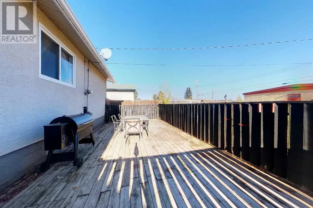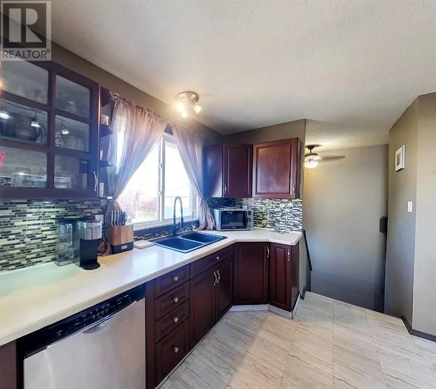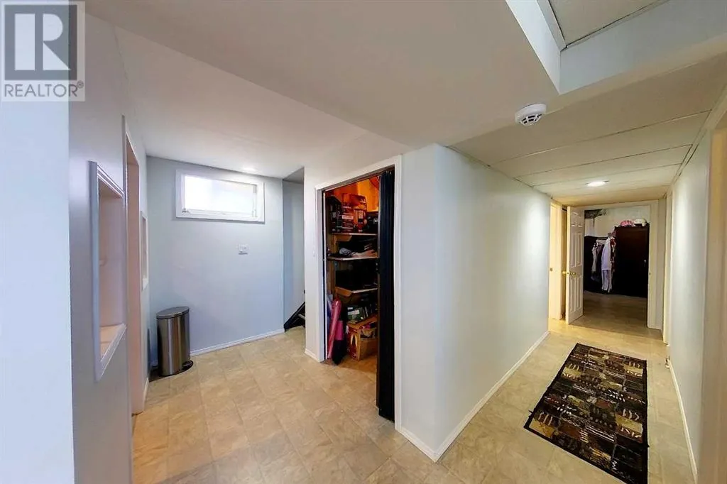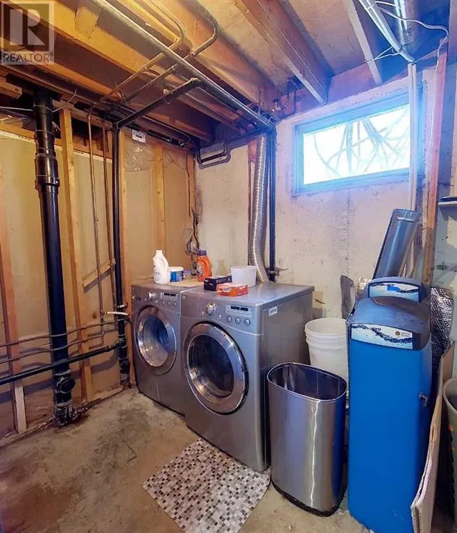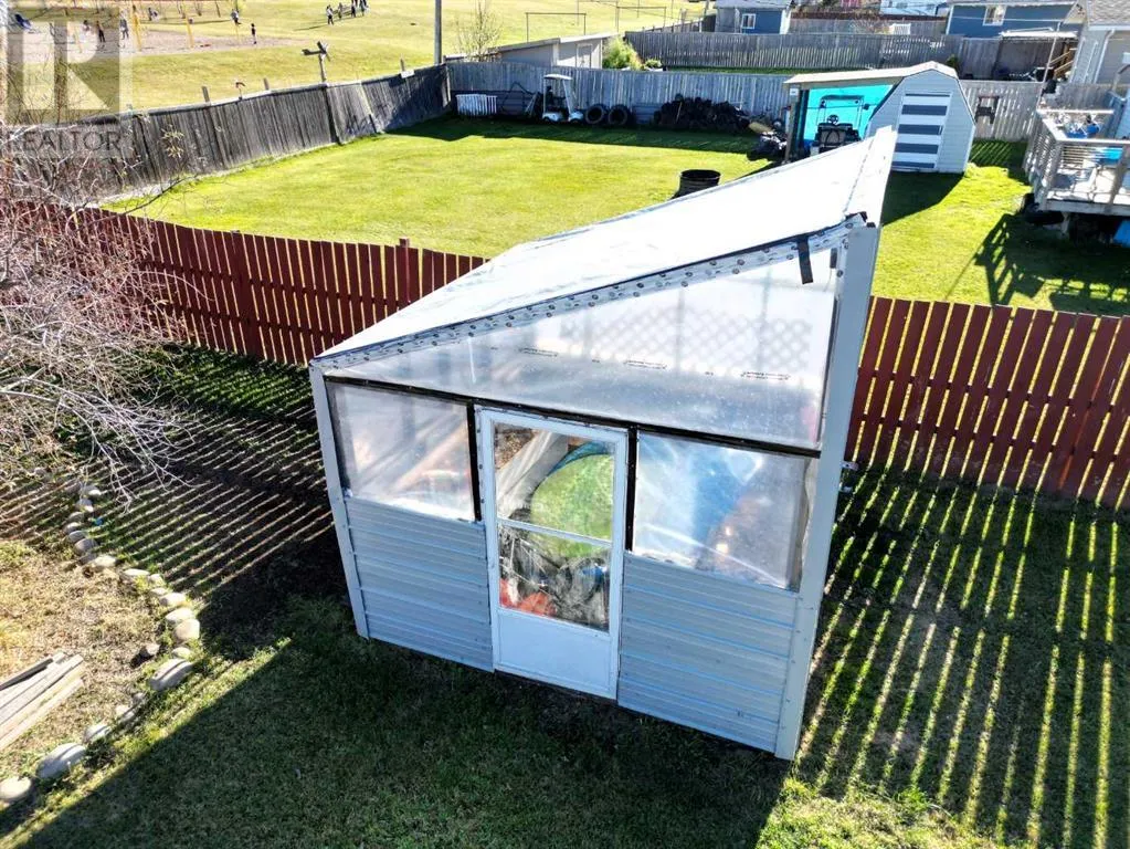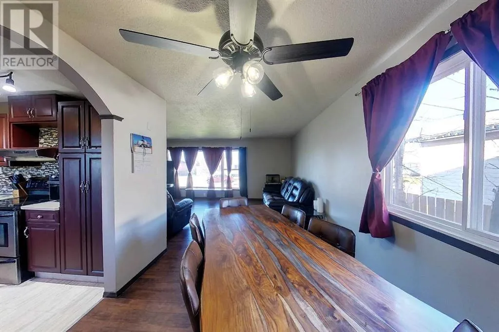 This charming 4-bedroom, 2-bath bungalow boasts a durable metal roof and is perfect for families. The open living and dining room lead to a well-appointed kitchen with stainless appliances, including a fridge, stove, and dishwasher. For clean, purified water, it features a water purification system.Upstairs, youâll find 3 bedrooms and a 4-piece bathroom with tile flooring. The laminate flooring extends into the kitchen, which has laminate counters and a built-in hood fan. The spacious backyard backs onto a school field, offering ample outdoor space with a dog run, a greenhouse, and a large deck. Plus, thereâs RV parkingIn the basement, thereâs a recreational room, an office, a 3-piece bathroom, and a 4th bedroom. The extra-large utility/laundry room is perfect for handling household chores. The basement features carpet and linoleum, with a large storage area under the stairs.Enjoy cozy evenings with a firepit and wood that stays. This home is a wonderful blend of modern convenience and classic charm. (id:27476)