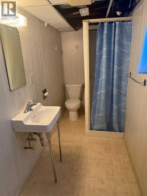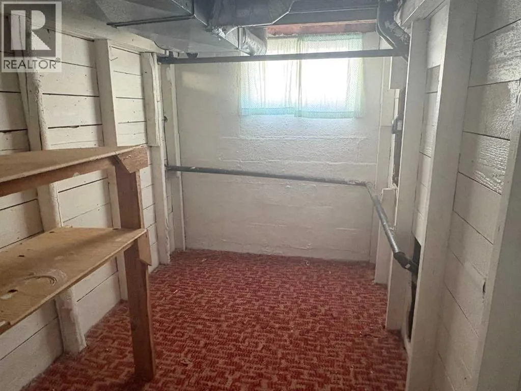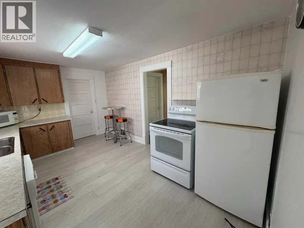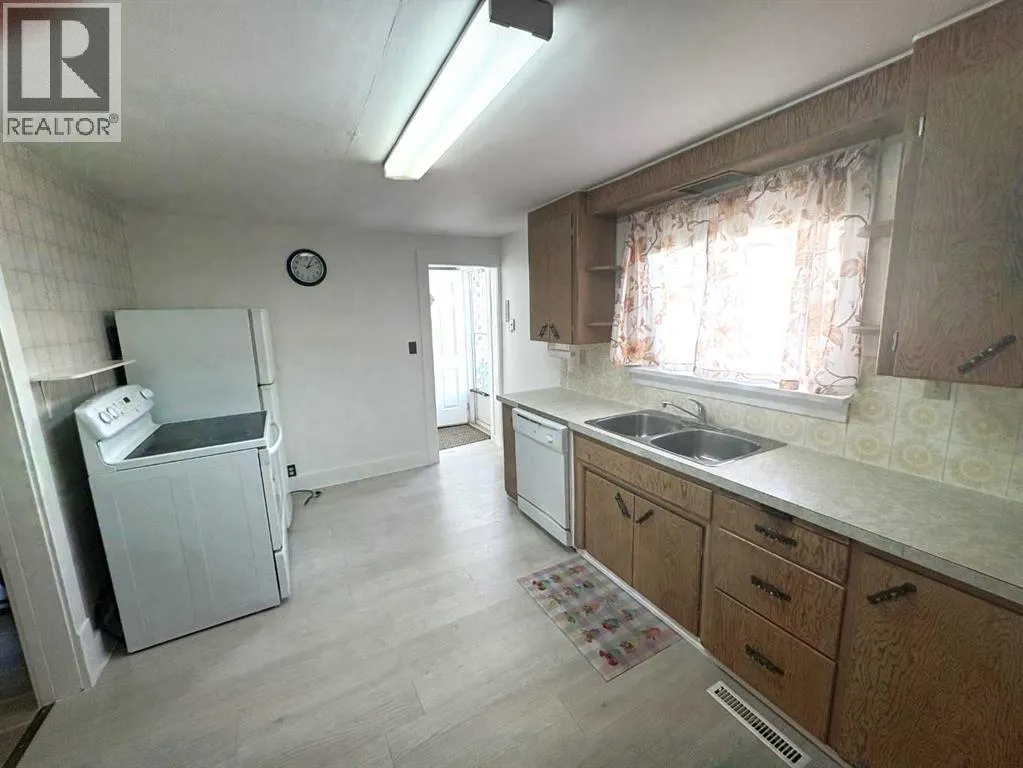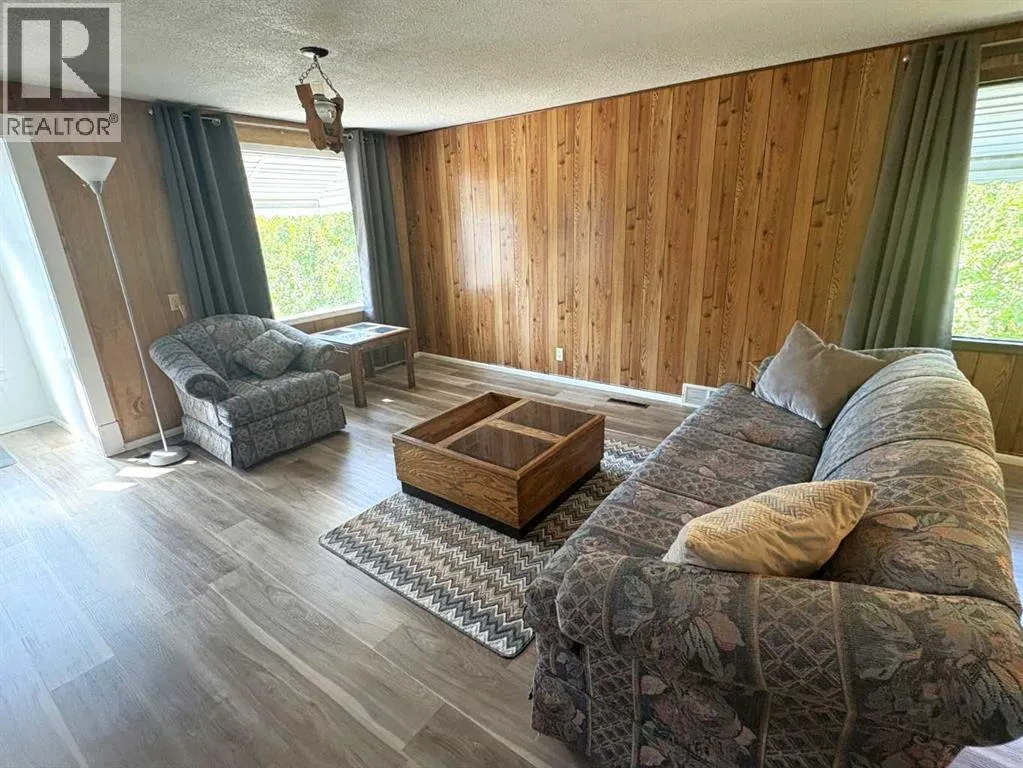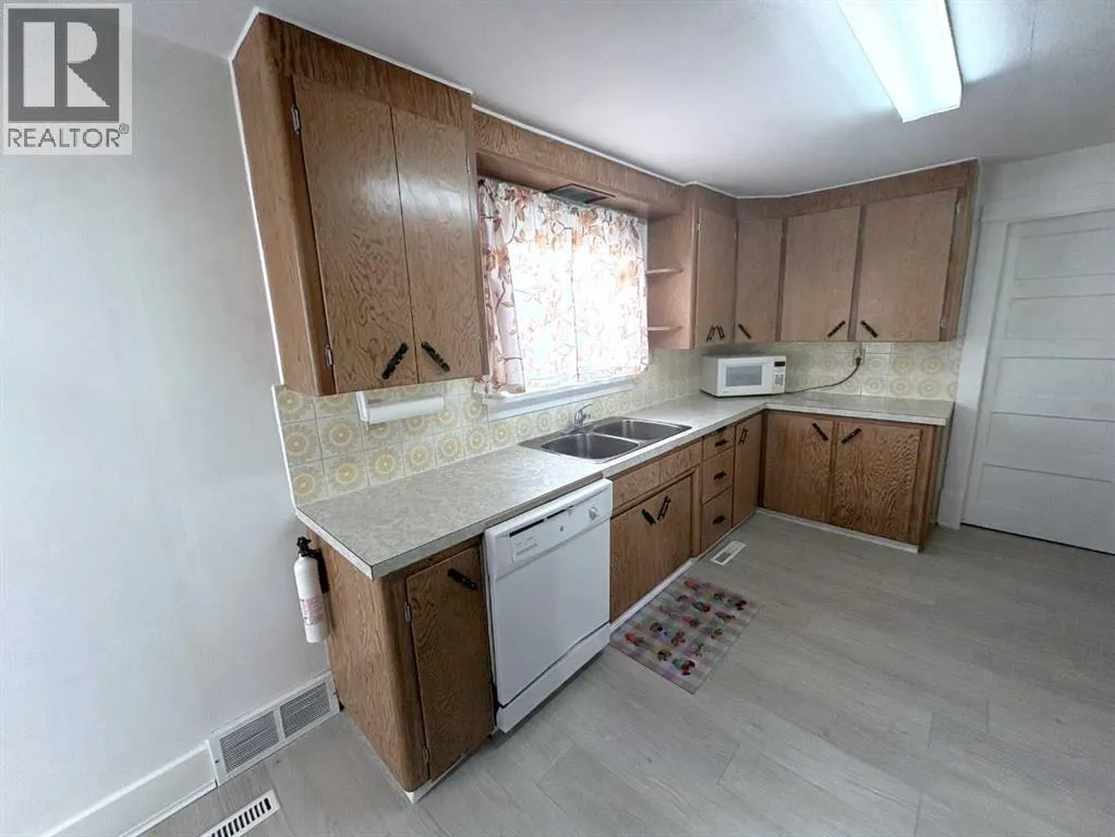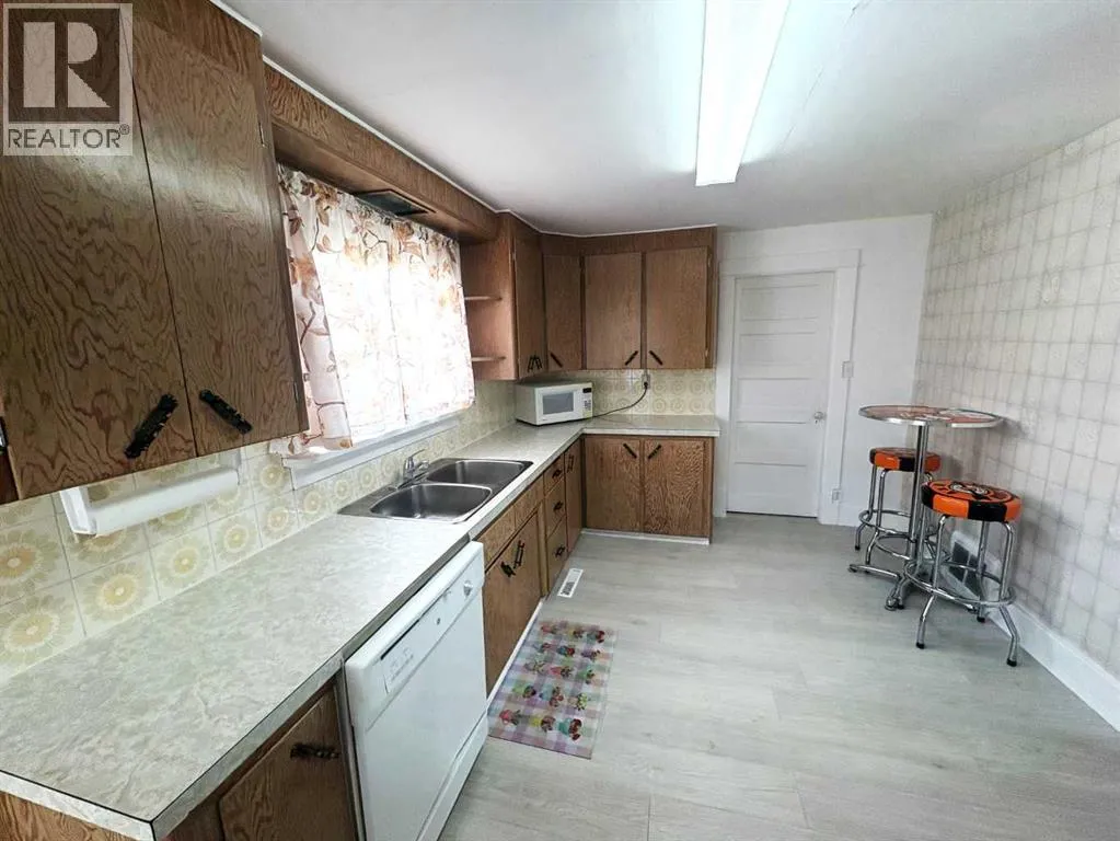 Check out this cute family bungalow. 897 sqft. Three bedroom, two bathrooms. Main floor features spacious kitchen. Large dining/living room. Two nice size bedrooms. Four piece bathroom with extra storage cabinets. In the basement you have one more bedroom. A three-piece bathroom. Family room. Two nice storage rooms and a cold room. You will truly enjoy your private backyard. Have your morning coffee on your front or back deck. There is a natural gas connection for your barbeque on the back deck. The double detached garage has 220 V power with back lane access and RV parking. Some renos over the years include shingles, electrical, flooring, front deck. Enjoy the peace and quiet of small town living in the quaint community of Galahad. (id:27476)
