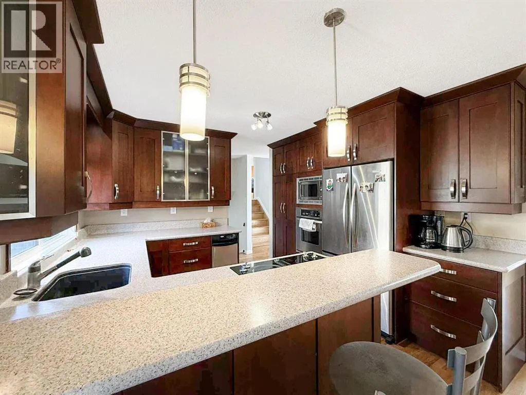 Centrally located and within walking distance to schools, shopping, and the Rec Centre, this beautifully maintained four-level split offers comfort, function, and charm throughout.Inside youâll find 2 bedrooms up and 1 down, a bright and welcoming kitchen that will please any cook, and two cozy gas fireplaces perfect for those mountain evenings. The home has seen numerous updates including renovated bathrooms, new flooring, a new hot water tank, furnace and roof.Enjoy hardwood flooring, tons of storage, and an extra-long attached garageâperfect for vehicles, toys, and tools. Outside, the landscaped, tiered backyard provides a private retreat complete with a large shed.All appliances are included (id:27476)