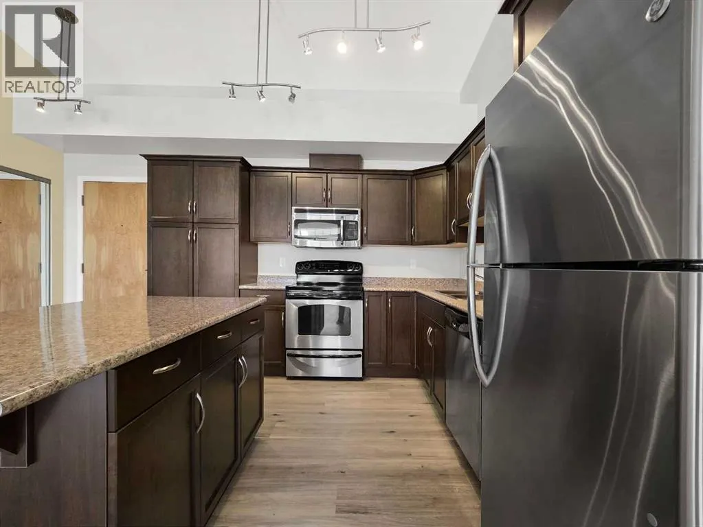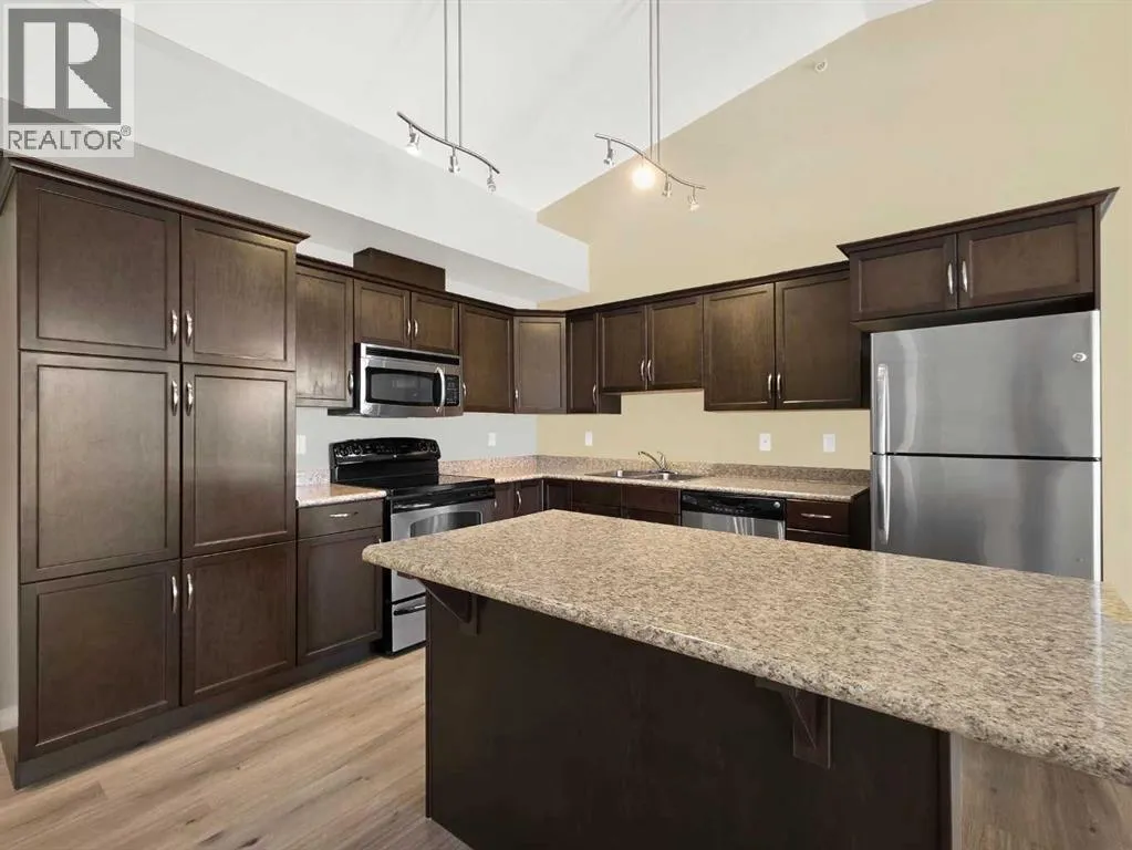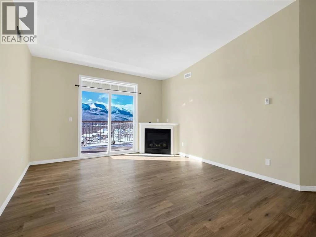 Wake up to some of the best Rocky Mountain views you can find from this top-floor, front-facing unit. Whether youâre in the living room, out on the deck, or in either bedroom, the sunrise over the mountains makes this place feel incredible. With higher ceilings, fresh new flooring, and a practical two bedroom, two bathroom layout, it just works. The gas fireplace adds that extra bit of warmth, while air conditioning keeps things comfortable year-round. Youâve got two parking stallsâone in the heated underground parkade and one above groundâand access to the buildingâs fitness centre. Easy living, low maintenance, and nothing to worry aboutâjust move in and enjoy. (id:27476)