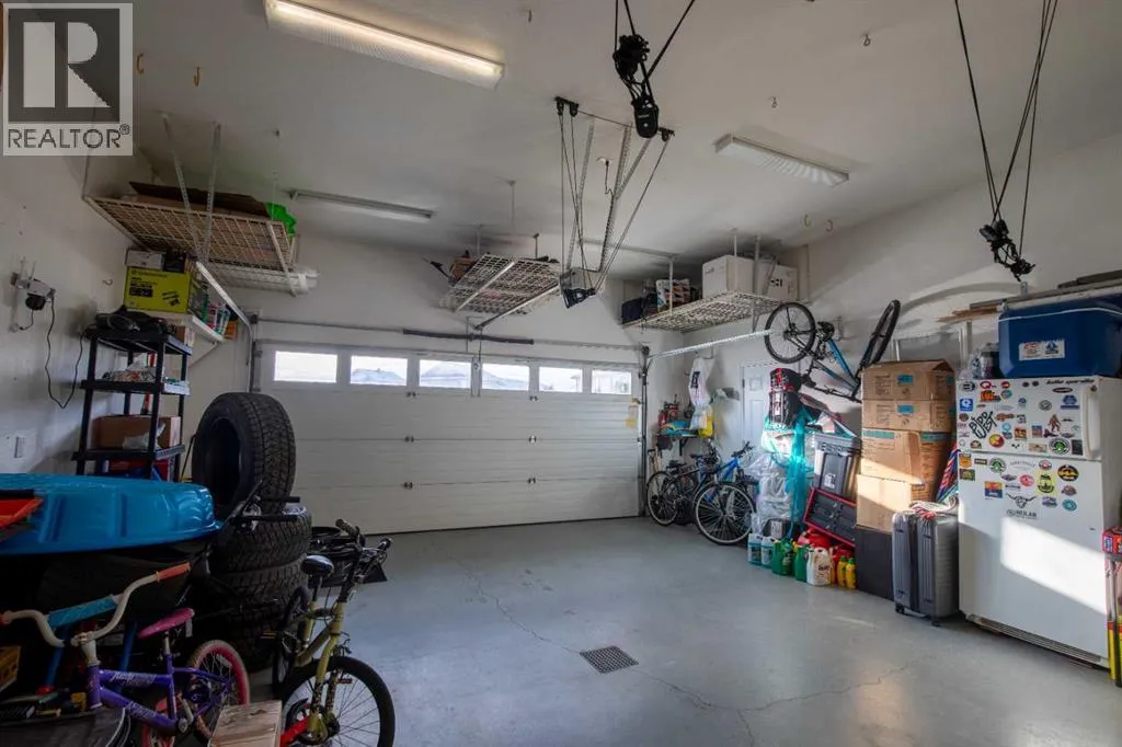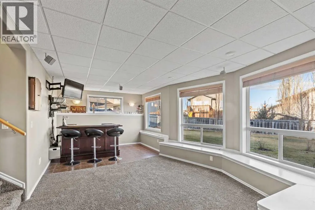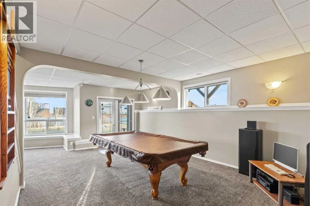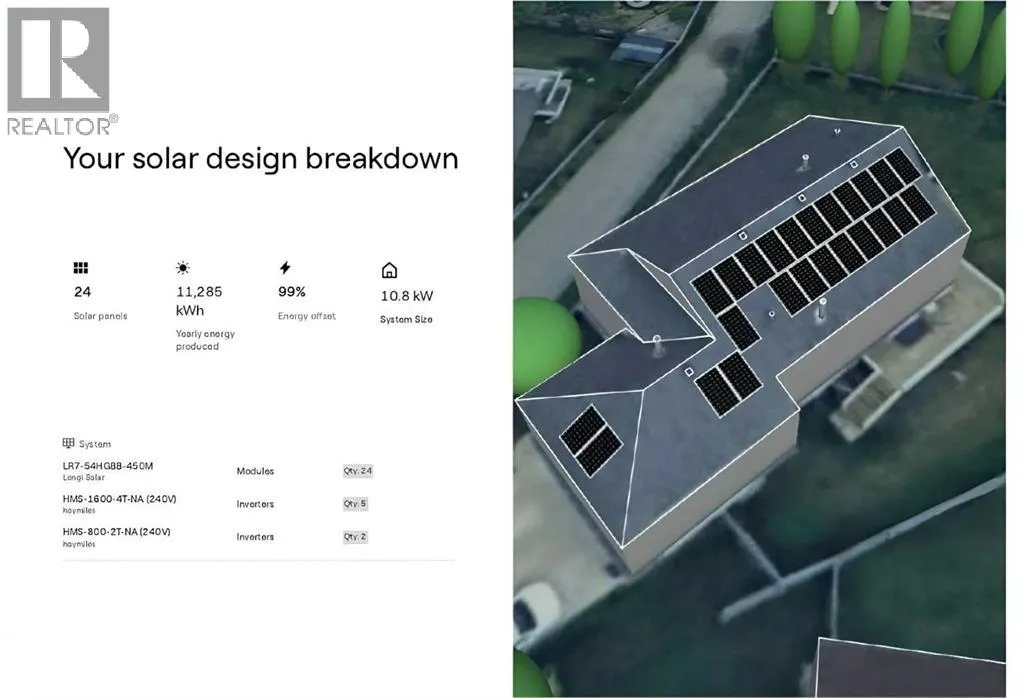 This stunning bungalow sits on a quiet corner of a cul-de-sac and offers an incredible mix of comfort, style, and thoughtful upgrades throughout. The welcoming sunken entry leads into a bright and open main floor featuring a spacious kitchen with an island, corner pantry, stainless appliances, and plenty of cupboard and counter space, flowing into a dining area with access to a raised deck (gas line included) overlooking the massive pie-shaped yard with beautiful views. The living room showcases floor-to-ceiling windows with custom blinds and a dual-sided gas fireplace shared with the primary suite, which also includes a walk-in closet and a relaxing 4-piece ensuite with a jetted tub. A main floor laundry room, additional bedroom, and full bathroom complete the level. The bright walkout basement is designed for entertaining with modern finishings, a full wet bar, pool table, speaker system, two large bedrooms, another well-finished bathroom, and a spotless utility room. The heated garage is a standout with ceiling storage, hot and cold taps, 220V power, laundry setup, and a dedicated indoor pet area with direct yard access. This home is loaded with upgrades including central A/C with humidifier, central vac, 2022 shingles, new fridge and microwave, a 2024 hot water tank, automatic irrigation with fertilizer pump, new apple and cherry trees plus grapevines, a new remote-controlled backyard waterfall feature, and most notably, a premium 24-panel solar system installed last month offering significant long-term savings. A rare find with incredible natural light and a huge lot, this bungalow truly checks every box. (id:27476)