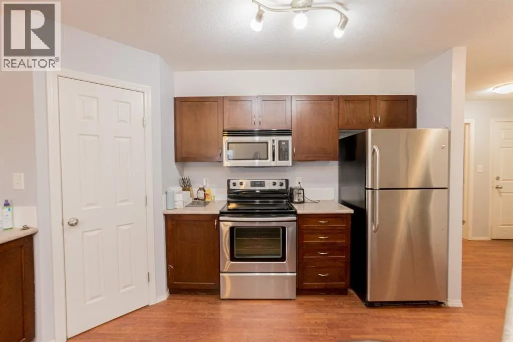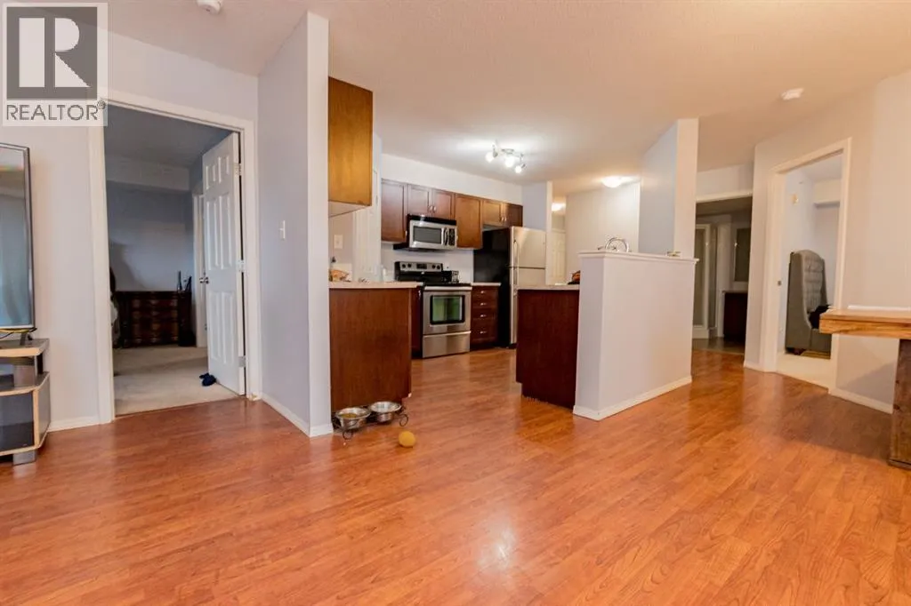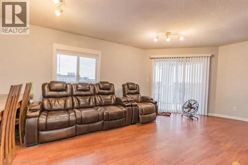 TOP FLOOR CORNER UNIT WITH GREAT WESTERN EXPOSURE. This oversized 2Bed/2Bath condo has so much to offer: dedicated laundry room in-suite hosting new washer/dryer, large entryway, kitchen space with pantry and large island/eating bar. Bedrooms are separated for great privacy options . Primary offers walk-thru closet and full ensuite bath. Dining area & large living space complete the package. Unit currently offers one underground stall plus two above ground parking stalls(leased). Condo living can create a great lifestyle with gym facilities in the building and no maintenance to worry about. Perfect location close to all west Grande Prairie's amenities, Regional hospital, NWP secondary education site & airport. Well priced for the size & location, flexible possession available. Call a Realtor today to arrange your private showing. (id:27476)