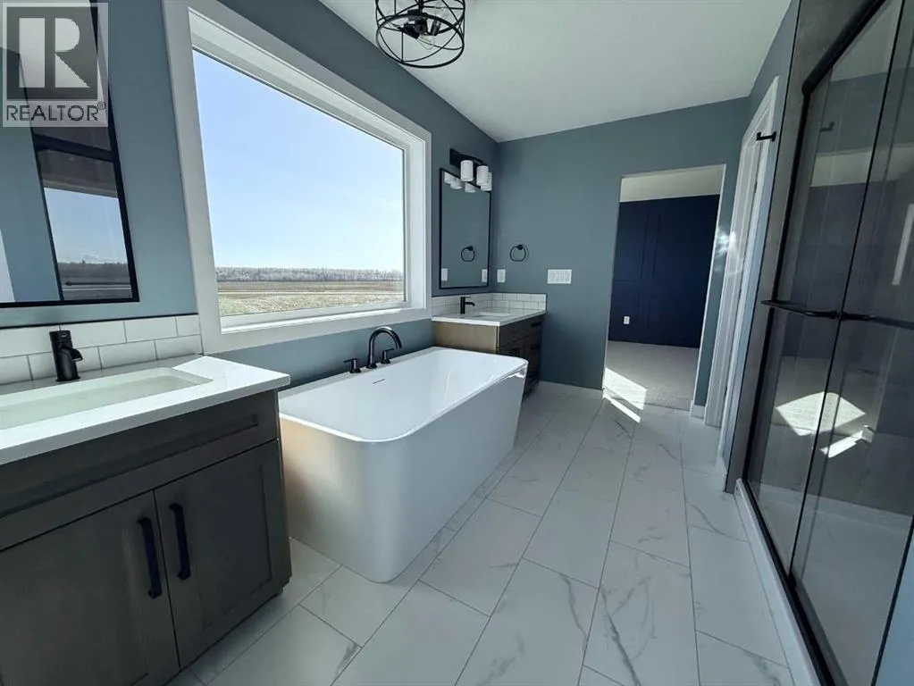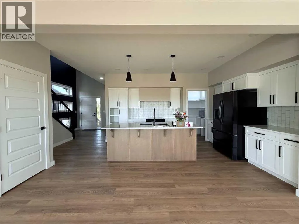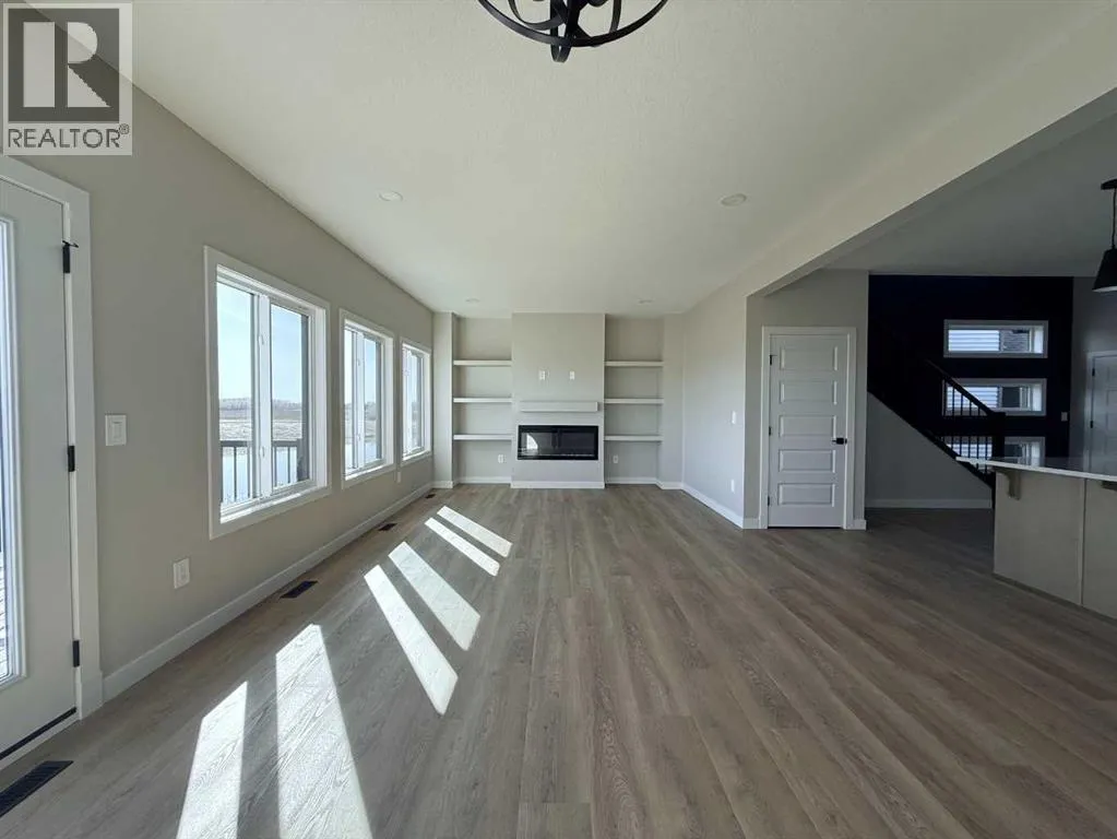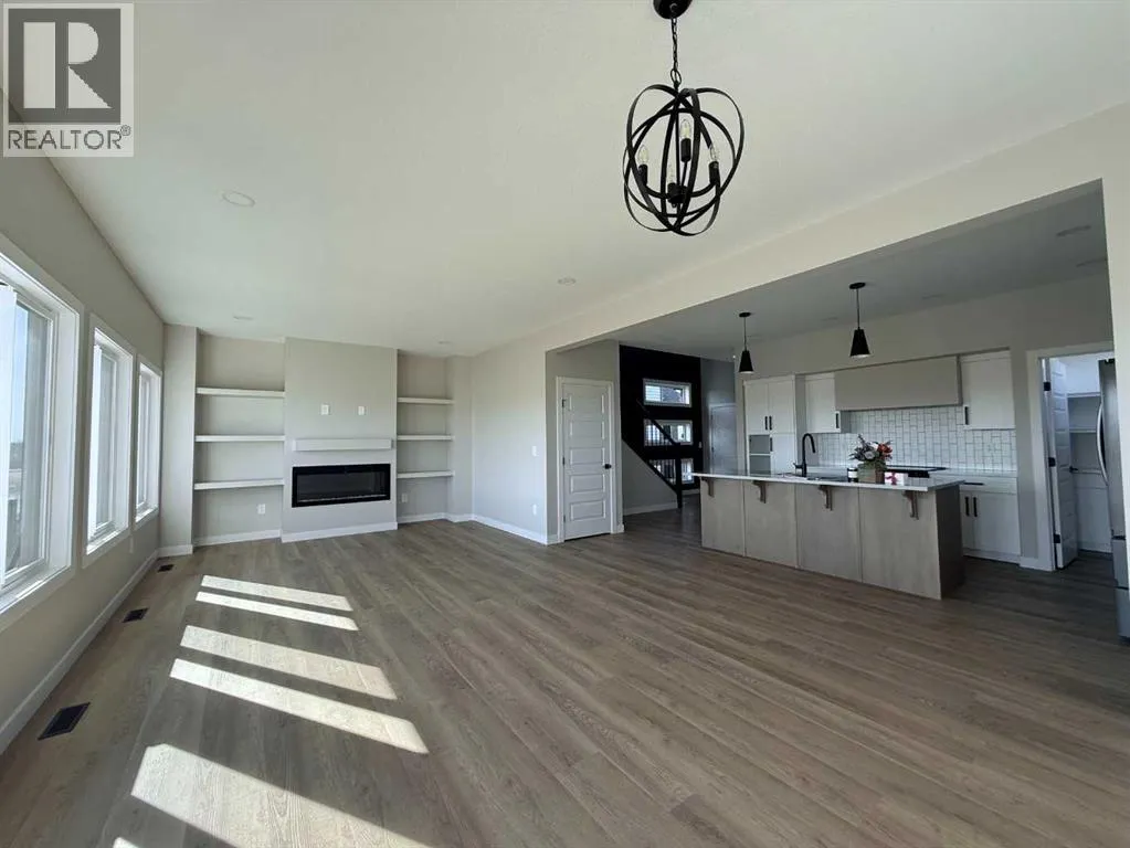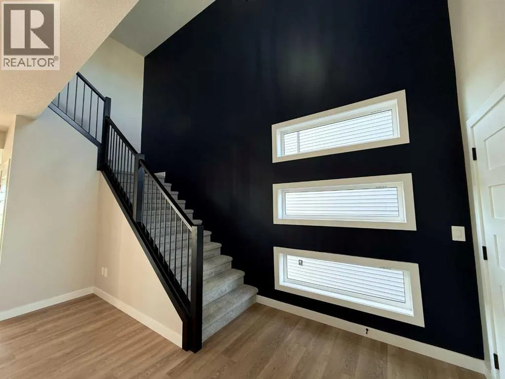 Stunning 2118 sq.ft 2 storey home backing onto Woody Creek with walk-out bsmt and across from children's park in the popular family neighbourhood of Signature Falls. This gorgeous floor plan is sure to check all the boxes offering modern flair with traditional conveniences starting with the exterior, this home screams luxury with its dark exterior, black trimmed windows throughout including many additional rectangular windows adding tons of natural light inside the home. Spacious front entry with jaw-dropping feature staircase greets you with private side half bath and garage access/mudroom. The open concept main floor invites you with a large center island anchoring the space while drawing your eye to the massive rear windows overlooking the creek and green space; complete serenity. Kitchen offers butlers pantry, tons of cabinets and included kitchen appliances. Living room features electric fireplace and flows from the oversized dining nook with patio door access. Upstairs offers 2 beautiful secondary bedrooms with easy access to the full bath plus bonus room/flex space. Upper level laundry room located just off the private primary bedroom with windows facing the creek, massive ensuite with dual vanities, soaker tub, separate shower, water closet and walk-in closet. Triple car garage is 32'x26'/28' with back door to access the yard. Walk-out bsmt is undeveloped but could be quoted for completion. This home is truly incredible with an early spring possession, call today and some colors could still be selected! Photos are from a previous build and are sample only. (id:27476)
