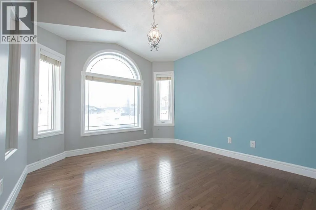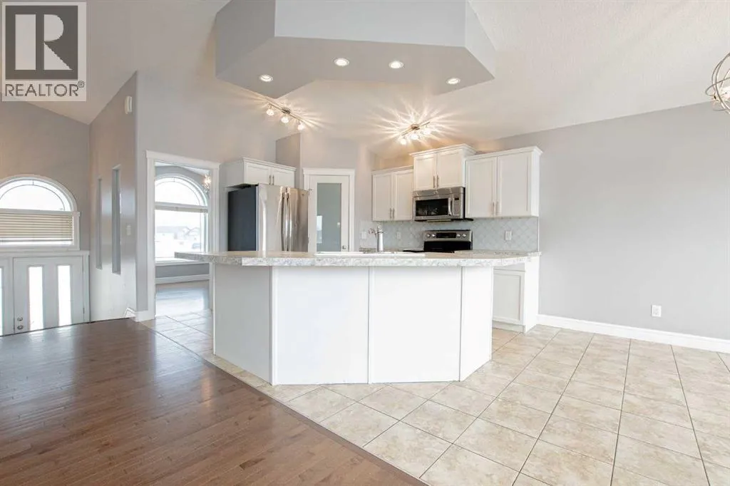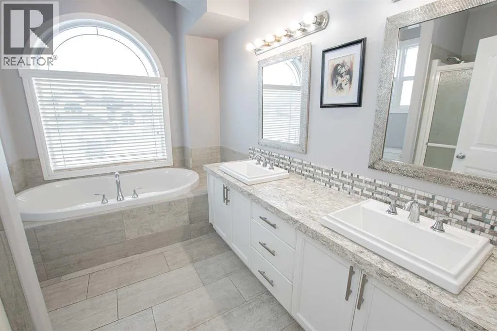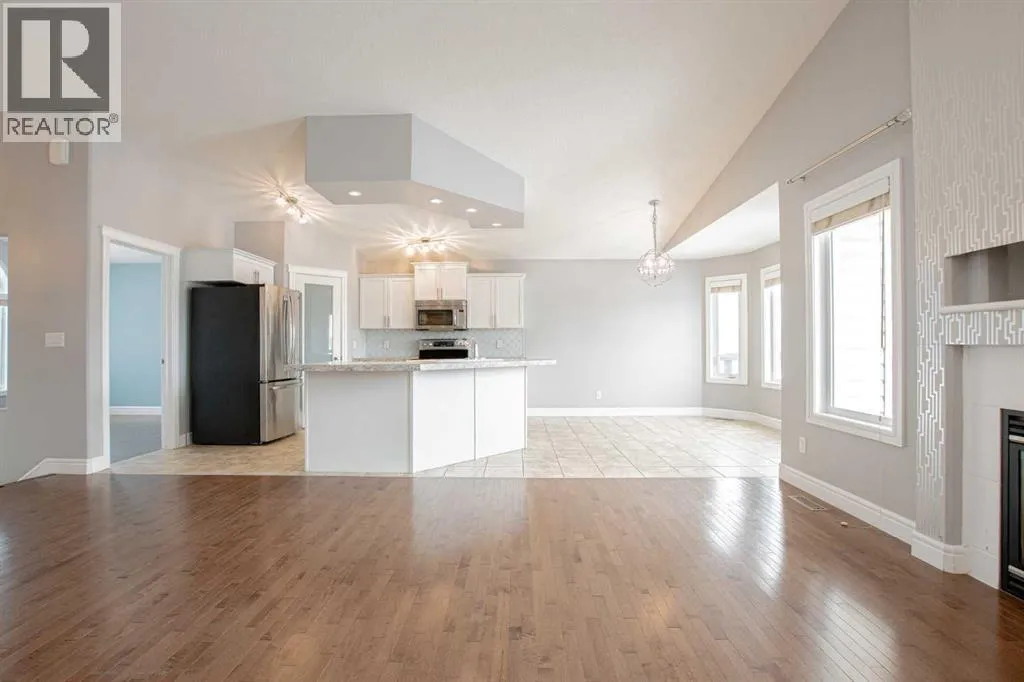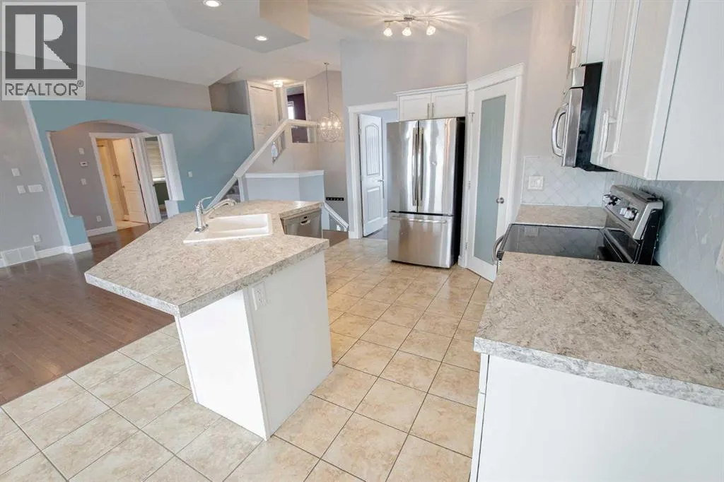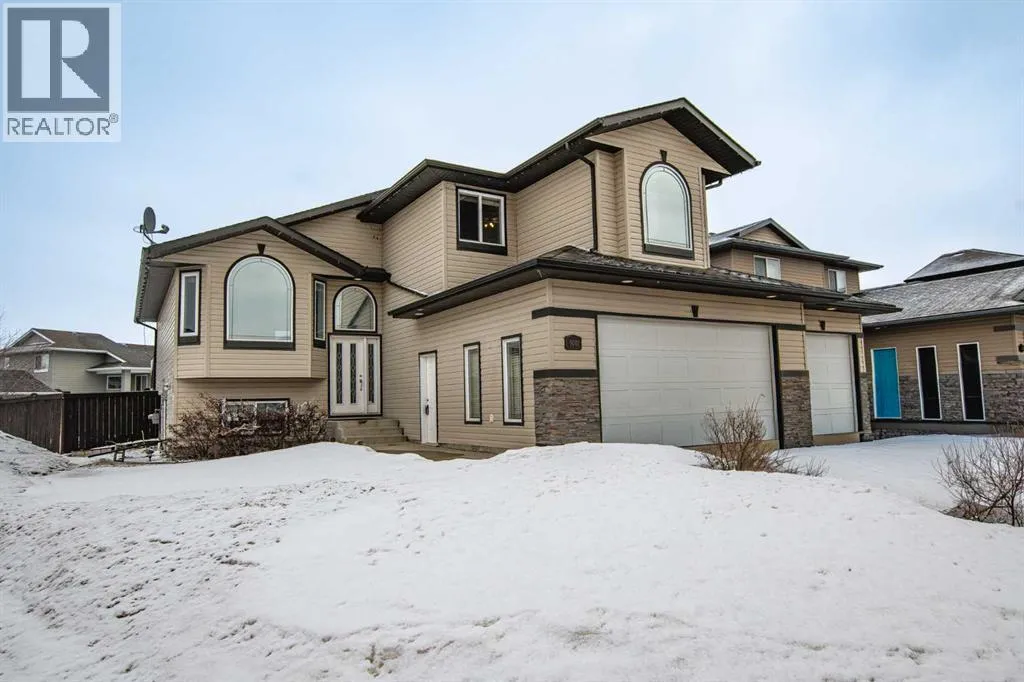 Backing onto Pat Gorman Park with no rear neighbours, this fully developed 1,636 sq. ft. modified bi-level offers a functional layout and family-friendly setting.Featuring 5 bedrooms, 3 bathrooms, and a den, the main floor presents an open-concept design with a bright kitchen complete with espresso cabinetry, stainless steel appliances, corner pantry, tiled backsplash, and a central island with eating bar. The dining area provides direct access to a two-tiered deck with views of the park.The living room showcases vaulted ceilings and a gas fireplace. The primary bedroom is privately located on its own level and includes a walk-in closet and ensuite with double sinks, jetted tub, and separate shower.The fully developed basement offers a large family room, two bedrooms, and a full bathroom.Heated triple car garage adds to the functionality and appeal of this property. (id:27476)