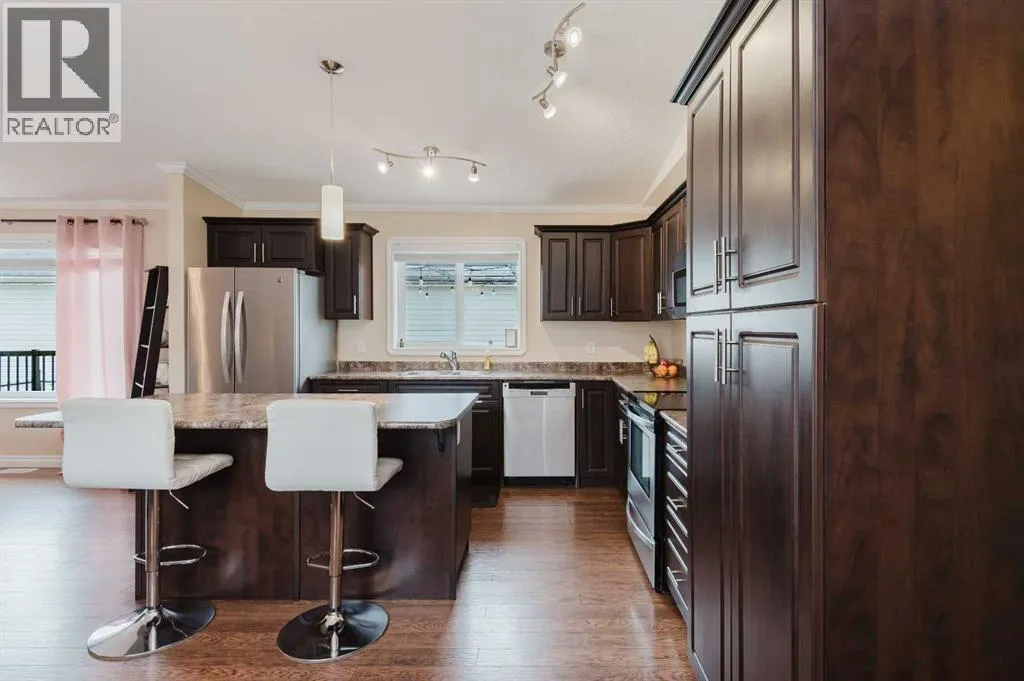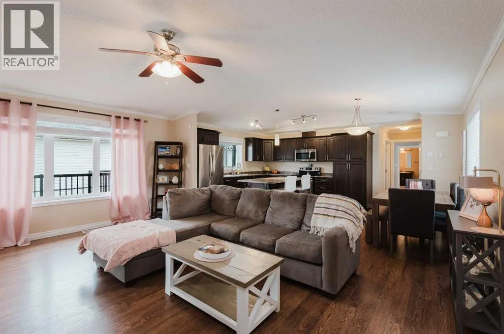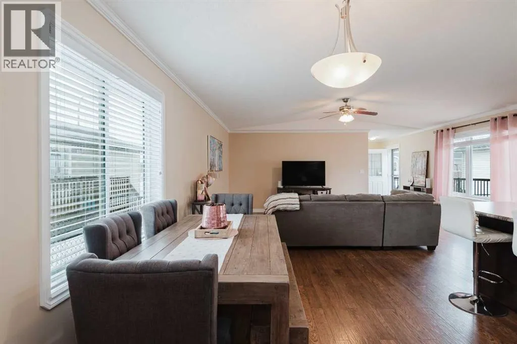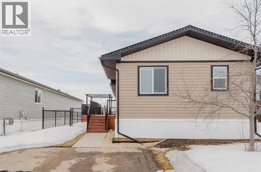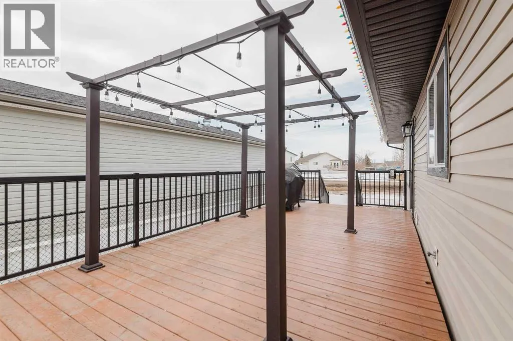 This beautifully maintained 2014-built home in Trumpeter Village offers 3 bedrooms, 2 bathrooms, and a bright, functional layout that truly shows pride of ownership. With drywall throughout the home has a more modern, finished feel and is move-in ready. The open-concept kitchen, dining, and living area is warm and inviting, featuring rich dark cabinetry, a large eat-up island, stainless steel appliances, a pantry, and plenty of cabinet and counter space. The spacious primary suite offers plenty of room for a king-sized bedroom set, 2 large closets, and a lovely 5-piece ensuite with double sinks, a soaker tub, and separate shower. On the opposite end of the home, youâll find 2 more good-sized bedrooms and another full bathroom, creating a practical layout for families, guests, or a home office setup. Additional features include a laundry/utility room with stacked washer and dryer and central A/C for added comfort. Outside, enjoy the fully fenced and landscaped yard, large deck with aluminum railings and pergola, enclosed storage underneath, a spacious shed, no rear neighbours, and parking for 2 vehicles on the front driveway. A beautiful, well-cared-for property with great outdoor space, privacy, and a layout that works for everyday living. (id:27476)
