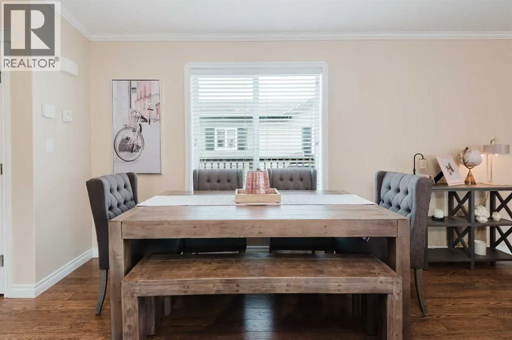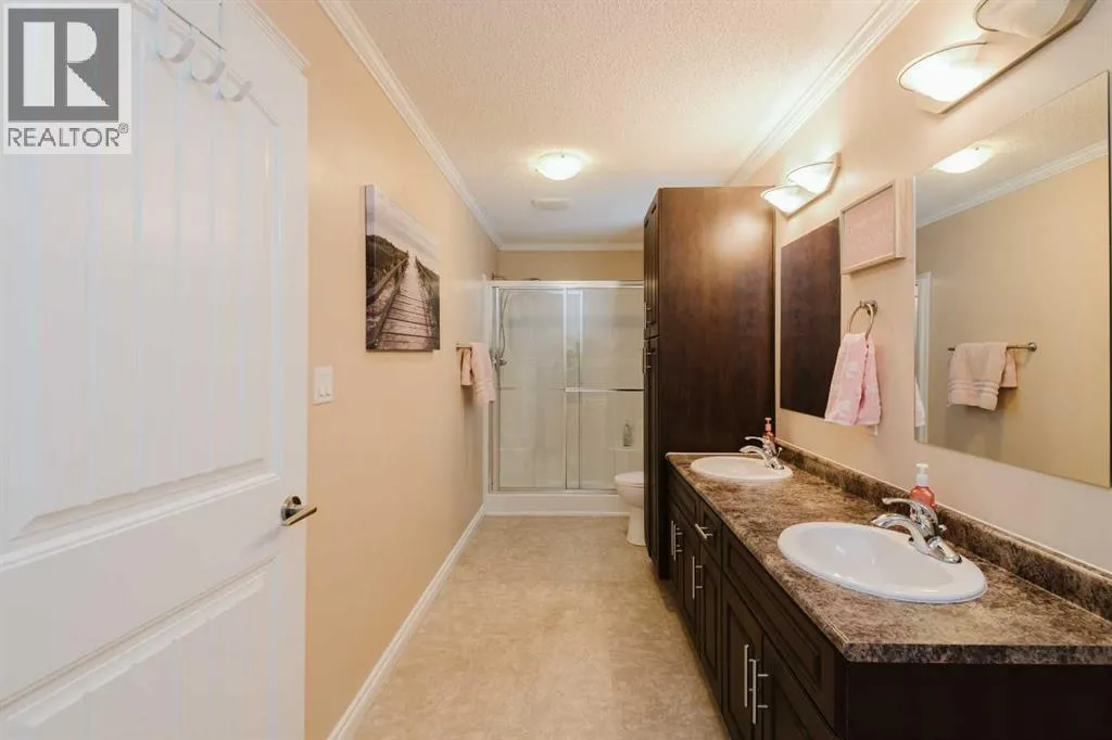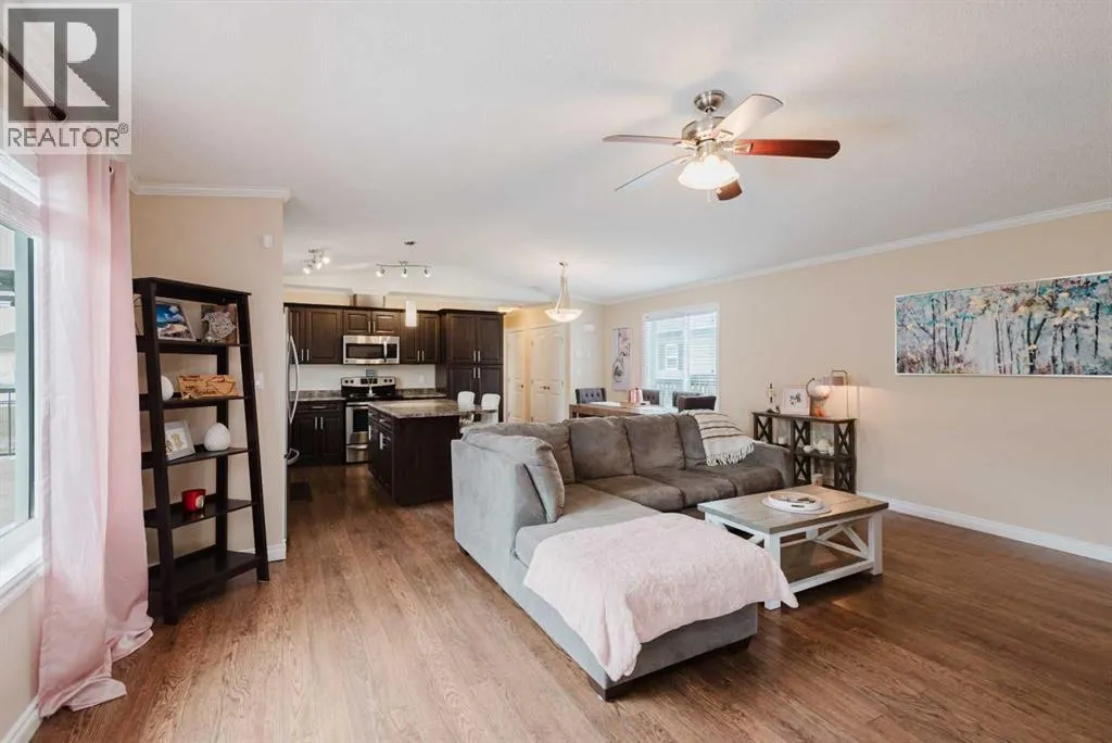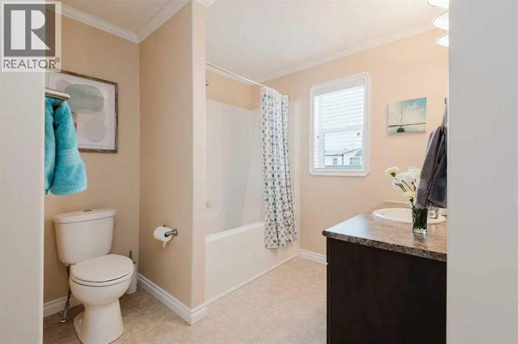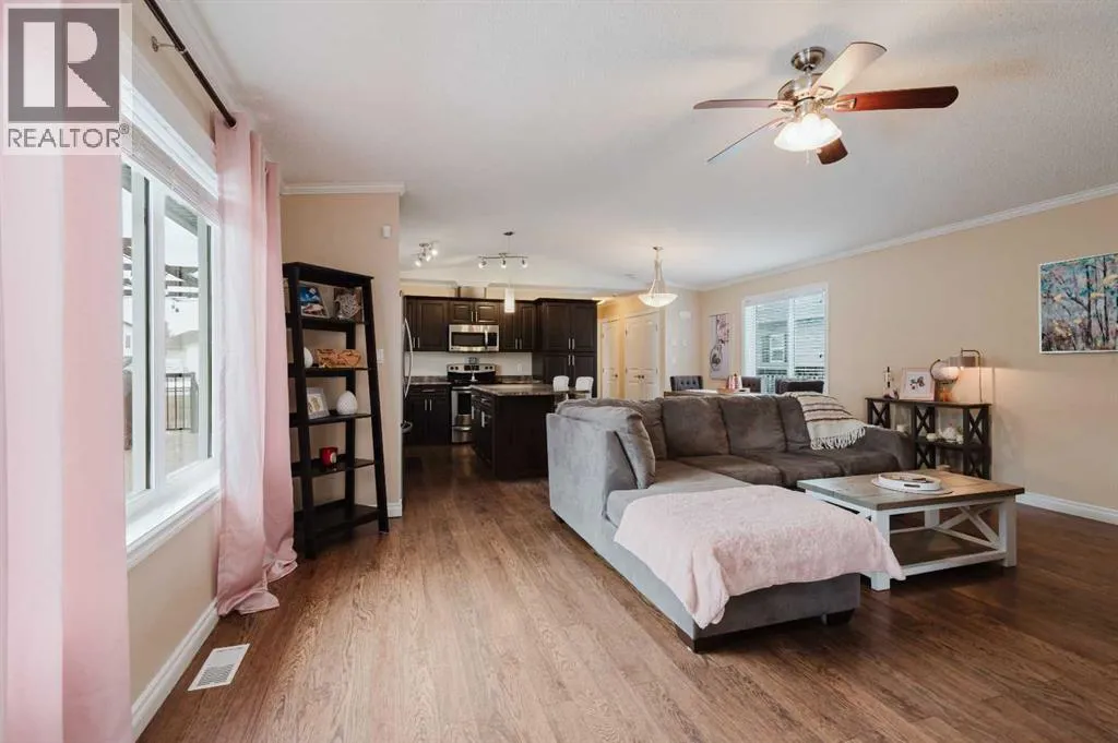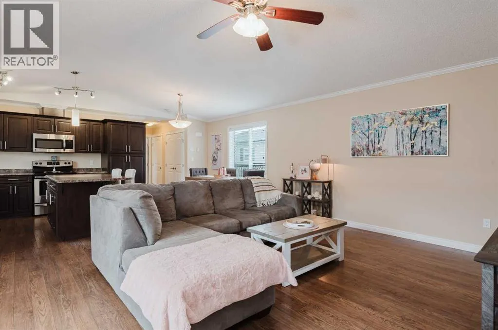 This beautifully maintained 2014-built home in Trumpeter Village offers 3 bedrooms, 2 bathrooms, and a bright, functional layout that truly shows pride of ownership. With drywall throughout the home has a more modern, finished feel and is move-in ready. The open-concept kitchen, dining, and living area is warm and inviting, featuring rich dark cabinetry, a large eat-up island, stainless steel appliances, a pantry, and plenty of cabinet and counter space. The spacious primary suite offers plenty of room for a king-sized bedroom set, 2 large closets, and a lovely 5-piece ensuite with double sinks, a soaker tub, and separate shower. On the opposite end of the home, youâll find 2 more good-sized bedrooms and another full bathroom, creating a practical layout for families, guests, or a home office setup. Additional features include a laundry/utility room with stacked washer and dryer and central A/C for added comfort. Outside, enjoy the fully fenced and landscaped yard, large deck with aluminum railings and pergola, enclosed storage underneath, a spacious shed, no rear neighbours, and parking for 2 vehicles on the front driveway. A beautiful, well-cared-for property with great outdoor space, privacy, and a layout that works for everyday living. (id:27476)