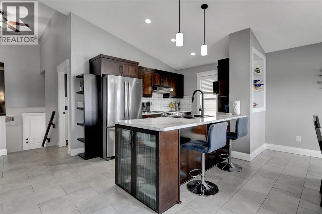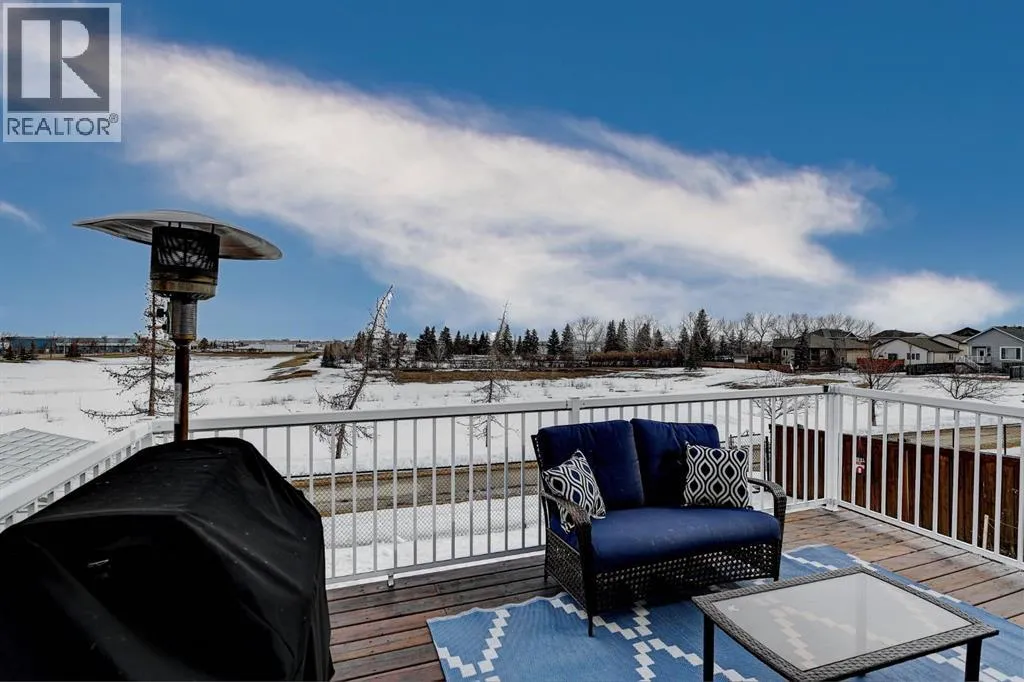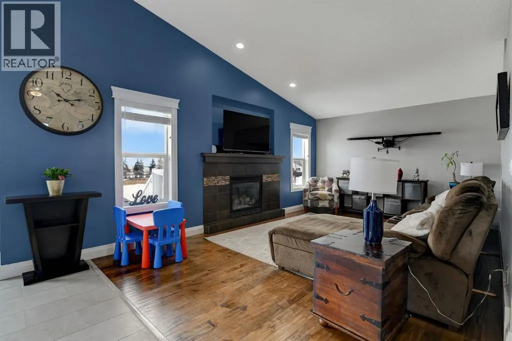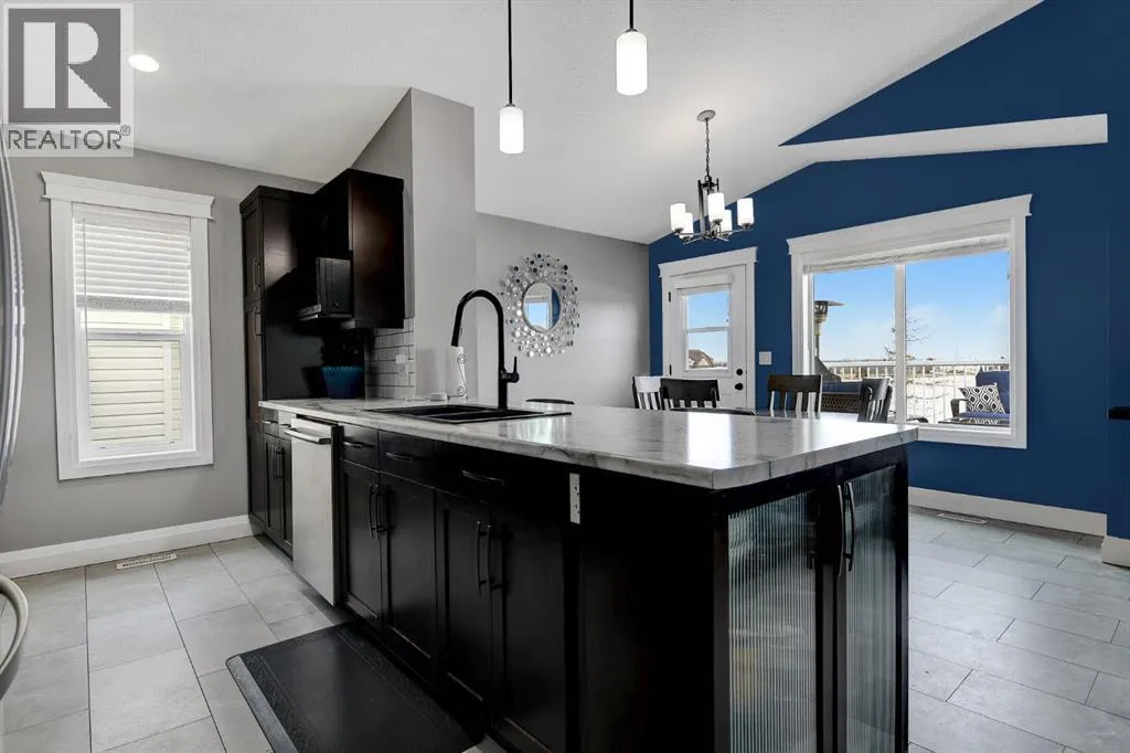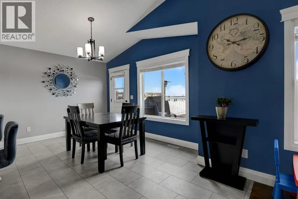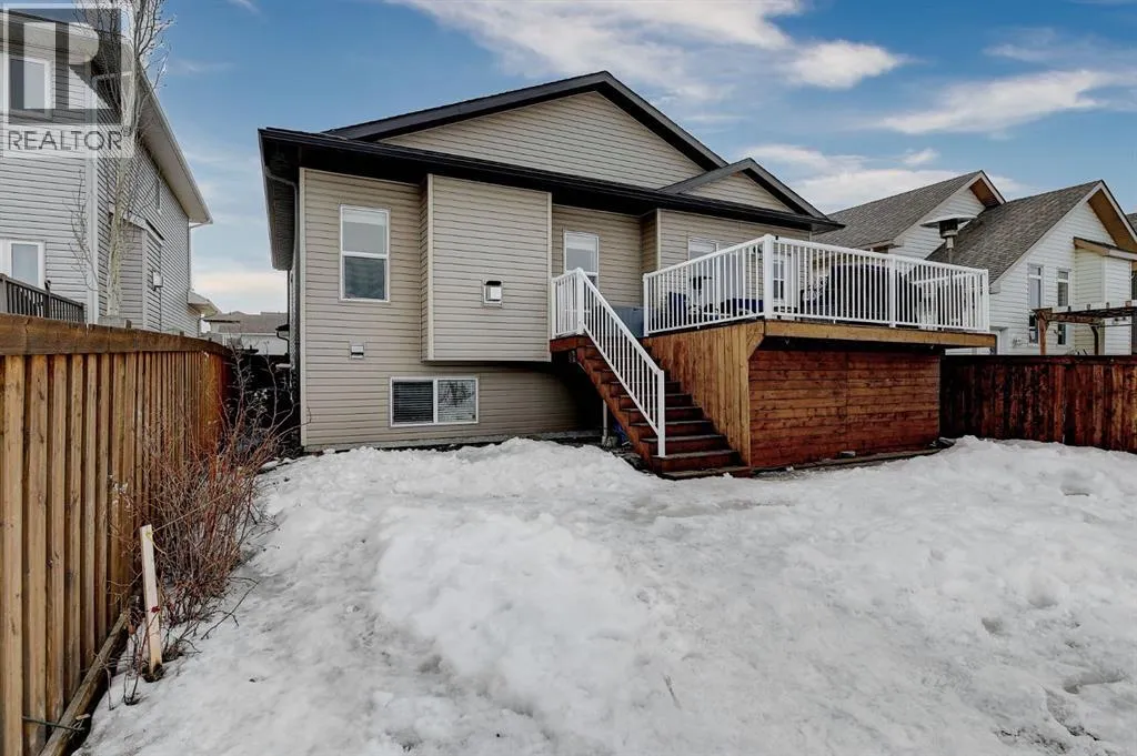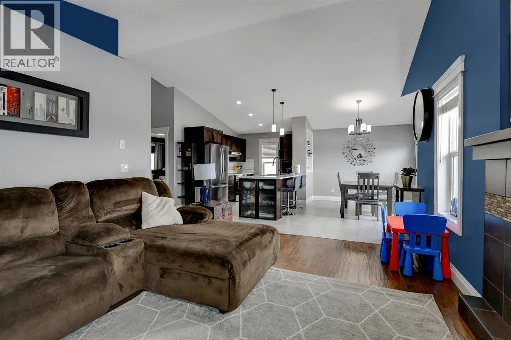 Absolutely immaculate, fully developed modified bi-level backing onto green space and just steps from a park in the family friendly community of Westpointe. This move in ready home has it all. A spacious tiled front entry welcomes you into the open concept main floor, featuring durable vinyl tile flooring throughout. The inviting galley style kitchen showcases rich espresso cabinetry, stainless steel appliances, and excellent functionality. The bright dining area opens onto a composite deck and a fully fenced, landscaped backyard with no rear neighbours perfect for relaxing or entertaining in complete privacy. The living room is warm and inviting, highlighted by a cozy gas fireplace, large windows that flood the space with natural light, and the added comfort of central air conditioning for the summer months. Two generously sized bedrooms and a full bathroom with a stunning tiled surround complete the main level. Above the garage, the oversized primary suite offers a true private retreat, featuring a luxurious ensuite with heated floors, a soaker tub, separate tiled shower, dual sinks, and direct access to a spacious walk-in closet. The fully developed basement boasts a massive rec room with a fun climbing wall, a fourth bedroom, and a third full bathroom providing a versatile layout ideal for families of all sizes. This home shows exceptionally well and is sure to impress. (id:27476)