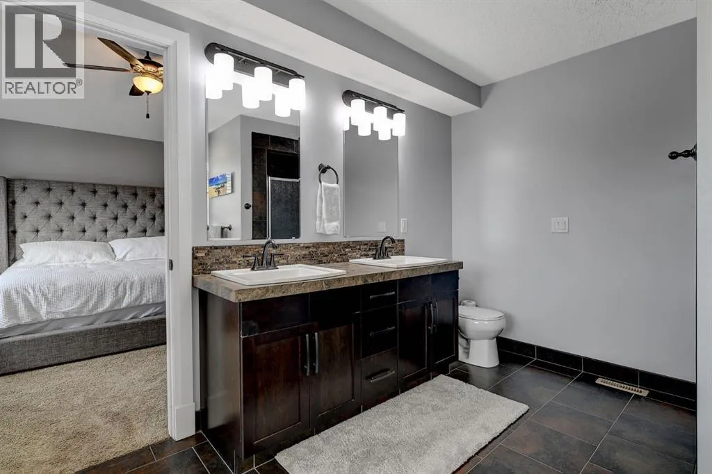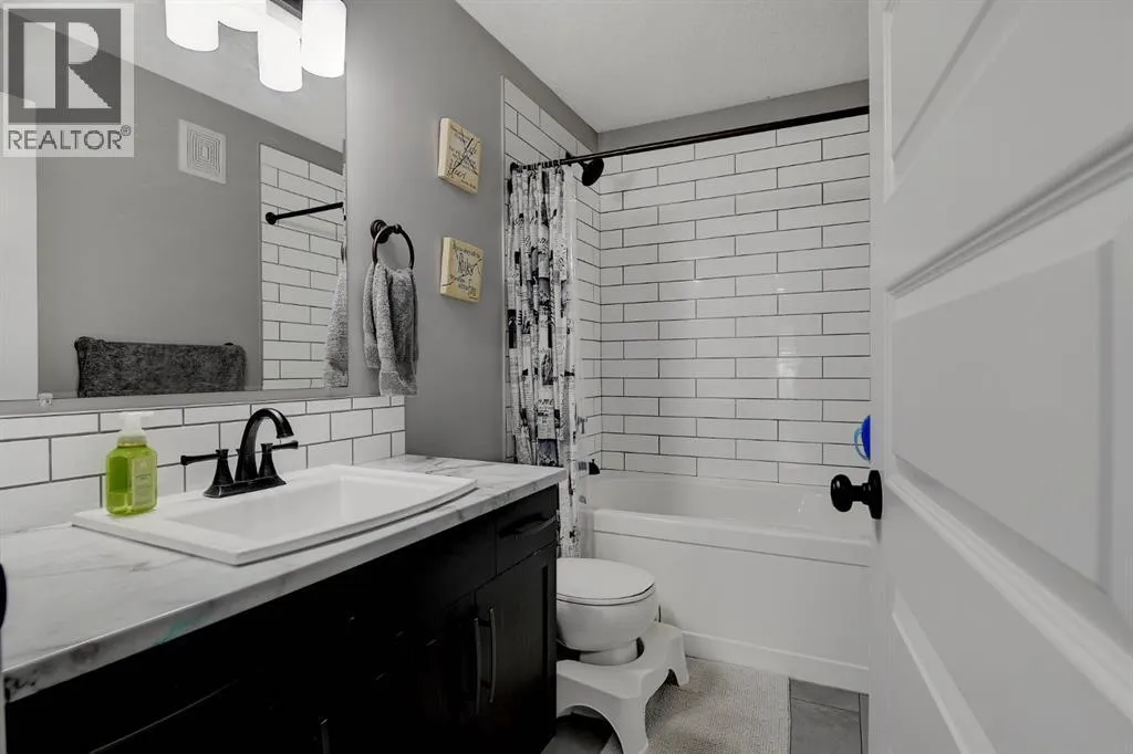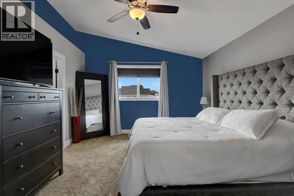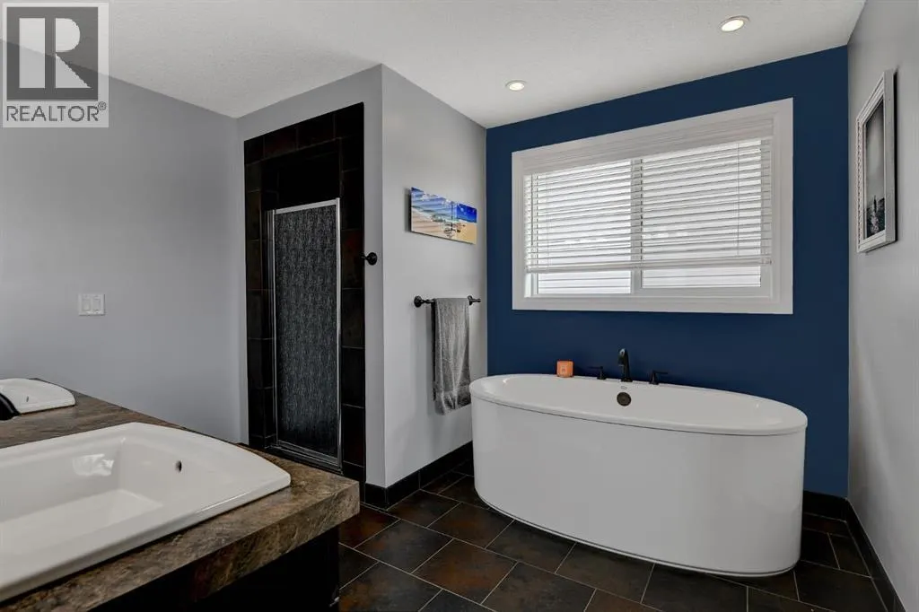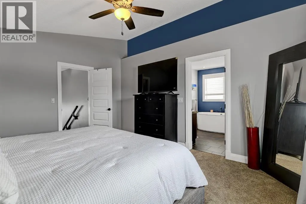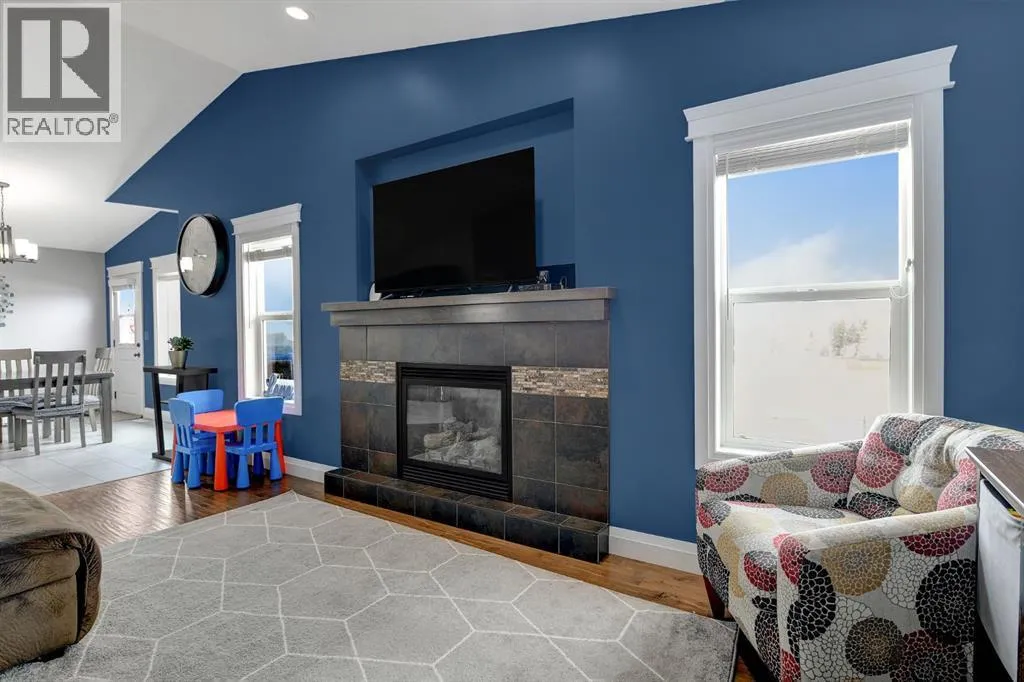 Absolutely immaculate, fully developed modified bi-level backing onto green space and just steps from a park in the family friendly community of Westpointe. This move in ready home has it all. A spacious tiled front entry welcomes you into the open concept main floor, featuring durable vinyl tile flooring throughout. The inviting galley style kitchen showcases rich espresso cabinetry, stainless steel appliances, and excellent functionality. The bright dining area opens onto a composite deck and a fully fenced, landscaped backyard with no rear neighbours perfect for relaxing or entertaining in complete privacy. The living room is warm and inviting, highlighted by a cozy gas fireplace, large windows that flood the space with natural light, and the added comfort of central air conditioning for the summer months. Two generously sized bedrooms and a full bathroom with a stunning tiled surround complete the main level. Above the garage, the oversized primary suite offers a true private retreat, featuring a luxurious ensuite with heated floors, a soaker tub, separate tiled shower, dual sinks, and direct access to a spacious walk-in closet. The fully developed basement boasts a massive rec room with a fun climbing wall, a fourth bedroom, and a third full bathroom providing a versatile layout ideal for families of all sizes. This home shows exceptionally well and is sure to impress. (id:27476)
