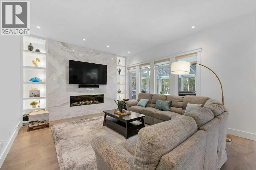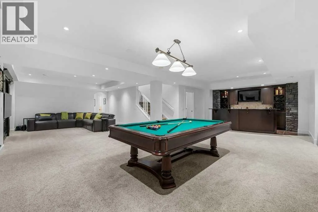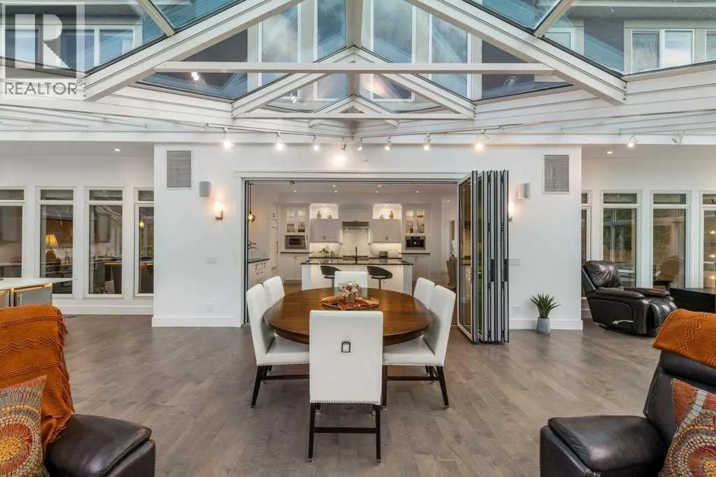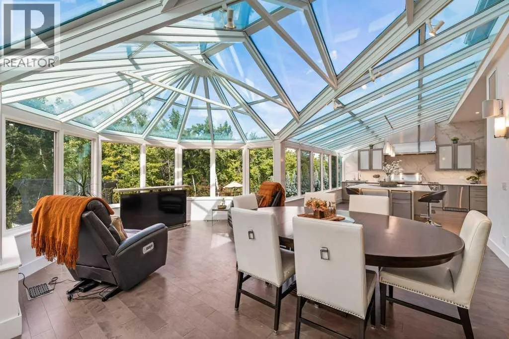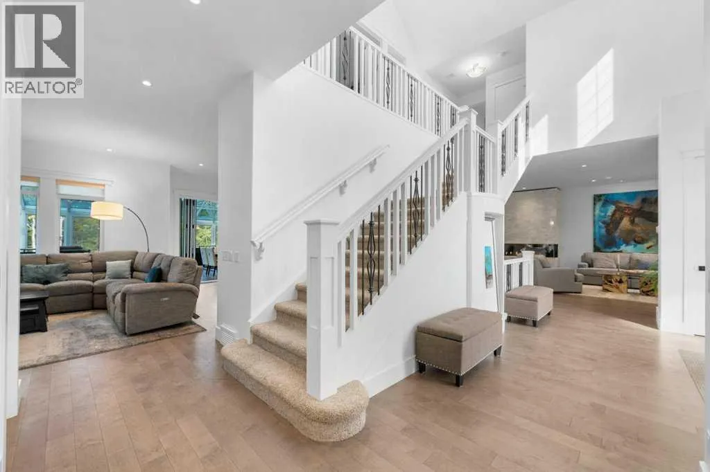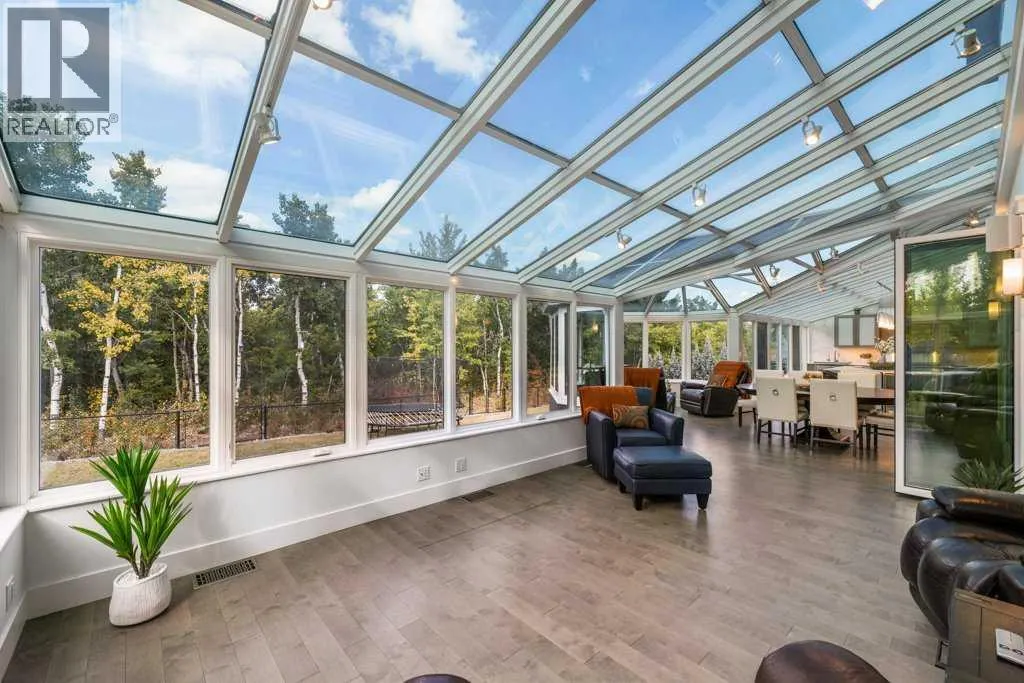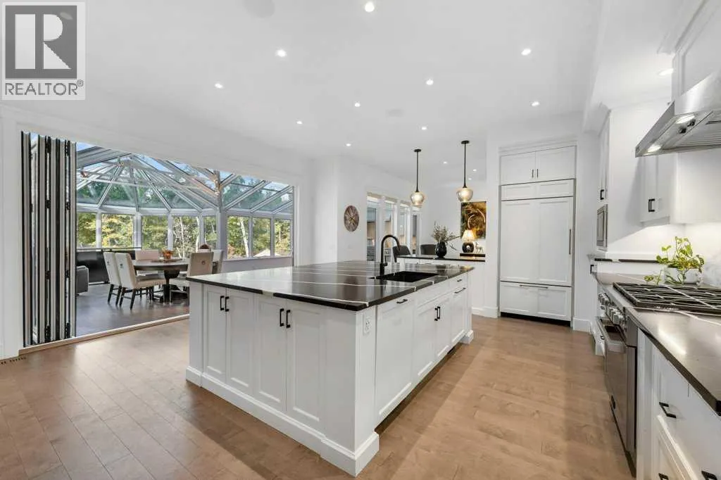 *Welcome to this extraordinary, fully renovated estate home in the prestigious community of Heritage Pointe, offering exclusive lake access and surrounded by natural forest beauty! Situated on a prime lot & backing onto a treed forest, the home has undergone a major renovation. It now features the addition of a spectacular 800 sq. ft. "entertainer's dream" 4 season sunroom (with new foundation and its own furnace/plumbing/air conditioning) - a true showpiece created for both relaxation and entertaining! Outfitted with premium appliances, the chef's kitchen serves large gatherings; a spacious dining room is adjacent, plus a living area for relaxation, where dual large-screen TV's seamlessly rise from the hardwood floors - at the touch of a button! The main home's central kitchen is renovated with new quartz counters/island, new appliances, marble backsplash, plus a newly reconfigured lighted pantry. With a living / dining room that has a new floor-to-ceiling feature "linear" fireplace, perfect ambience is createde. A stylish great room, also adjacent to the kitchen, provides built-in cabinetry with lighted accents. All new hardwood floors adorn the main level, new lighting, all solid interior doors, new carpets. A main floor office, half bath and mudroom complete the main level. The upper level currently features 4 bedrooms (could be bonus room with 3 bedrooms). The master suite showcases vaulted ceilings, a private sitting area overlooking the forest, spa-like 5 pc ensuite w/air jet tub, steam shower & large walk-in closet, heated floors! The professionally finished lower level features a 4th bedroom, bath, media area, games room w/expansive wine bar, fitness room w/cork flooring & 2nd laundry. Direct Connect networking throughout. Dual central air conditioners, gas generator and extensive solar system - serves entire home! The 4 car garages (two double garages) are separated by a breezeway. The rear yard showcases an 8 person "waterfall" mineral h ot tub with an adjacent fire pit gathering area - grounds with underground sprinklers systems. Whether hosting a gathering or hosting a quiet evening, the indoor/outdoor ambience and forested views create a resort-like view year-round! Experience the best of lake living, privacy, and modern sophistication, in one of Alberta's most sought-after communities. (id:27476)