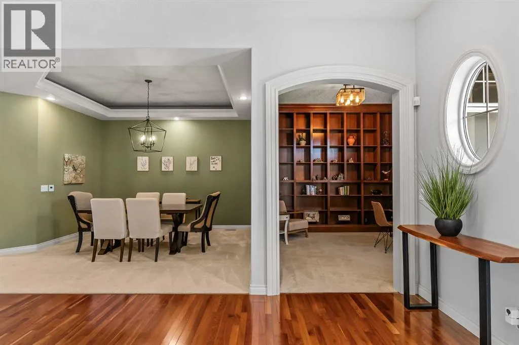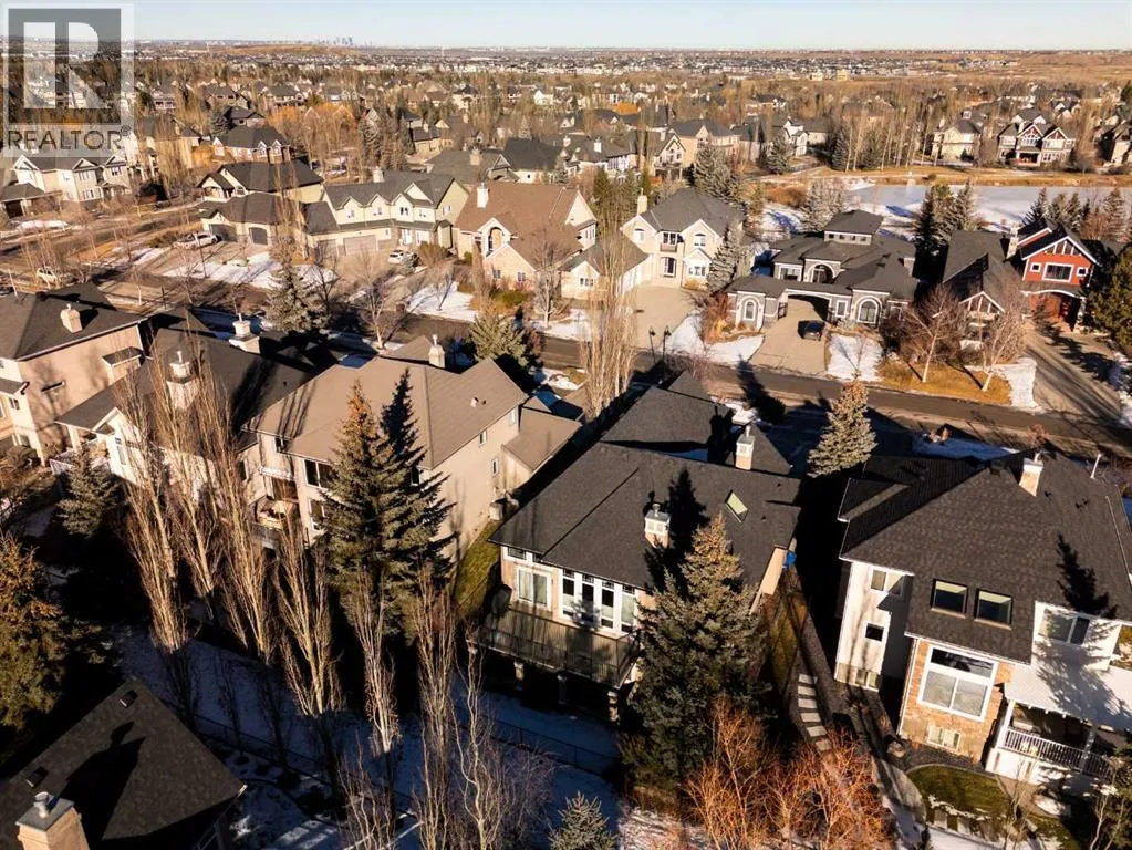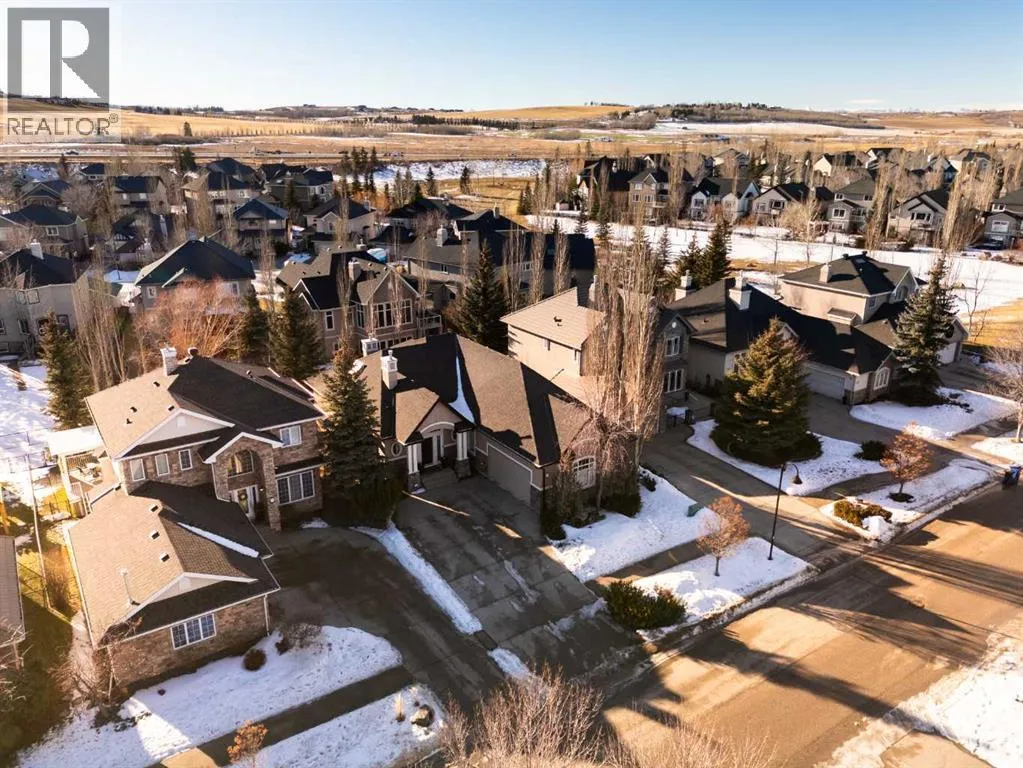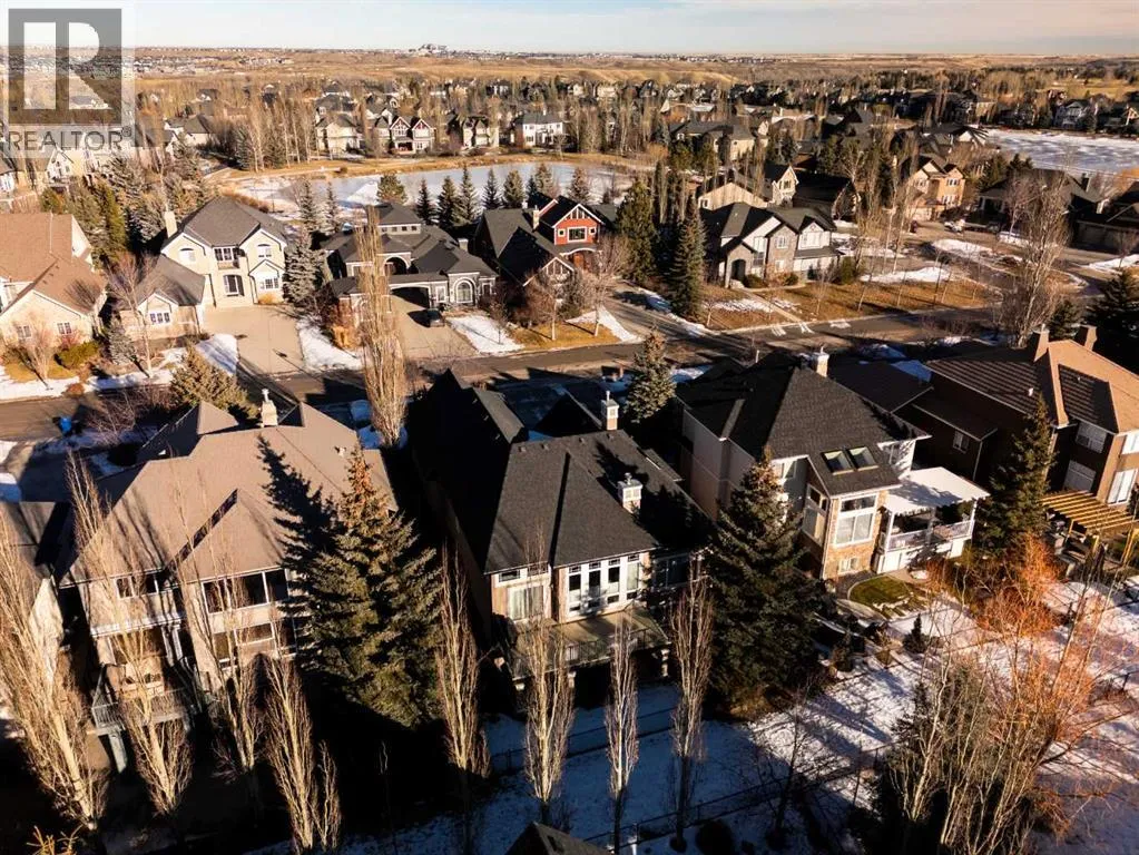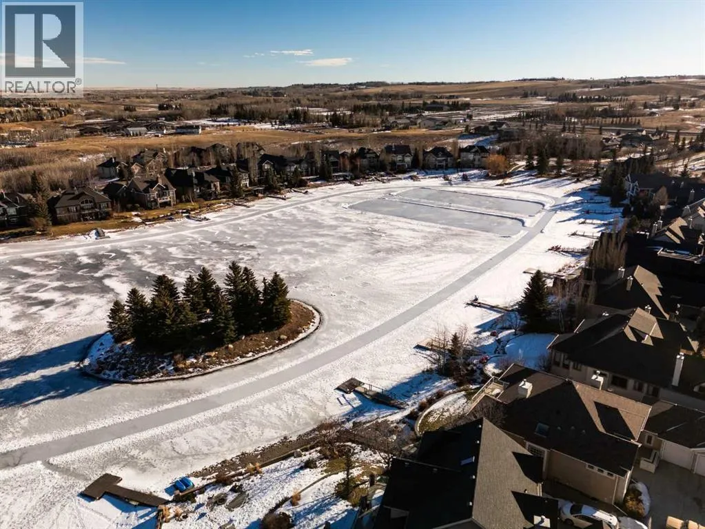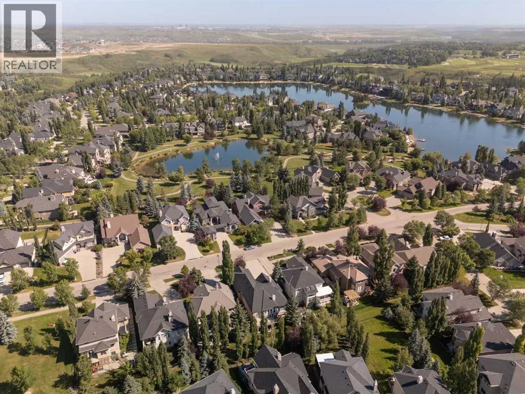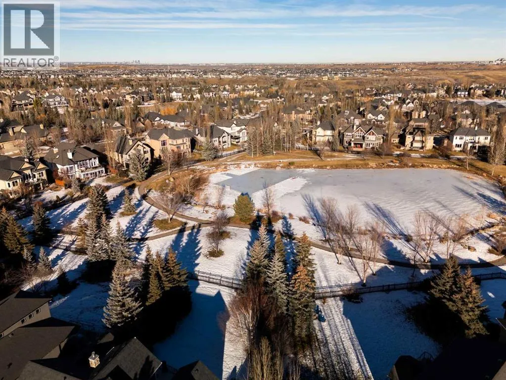 Luxurious, fully finished & beautifully updated, this walkout bungalow showcases exceptional craftsmanship & refined design throughout. Stunning curb appeal sets the tone, highlighted by an oversized double garage with in-floor heating and built-in speakers. Set within the picturesque lake community of Heritage Pointe & backing directly onto green space, the setting delivers privacy, views & a calm connection to nature rarely found so close to the city, with added peace of mind from the communityâs independent water system and a full alarm system. Inside, soaring 12â ceilings & an abundance of natural light elevate the main level, complemented by exotic cherry hardwood flooring & updated lighting for a warm, cohesive flow. A dedicated den with floor-to-ceiling built-ins offers an ideal home office, while a formal dining room framed by tray ceilings creates an elegant setting for hosting with built-in speakers. The open-concept layout unfolds with expansive windows, drawing the outdoors in. At the heart of the home, the chefâs kitchen impresses with granite countertops, custom cabinetry, stainless steel appliances & a large breakfast bar island. Adjacent dining adds everyday flexibility, while patio sliders open to the upper deck for effortless outdoor entertaining. Anchoring the main level, a spectacular living room centers around a striking fireplace with built-in speakers, creating an inviting space to unwind. The private primary suite is a true retreat, featuring a tray ceiling, oversized window, walk-in closet & a beautifully updated ensuite complete with an oversized skylight, deep jetted tub, oversized glass shower, heated floors, built-in speakers & dual vanities. A discreet powder room adds convenience. The walkout lower level is an entertainerâs dream, offering a spacious family room with built-in media area, gas fireplace, integrated storage & elevated seating, with built-in speakers throughout the family room and flex space. A pub-style wet bar with raise d seating & a built-in wine cellar is ideal for entertaining, while an additional flex space suits fitness or hobbies. Two bedrooms & a 4-piece bathroom complete this level. Outdoor living continues with a covered lower patio overlooking green space, complemented by an easy-maintenance west-facing backyard with underground sprinklers and a garden shed. Located in sought-after Heritage Pointe, residents enjoy access to a private lake with sandy beach, parks, playgrounds & scenic pathways, all close to schools, shopping & dining, making this an exceptional opportunity to experience refined living in a truly special setting. (id:27476)