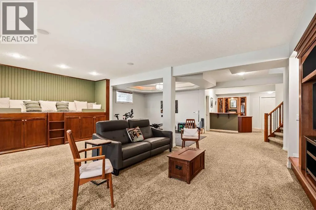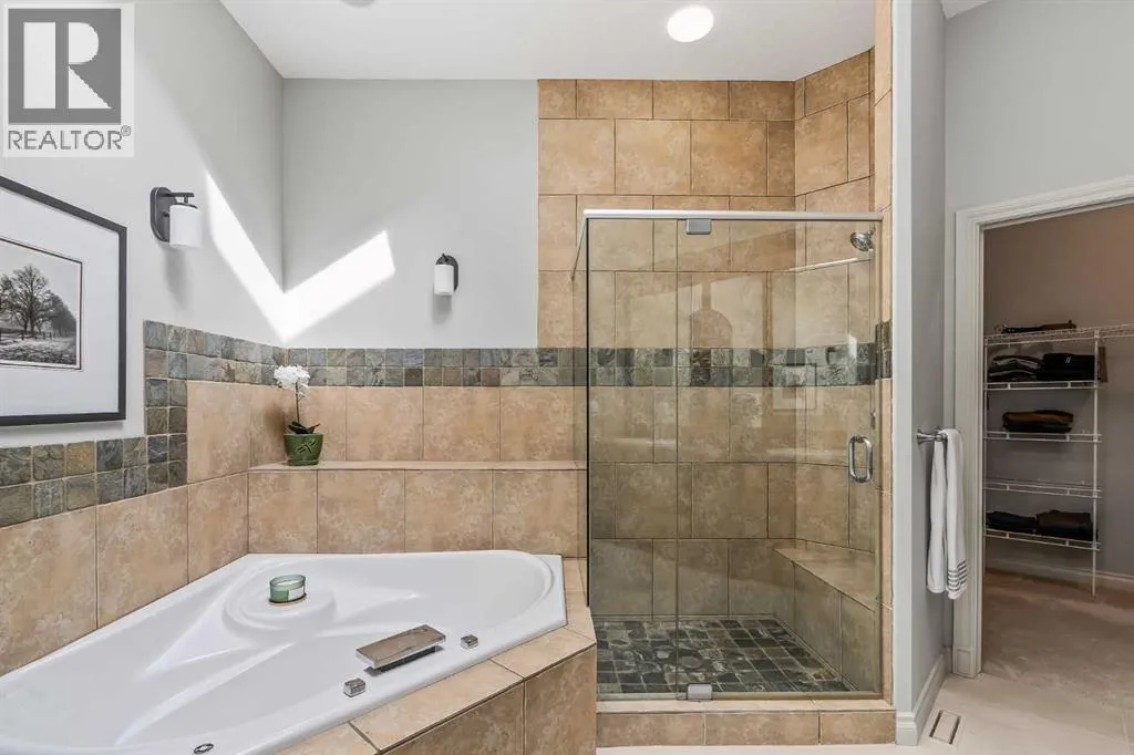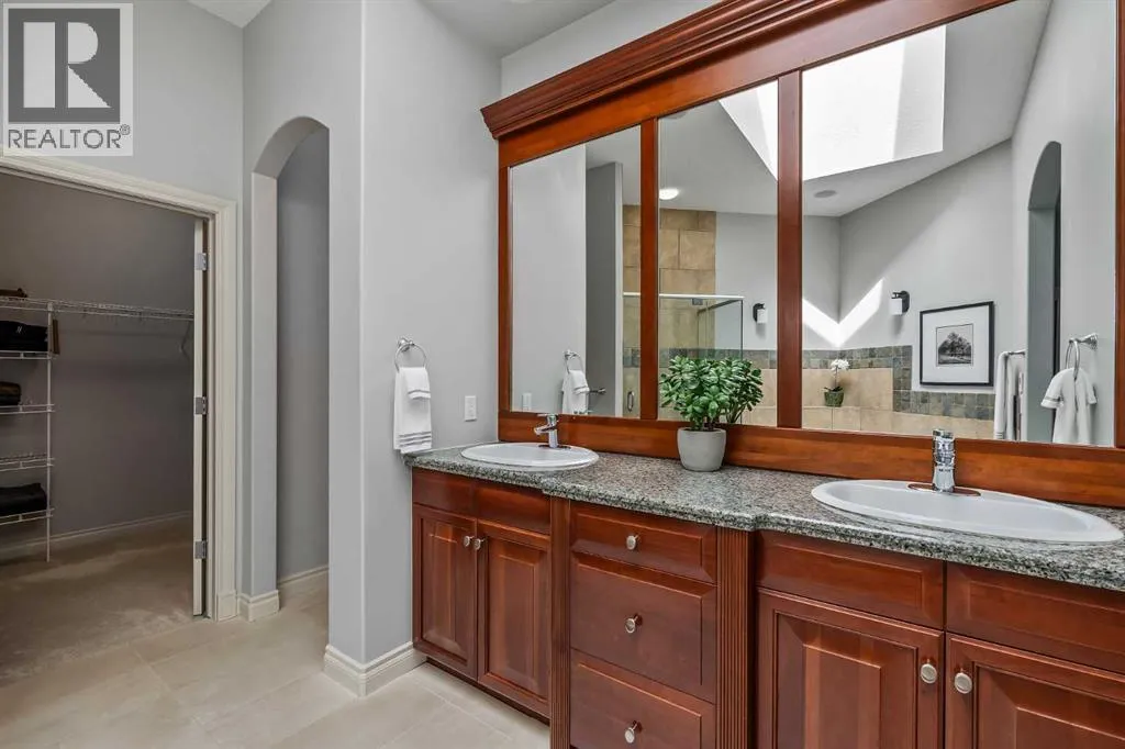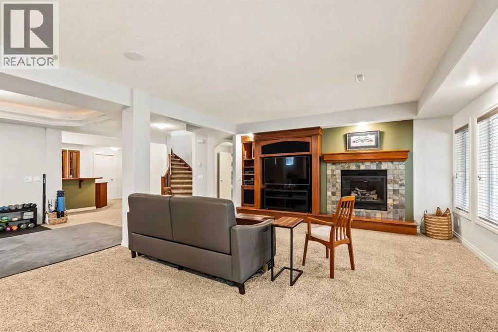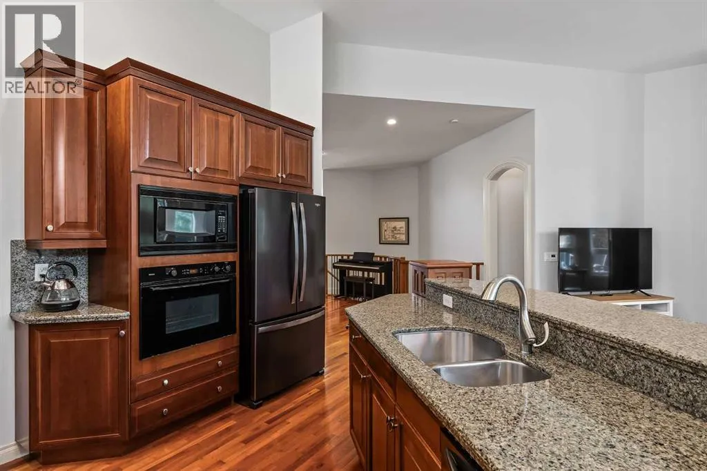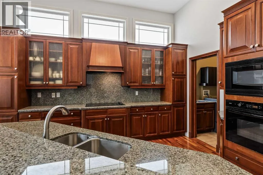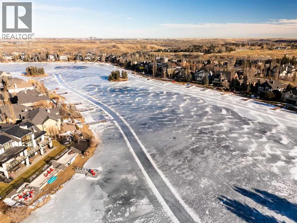 Luxurious, fully finished & beautifully updated, this walkout bungalow showcases exceptional craftsmanship & refined design throughout. Stunning curb appeal sets the tone, highlighted by an oversized double garage with in-floor heating and built-in speakers. Set within the picturesque lake community of Heritage Pointe & backing directly onto green space, the setting delivers privacy, views & a calm connection to nature rarely found so close to the city, with added peace of mind from the communityâs independent water system and a full alarm system. Inside, soaring 12â ceilings & an abundance of natural light elevate the main level, complemented by exotic cherry hardwood flooring & updated lighting for a warm, cohesive flow. A dedicated den with floor-to-ceiling built-ins offers an ideal home office, while a formal dining room framed by tray ceilings creates an elegant setting for hosting with built-in speakers. The open-concept layout unfolds with expansive windows, drawing the outdoors in. At the heart of the home, the chefâs kitchen impresses with granite countertops, custom cabinetry, stainless steel appliances & a large breakfast bar island. Adjacent dining adds everyday flexibility, while patio sliders open to the upper deck for effortless outdoor entertaining. Anchoring the main level, a spectacular living room centers around a striking fireplace with built-in speakers, creating an inviting space to unwind. The private primary suite is a true retreat, featuring a tray ceiling, oversized window, walk-in closet & a beautifully updated ensuite complete with an oversized skylight, deep jetted tub, oversized glass shower, heated floors, built-in speakers & dual vanities. A discreet powder room adds convenience. The walkout lower level is an entertainerâs dream, offering a spacious family room with built-in media area, gas fireplace, integrated storage & elevated seating, with built-in speakers throughout the family room and flex space. A pub-style wet bar with raise d seating & a built-in wine cellar is ideal for entertaining, while an additional flex space suits fitness or hobbies. Two bedrooms & a 4-piece bathroom complete this level. Outdoor living continues with a covered lower patio overlooking green space, complemented by an easy-maintenance west-facing backyard with underground sprinklers and a garden shed. Located in sought-after Heritage Pointe, residents enjoy access to a private lake with sandy beach, parks, playgrounds & scenic pathways, all close to schools, shopping & dining, making this an exceptional opportunity to experience refined living in a truly special setting. (id:27476)