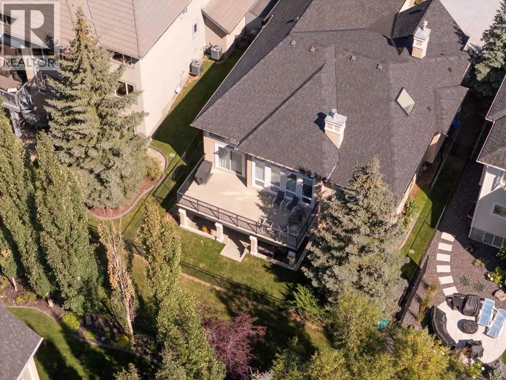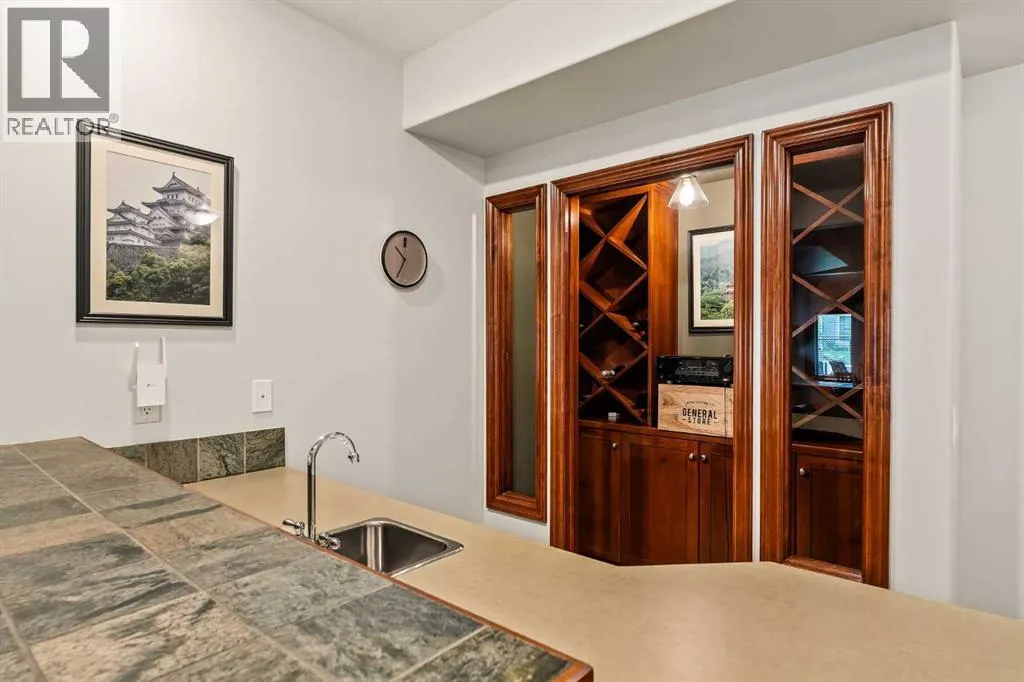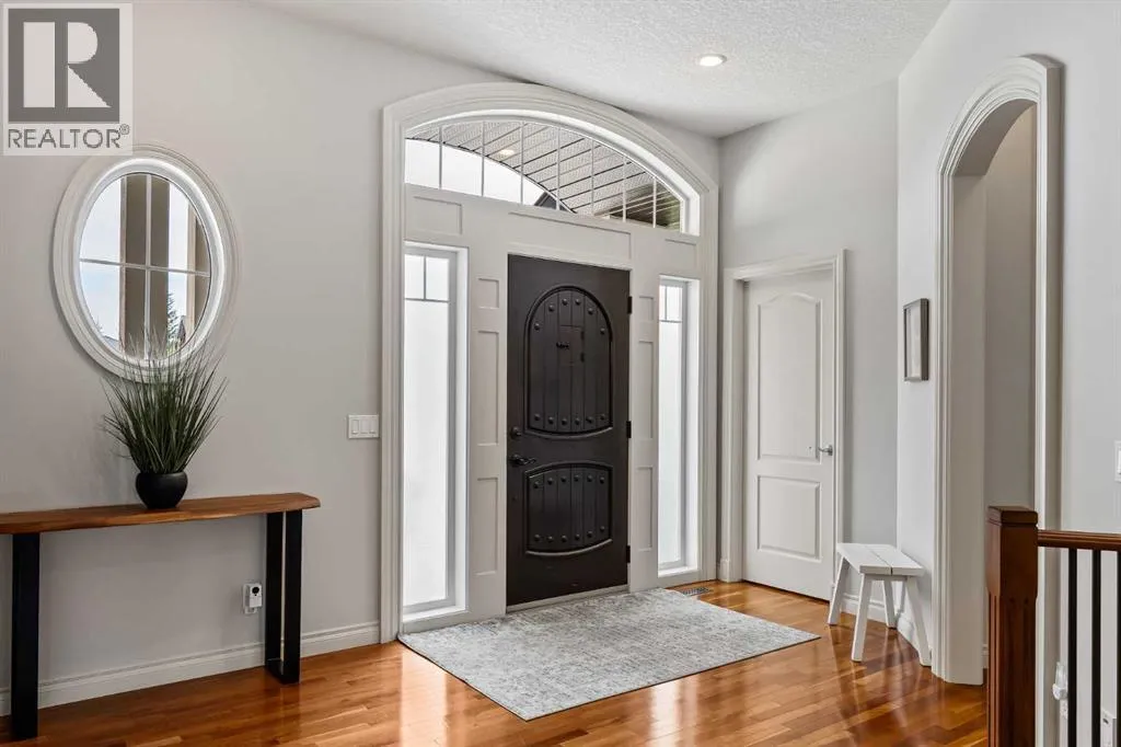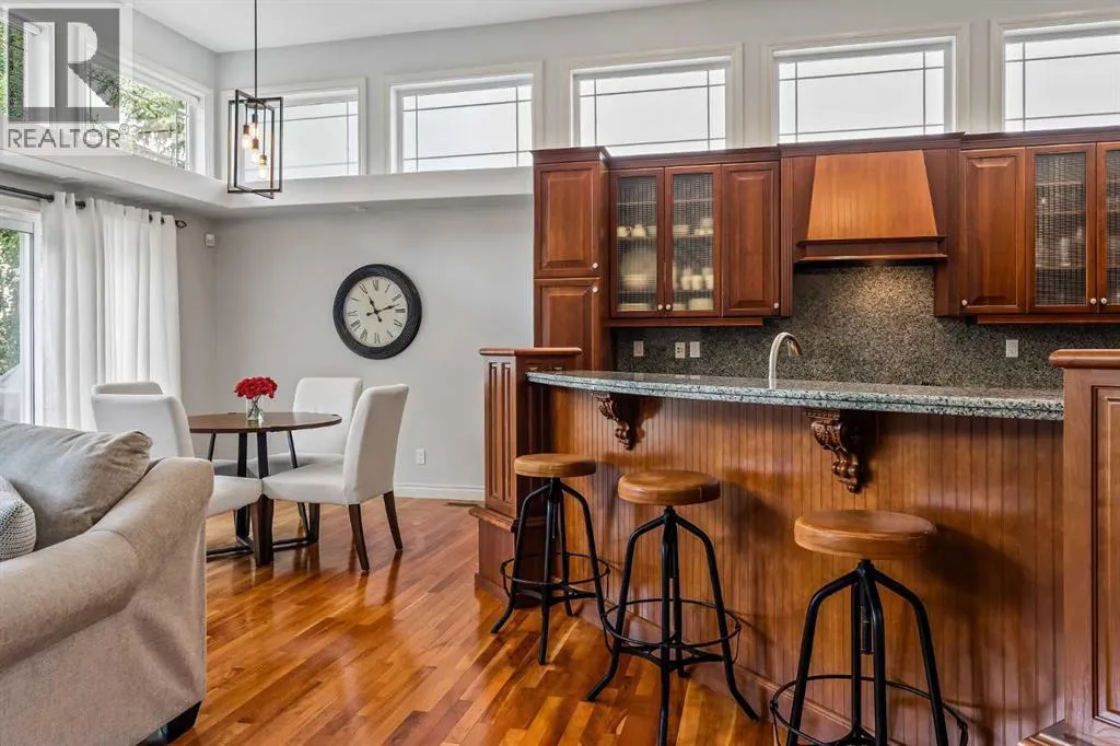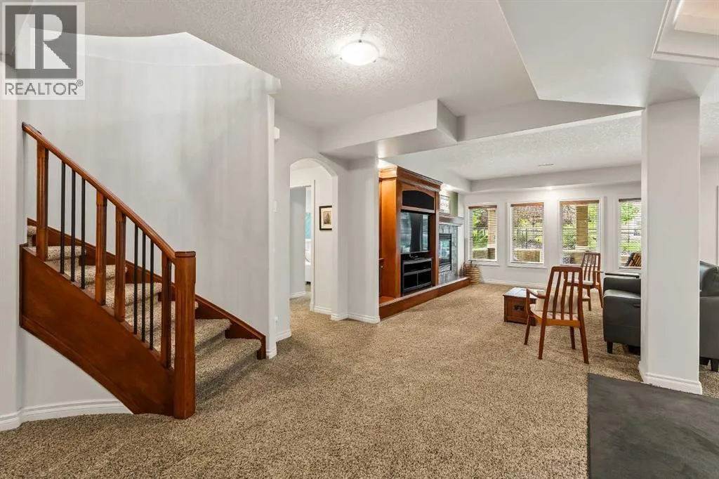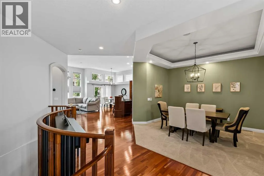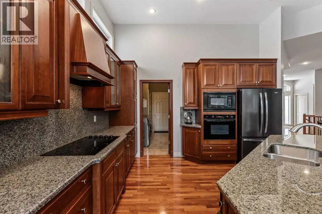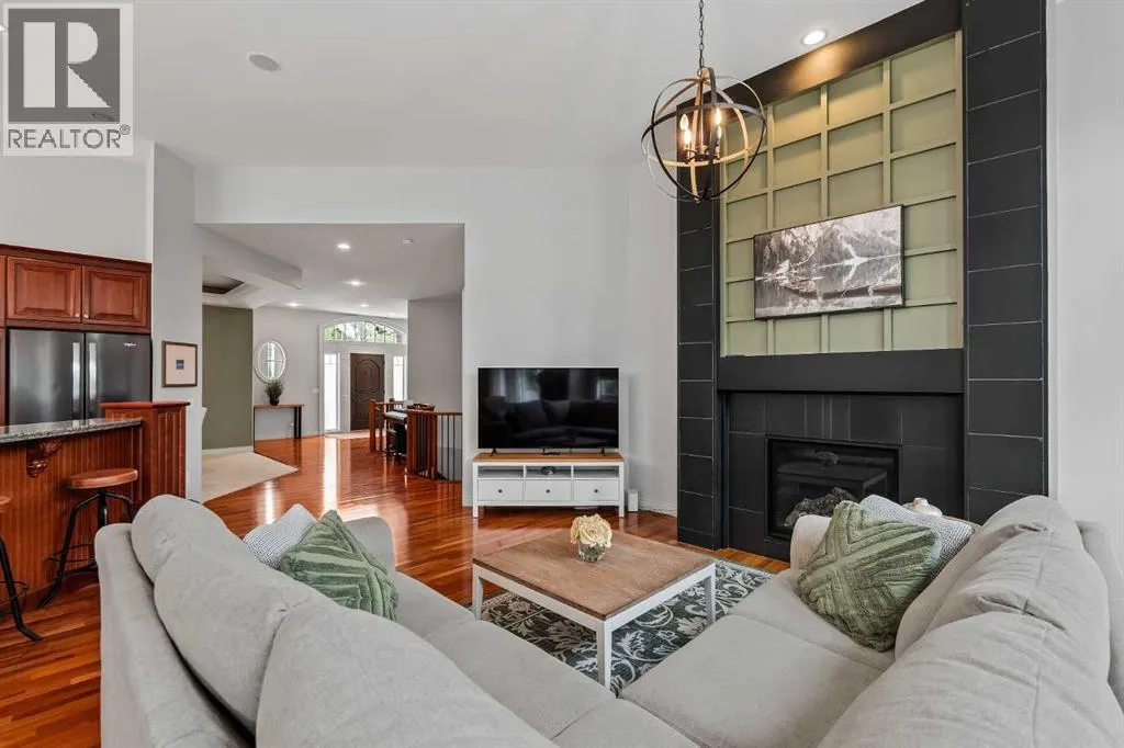Luxurious, fully finished & beautifully updated, this walkout bungalow showcases exceptional craftsmanship & refined design throughout. Stunning curb appeal sets the tone, highlighted by an oversized double garage with in-floor heating and built-in speakers. Set within the picturesque lake community of Heritage Pointe & backing directly onto green space, the setting delivers privacy, views & a calm connection to nature rarely found so close to the city, with added peace of mind from the communityâs independent water system and a full alarm system. Inside, soaring 12â ceilings & an abundance of natural light elevate the main level, complemented by exotic cherry hardwood flooring & updated lighting for a warm, cohesive flow. A dedicated den with floor-to-ceiling built-ins offers an ideal home office, while a formal dining room framed by tray ceilings creates an elegant setting for hosting with built-in speakers. The open-concept layout unfolds with expansive windows, drawing the outdoors in. At the heart of the home, the chefâs kitchen impresses with granite countertops, custom cabinetry, stainless steel appliances & a large breakfast bar island. Adjacent dining adds everyday flexibility, while patio sliders open to the upper deck for effortless outdoor entertaining. Anchoring the main level, a spectacular living room centers around a striking fireplace with built-in speakers, creating an inviting space to unwind. The private primary suite is a true retreat, featuring a tray ceiling, oversized window, walk-in closet & a beautifully updated ensuite complete with an oversized skylight, deep jetted tub, oversized glass shower, heated floors, built-in speakers & dual vanities. A discreet powder room adds convenience. The walkout lower level is an entertainerâs dream, offering a spacious family room with built-in media area, gas fireplace, integrated storage & elevated seating, with built-in speakers throughout the family room and flex space. A pub-style wet bar with raise d seating & a built-in wine cellar is ideal for entertaining, while an additional flex space suits fitness or hobbies. Two bedrooms & a 4-piece bathroom complete this level. Outdoor living continues with a covered lower patio overlooking green space, complemented by an easy-maintenance west-facing backyard with underground sprinklers and a garden shed. Located in sought-after Heritage Pointe, residents enjoy access to a private lake with sandy beach, parks, playgrounds & scenic pathways, all close to schools, shopping & dining, making this an exceptional opportunity to experience refined living in a truly special setting. (id:27476)