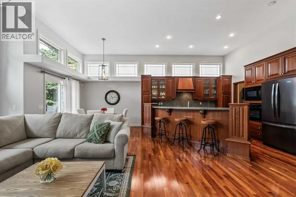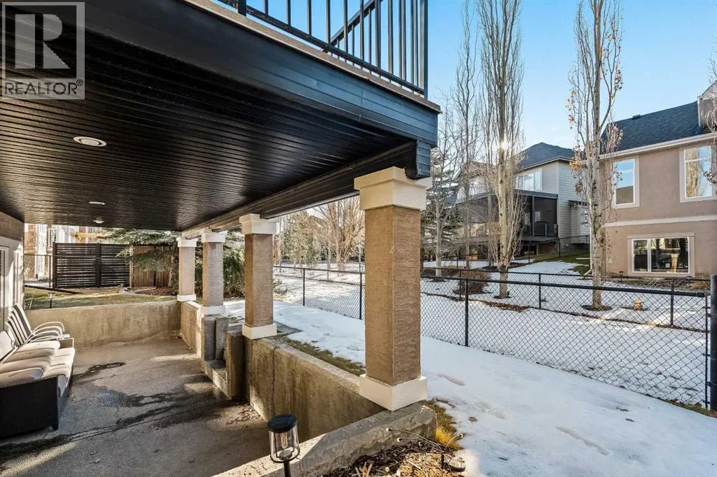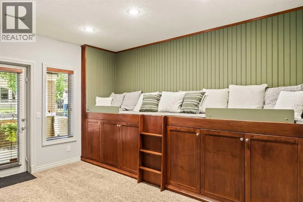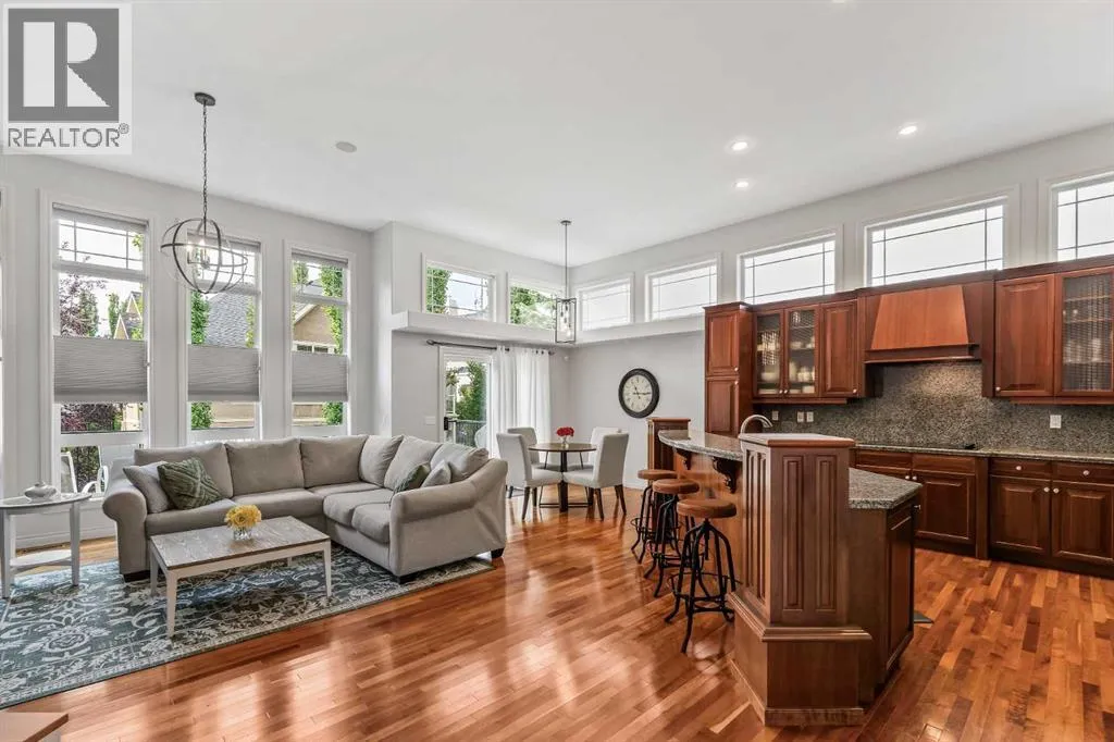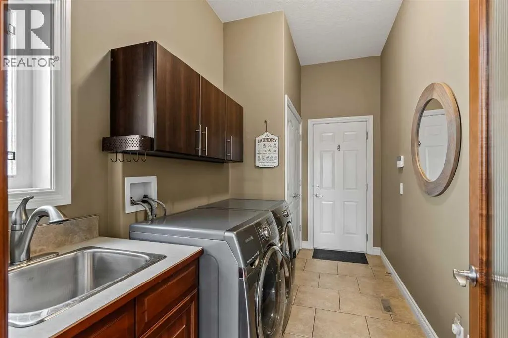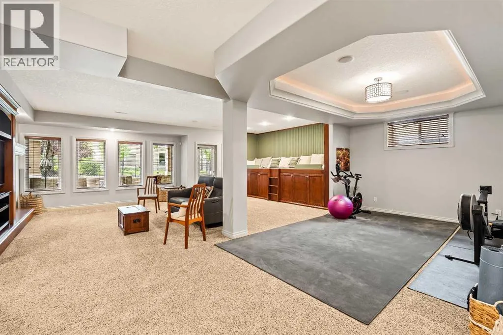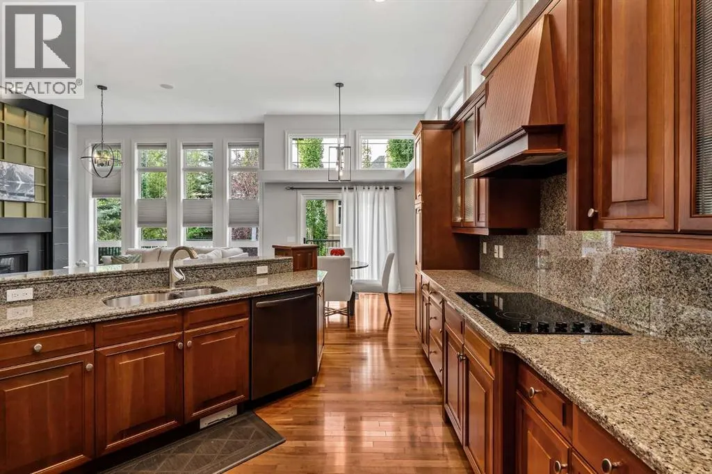 Luxurious, fully finished & beautifully updated, this walkout bungalow showcases exceptional craftsmanship & refined design throughout. Stunning curb appeal sets the tone, highlighted by an oversized double garage with in-floor heating and built-in speakers. Set within the picturesque lake community of Heritage Pointe & backing directly onto green space, the setting delivers privacy, views & a calm connection to nature rarely found so close to the city, with added peace of mind from the communityâs independent water system and a full alarm system. Inside, soaring 12â ceilings & an abundance of natural light elevate the main level, complemented by exotic cherry hardwood flooring & updated lighting for a warm, cohesive flow. A dedicated den with floor-to-ceiling built-ins offers an ideal home office, while a formal dining room framed by tray ceilings creates an elegant setting for hosting with built-in speakers. The open-concept layout unfolds with expansive windows, drawing the outdoors in. At the heart of the home, the chefâs kitchen impresses with granite countertops, custom cabinetry, stainless steel appliances & a large breakfast bar island. Adjacent dining adds everyday flexibility, while patio sliders open to the upper deck for effortless outdoor entertaining. Anchoring the main level, a spectacular living room centers around a striking fireplace with built-in speakers, creating an inviting space to unwind. The private primary suite is a true retreat, featuring a tray ceiling, oversized window, walk-in closet & a beautifully updated ensuite complete with an oversized skylight, deep jetted tub, oversized glass shower, heated floors, built-in speakers & dual vanities. A discreet powder room adds convenience. The walkout lower level is an entertainerâs dream, offering a spacious family room with built-in media area, gas fireplace, integrated storage & elevated seating, with built-in speakers throughout the family room and flex space. A pub-style wet bar with raise d seating & a built-in wine cellar is ideal for entertaining, while an additional flex space suits fitness or hobbies. Two bedrooms & a 4-piece bathroom complete this level. Outdoor living continues with a covered lower patio overlooking green space, complemented by an easy-maintenance west-facing backyard with underground sprinklers and a garden shed. Located in sought-after Heritage Pointe, residents enjoy access to a private lake with sandy beach, parks, playgrounds & scenic pathways, all close to schools, shopping & dining, making this an exceptional opportunity to experience refined living in a truly special setting. (id:27476)
