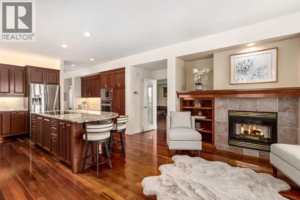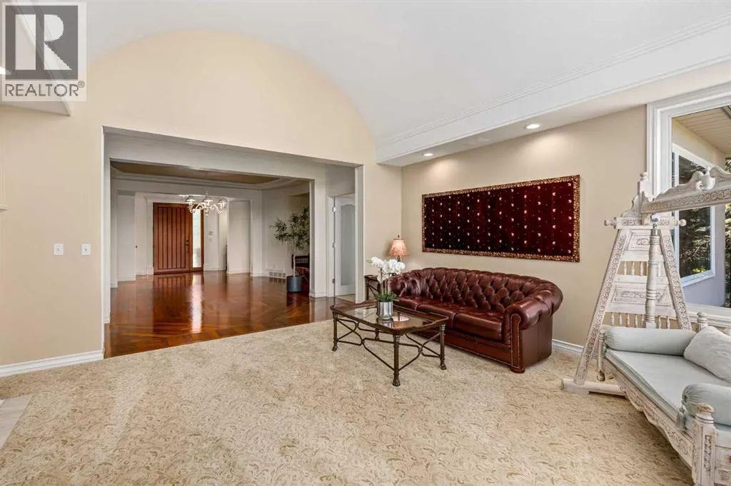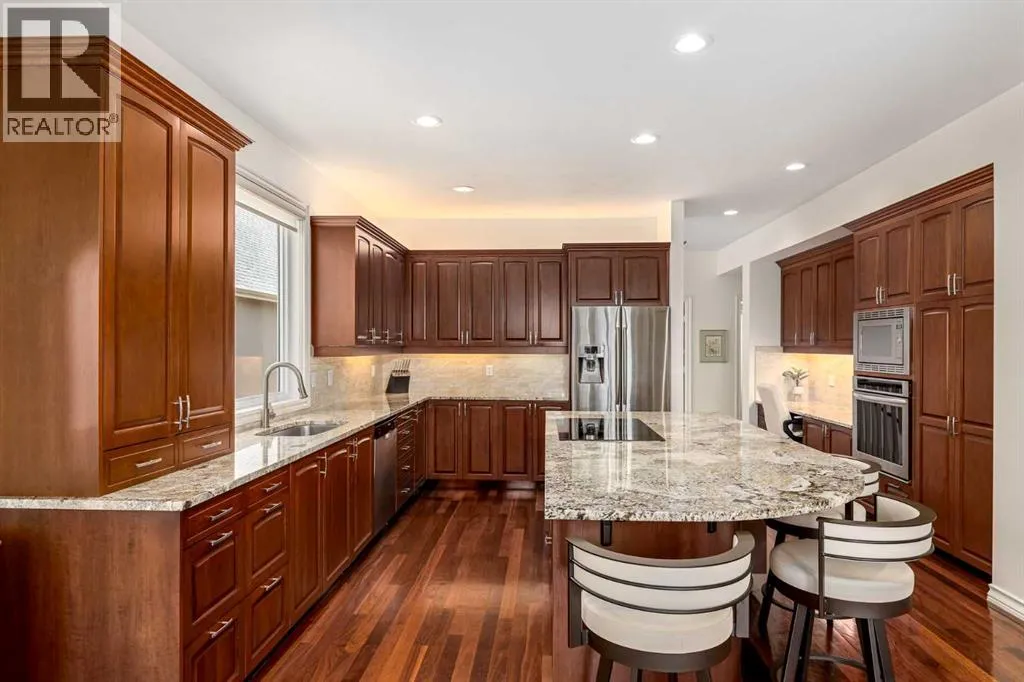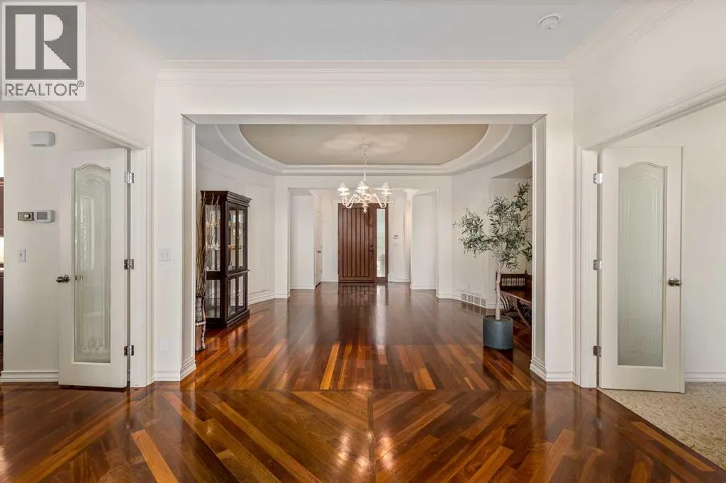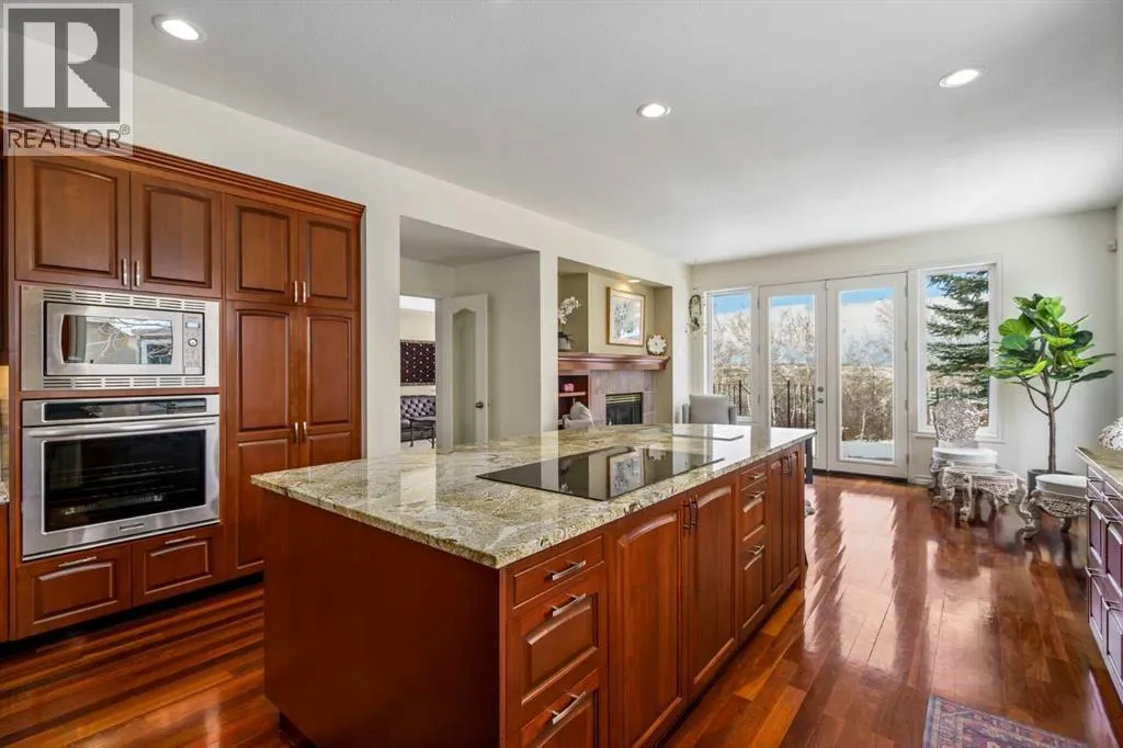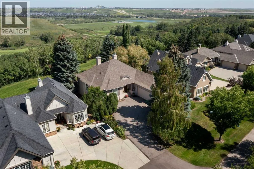 WALKOUT BUNGALOW | 4,700 SQFT OF LUXURY ESTATE LIVING | SNOWBIRD'S DREAM | HEATED TRIPLE GARAGE | BACKING ONTO FOREST & GOLF COURSE | Welcome to 33 Ridge Pointe Drive, an extraordinary estate bungalow set on one of the most prestigious streets in Heritage Pointe. Perfectly positioned on over 0.35 acres, this exceptional walkout residence backs directly onto the forest and golf course, offering a rare combination of privacy, natural beauty, and refined living. With 2,389 SQFT above grade and nearly 4,700 SQFT of total developed living space, this is one of the communityâs most expansive bungalow floorplans â perfectly suited to empty nesters, families, or those who love to entertain. Whether your lifestyle includes morning walks through this spectacular enclave, afternoons on the golf course, or extended time away as a snowbird, this home offers the ultimate lock-and-leave lifestyle, with landscaping and snow removal included for easy, maintenance-free living. The main level is defined by timeless architectural elegance, where rich hardwood flooring, crown molding, and custom millwork complement breathtaking views of the forest behind. A formal dining room provides an elegant setting for hosting, while the spectacular great room showcases soaring barrel-vaulted ceilings, an impressive arched feature window, and a double-sided gas fireplace. The gourmet kitchen features custom cabinetry, premium stainless steel appliances, a large granite island, a built-in wall oven, and a new built-in microwave (2026). French doors from the breakfast nook lead to the expansive full-width patio â one of the largest available â complete with a gas line and the perfect setting for outdoor dining, entertaining, or peaceful mornings surrounded by nature. The luxurious primary retreat offers a spa-inspired ensuite with a freestanding tub, oversized glass shower, dual vanities, and a spacious walk-in closet. A spacious executive main floor office or den â or potential fourth bedroom â adds flexibility for homeowners. A generous laundry and mudroom (finished with new marble tile in 2025) lead to the heated, oversized triple garage with epoxy floors. The stunning fully developed walkout lower level was completely remodelled in 2025 and offers exceptional additional living space. The theatre room, finished with new sound-absorbing paneling (2025), can also serve as a home gym or fifth bedroom. The cedar and cold storage rooms offer ample storage, and the two large bedrooms on the lower level share a Jack-and-Jill 4-piece bath. Significant upgrades include window replacements and kitchen renovation (2015), ensuite renovation (2019), central A/C (2020), dual hot water tanks (2021), new carpeting (2023), and a complete basement remodel (2025). Quietly tucked alongside the golf course and just steps from the clubhouse, this remarkable Heritage Pointe estate offers an unmatched lifestyle of tranquility, community, and natural beauty â all just minutes from Calgaryâs south amenities. (id:27476)