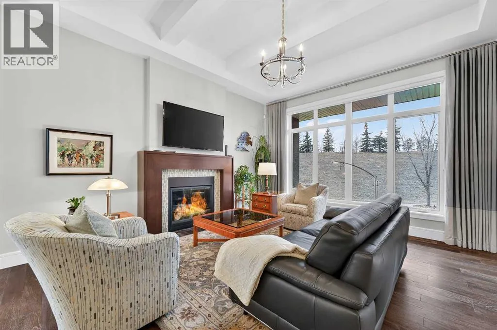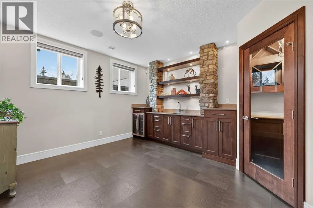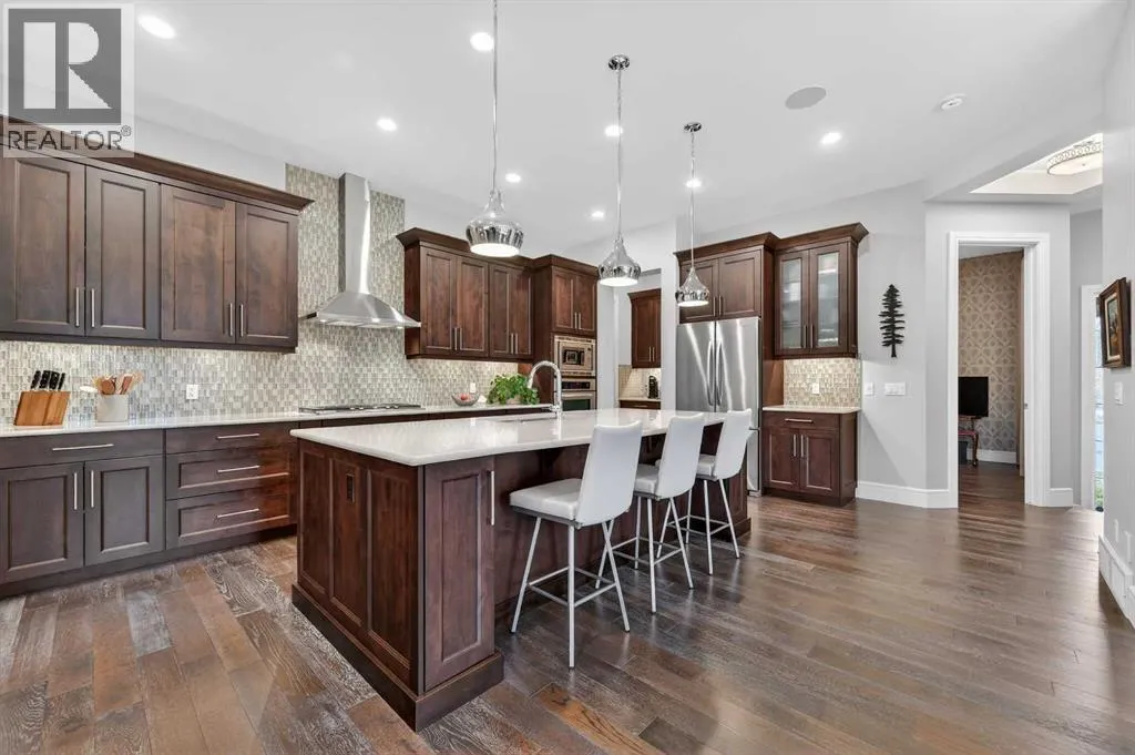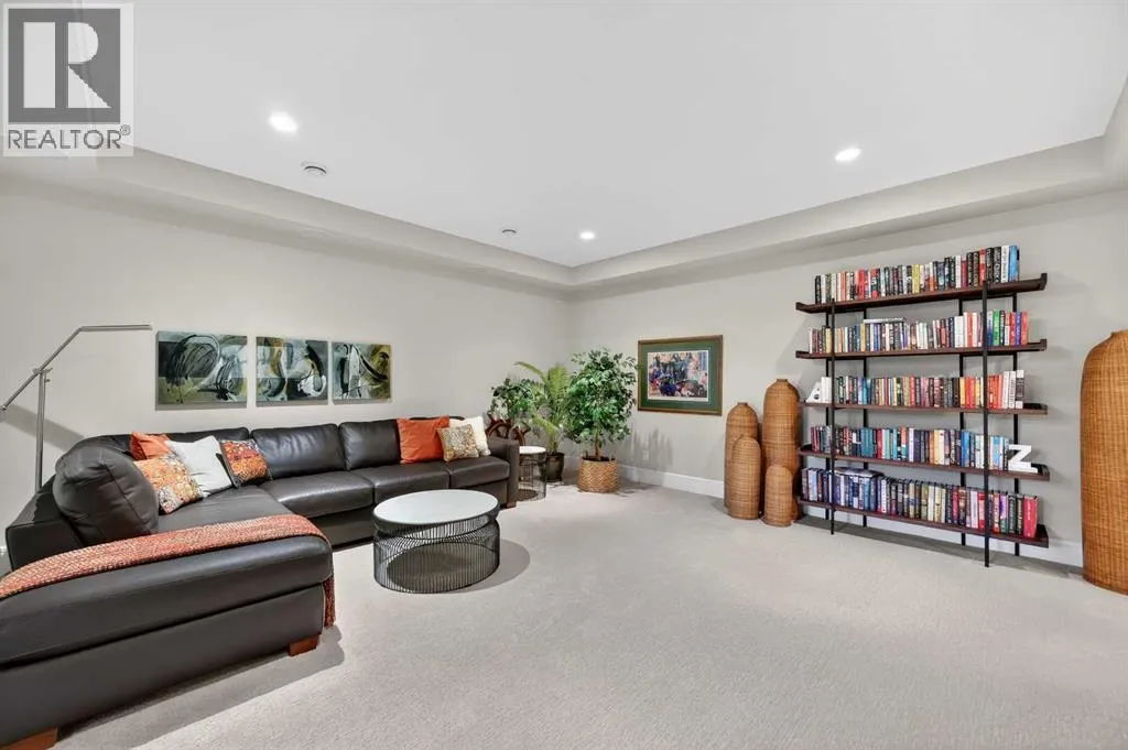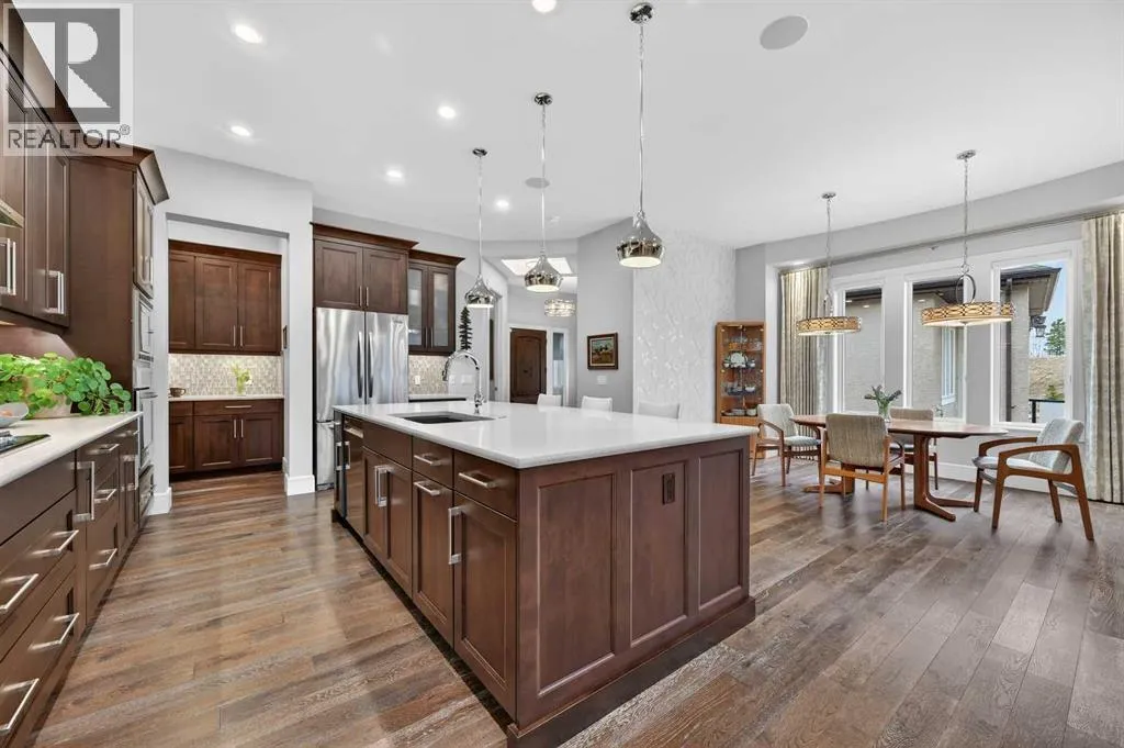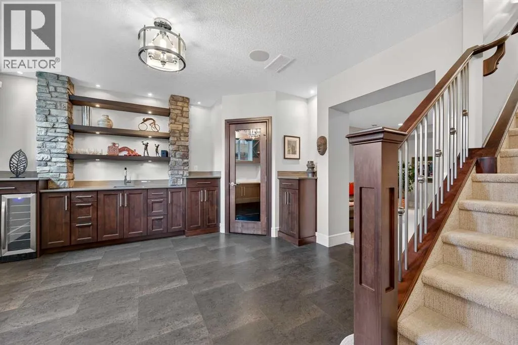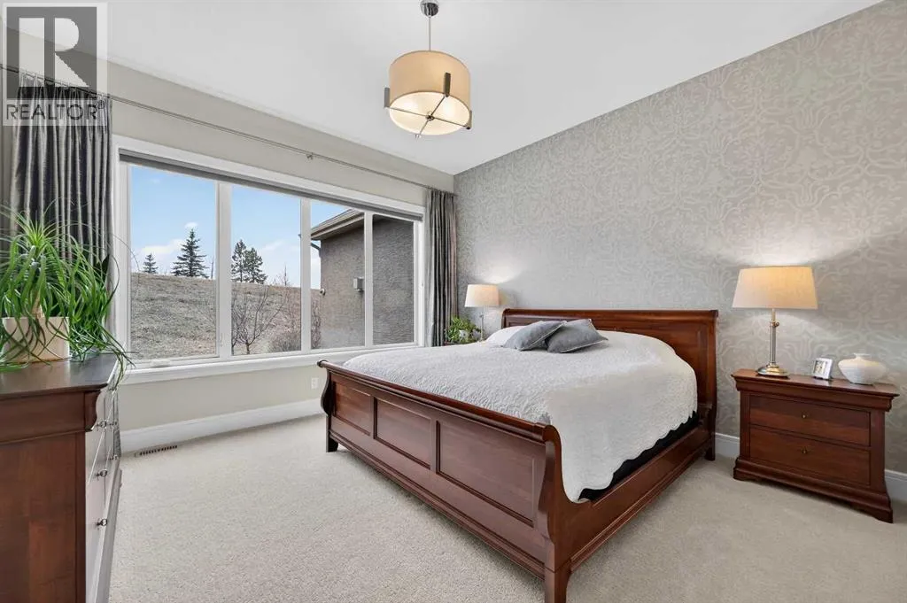 This villa, built by Calbridge Homes, was the original showhome for the complex and features a number of thoughtful upgrades and finishing touches throughout including designer lighting fixtures, Sonos multi-room sound system and a man door into the garage. Set within a quiet enclave of just 36 units, it offers a comfortable, low-maintenance lifestyle in a peaceful setting. The main floor features a bright, open-concept layout filled with natural light and views of green space and a west-facing patio. A warm and inviting living room showcases a gas fireplace, while a spacious dining area flows easily into the kitchenâideal for everyday living and entertaining. The kitchen is well-appointed with a large island, extensive granite countertops, stainless steel appliances and a convenient butlerâs pantry. A private front office or den provides a quiet place to work or relax. Custom drapes, shades, and designer wallpaper add a refined touch throughout. The primary suite is a calm retreat, complete with a 5-piece ensuite featuring dual sinks, a walk-in shower, soaker tub, in-floor heating, and a generous closet. A powder room and a conveniently located laundry room with access to the garage complete the main floor. A bar area just off the living room, with access to the patio, adds to the homeâs functionality. The fully finished lower level offers an entertainment room with as surround sound home theatre with Tannoy speakers, a bar with stone accents plus a wine cellar, three additional bedrooms or flexible spaces, a four-piece bathroom, and a large storage area with room for a workshop. Don't miss this opportunity to embrace luxurious, maintenance-free living in one of the most sought-after villa communities in Heritage Pointe and only a five minute drive to all major amenities. (id:27476)