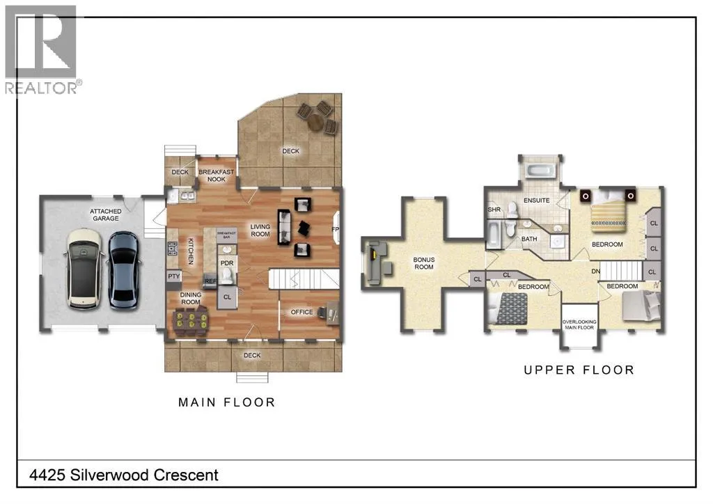 Located on a generous corner lot in the desirable Silverwood Crescent, this custom-built, two-storey home is a true gem in High Prairie, where homes of this stature are a rare find. Constructed in 1996, this 2285-square-foot residence combines functional living with unparalleled outdoor space. Step inside to discover a thoughtfully designed galley kitchen, which offers the benefits of easy workflow and features a convenient pass-through to the formal dining room on one end and a cozy breakfast nook on the otherâcomplete with dedicated space for your coffee pot and toaster. The inviting living area is anchored by a warm, wood-burning fireplace with built-in wood storage and is flooded with natural light from ample windows that frame the stunning backyard views. This room provides access to the composite deck, perfect for entertaining and relaxing. For more intimate outdoor moments, a separate small BBQ deck is easily accessible directly from the breakfast nook. The property itself is an oasis, feeling more like a private acreage than an in-town lot. Spanning almost half an acre, it backs directly onto a creek, offering both privacy and picturesque scenery. Upstairs, you will find three comfortable bedrooms, a main bathroom that conveniently houses the washer and dryer, and a fantastic bonus room over the garage featuring windows that provide a panoramic view of the entire street. The home's potential extends into the full, partially finished basement, currently being used as a fun recreation space or ready to be transformed with future bedrooms, and is complemented by a heated, attached double garage. (id:27476)