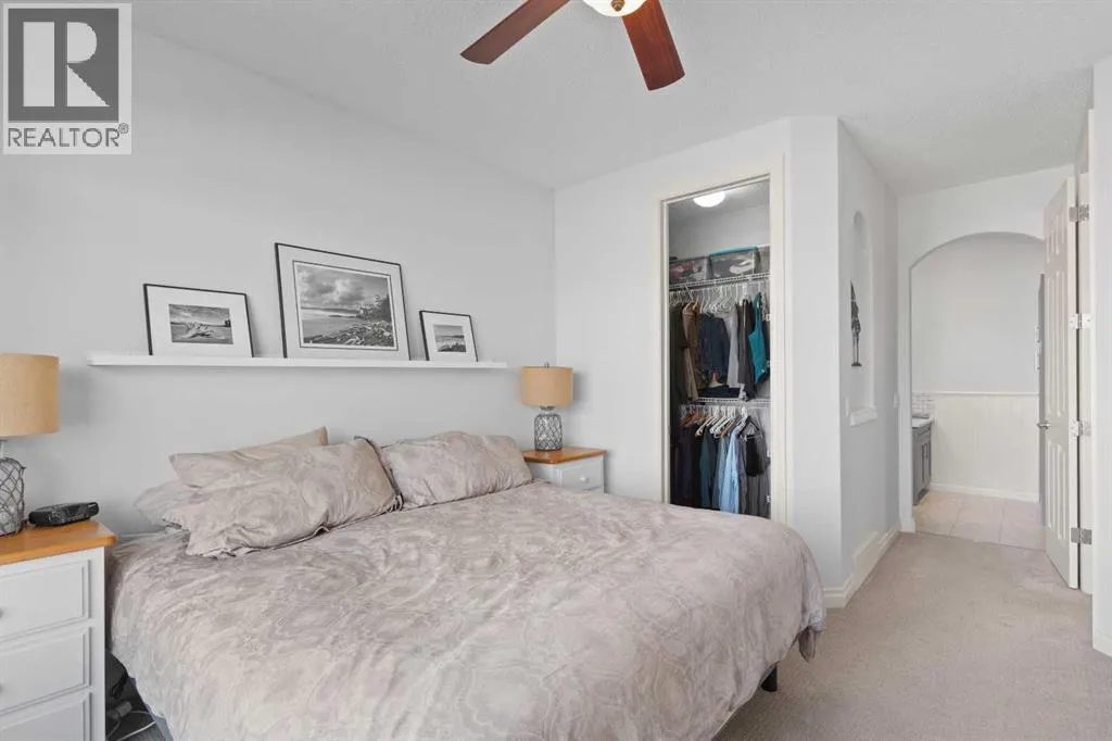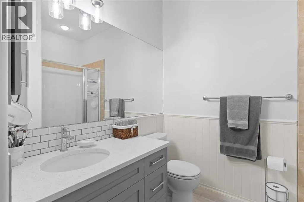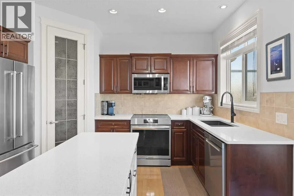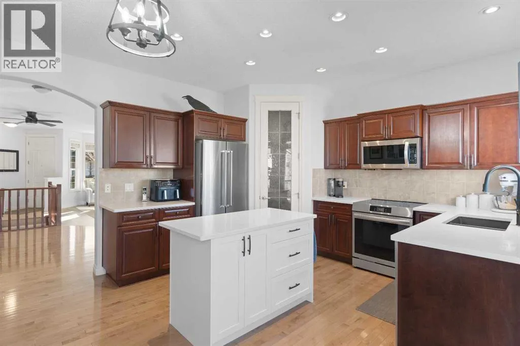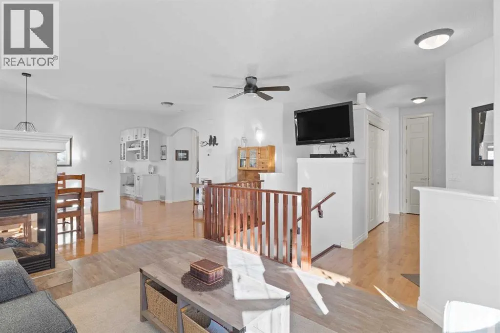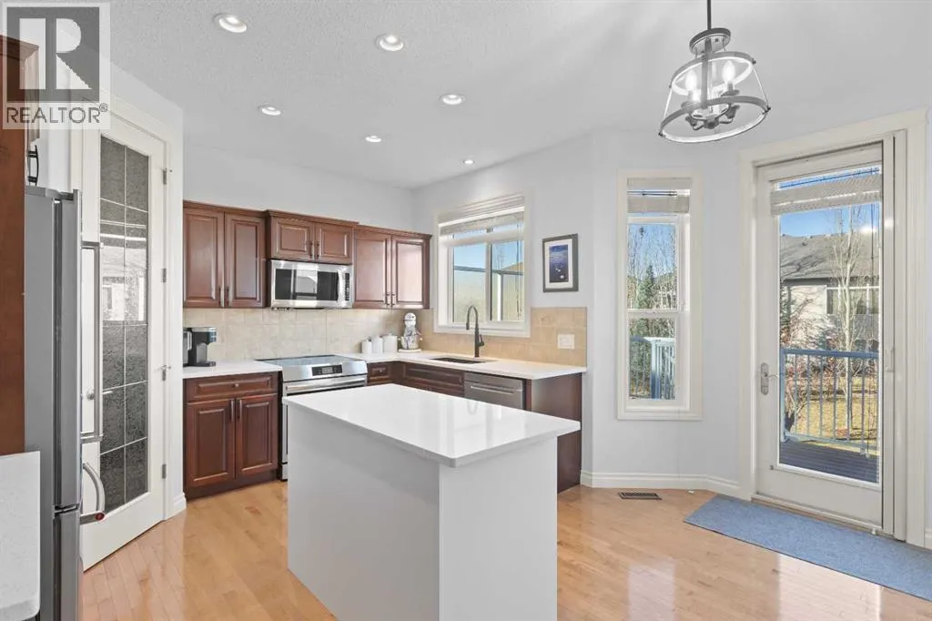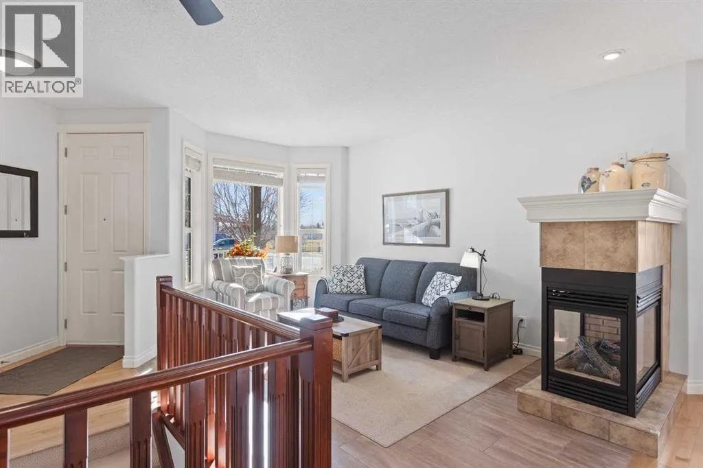 This 1340 sq ft villa is bright and fresh with a lot of natural light, and is in excellent condition. The living room and dining room are open and have quality authentic hardwood floors and a gas fireplace. The kitchen is beautifully renovated with quartz counters and new appliances, and has a big island and lots of cupboards and counter space plus a pantry. Also on the main floor is a laundry room with built-in cabinets, a two-piece washroom, and a flex room for an office, TV or hobbies. An 18x12â primary bedroom has a large walk-in closet and an updated ensuite with two separate vanities. The fully developed lower level has full sized windows and includes a big guest bedroom, a four-piece washroom, 28â x 16â family room with a gas woodstove, and plenty of storage. An East-facing front verandah is perfect for morning sun, and a private 10x13â deck overlooks the greenspace in the back. Extras in this home include new central AC and wiring set up for connecting to a generator, a water softener and the water heater was just repaced. The double attached garage has a lot of built-in storage, a workbench, and excellent lighting. Please click the multimedia tab for an interactive virtual 3D tour and floor plans. (id:27476)