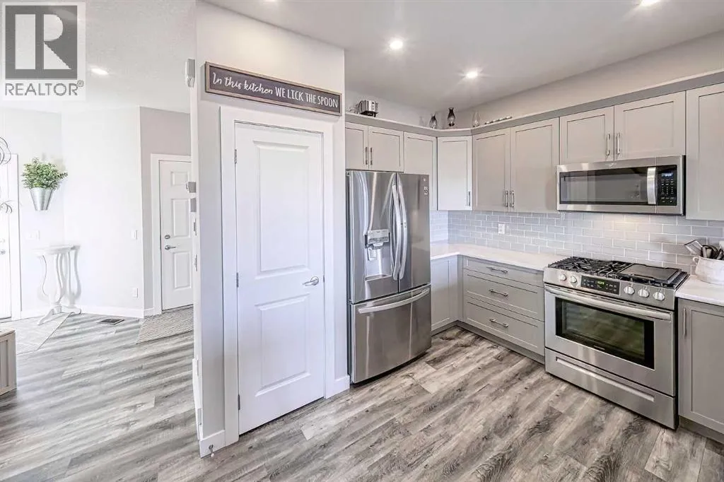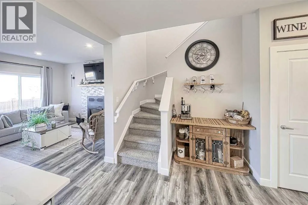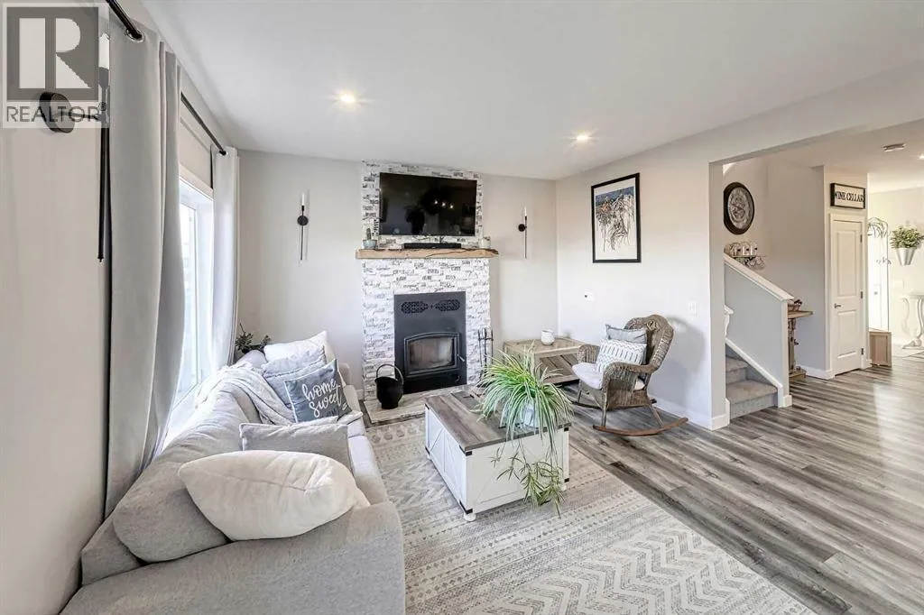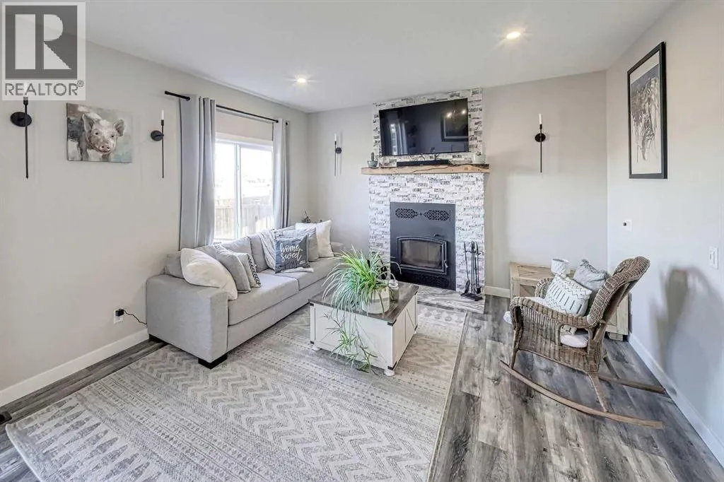Clean, clean, clean home that is bright, welcoming and fully finished. This Timber Creek built home has 4 bedrooms, 3.5 bathrooms, high ceilings and flows seamlessly throughout. The main floor has an open concept kitchen/living room. The kitchen has stainless steel appliances, which include a gas stove, tons of counter space with quartz counter tops, cabinets and room to entertain. The living room has a large window that will give you all the natural light you would desire and, in the winter, snuggle by the wood fireplace, read a book, watch tv or meditate. Upstairs, the east-facing primary bedroom features an electric fireplace, walk-in closet, 4-piece ensuite with tile flooring and quartz counters. The laundry room on the upper level adds to the everyday convenience. The 2nd and 3rd bedrooms finish the upper level. Downstairs, the finished basement has another family room, the 4th bedroom, 4 pce bath and a large utility/storage room. Enjoy Tankless hot water heater and a separate entrance to the basement. High River is a fantastic place to live, easy travels to Shopping, Schools, Parks, Walking Paths, George Lane Park, Recreation Center, Hospital, Medical/Dental Centers, Wales Theatre, "Take-Out", Golf, and a short drive to the, Drive-In Theatre/Rodeo Grounds and so much more. 25(ish) minutes to Calgary and 20(ish)minutes to Okotoks. (id:27476)