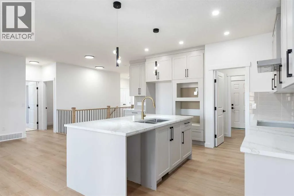 This is a rare family sized bungalow with four big bedrooms and a triple attached garage. It is a fully finished 1507 sq ft walkout home in a great area overlooking a beautiful waterway and park, and it has premium finishes throughout. The main floor is a modern open plan with a large entry hall, 9â ceilings, high quality flooring, and a covered 24â x 10â deck. The kitchen includes cabinets to the ceiling, quartz counters, under-mount sink, countertop lighting, select tiles, a large walk-in pantry and all appliances are included. Also on the main floor is the spacious and open living / dining room, the primary bedroom, a laundry room, and a second bedroom or office. Deluxe appointments in the master suite include built in cabinetry in the walk-in closet, an big vanity with double sinks, and a soaker tub plus a 6' shower. The lower level has two more spacious bedrooms and a very big family room with a built-in wet bar. All rooms in this home have lots of natural light, and there are many extras including a 24â x 10â patio, two fireplaces, full concrete steps and a Hardieboard exterior. Click the multimedia link for a virtual interactive 3D tour, plus floor plans and professional pictures. (id:27476)