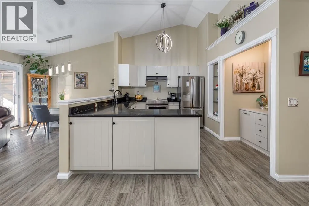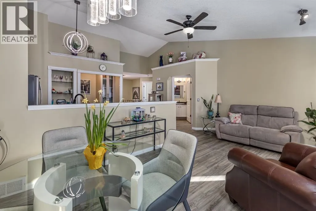 Welcome to this beautifully renovated, fully developed, move-in-ready bungalow villa in the highly sought-after 55+ community of Polo Park in High River, just moments from the Highwood Golf Course and clubhouse. Offering over 1,800 sq. ft. of thoughtfully finished living space and approximately $200,000 in upgrades, this 2+1 bedroom, 2.5 bathroom home with a finished single-car garage blends upscale comfort with effortless living. The bright, open main floor showcases vaulted ceilings, and a stunning chef-inspired kitchen featuring elegant quartz countertops, soft-close cabinetry, abundant storage, and premium appliances including a KitchenAid stove, Bosch dishwasher, and LG refrigerator â perfectly designed for both everyday living and stylish entertaining. Extensive upgrades include new doors and windows, luxury vinyl plank flooring throughout, knockdown ceilings on the main level, custom wrought-iron railing, and a new garage door. The roof was replaced in 2020. Comfort is elevated with central air conditioning, central vacuum, a Lennox furnace (2014), and a new hot water tank (2023). Additional highlights such as Phantom screens, California Closets, a GE washer and dryer, a water softener & Reverse Osmosis system add convenience and refined functionality. A rare opportunity to own a turnkey bungalow in High Riverâs desirable golf course community. (id:27476)