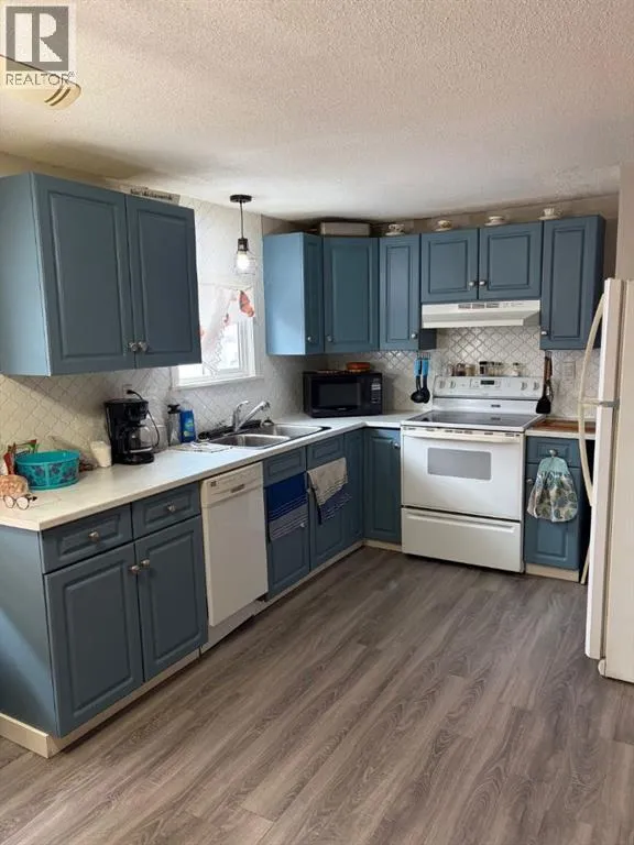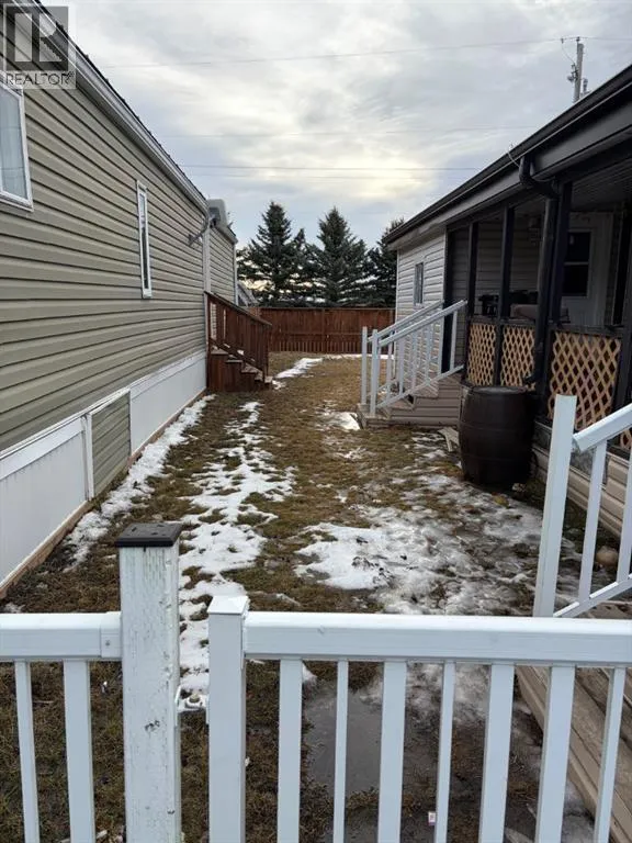 Renovated 2 bedroom, 1 bathroom mobile in High River Village. There is a covered veranda with plenty of room for outdoor patio furniture and a mudroom entry in addition to the main entry. This home has durable vinyl plank throughout. The living room had a door added onto it to accommodate a 3rd tenant, but can easily be removed to its original state. The updated kitchen and dining area is spacious and there is also a built-in serving hutch / coffee bar with additional storage and counter space. The 5pc bathroom has dual vanities, shower/tub combo, toilet and also houses the washing machine. It resides in between the 2 bedrooms and there is a "cheater door" into the primary bedroom. The primary bedroom has bifold doors into a good sized closet. Outside the yard is fully fenced and there is a garden shed for any additional storage needs. Pad rent is currently set at $956/mo and includes water/sewer, garbage removal, and snow plowing of common roadways. Move into this one and make it Your Home, Your Castle. (id:27476)