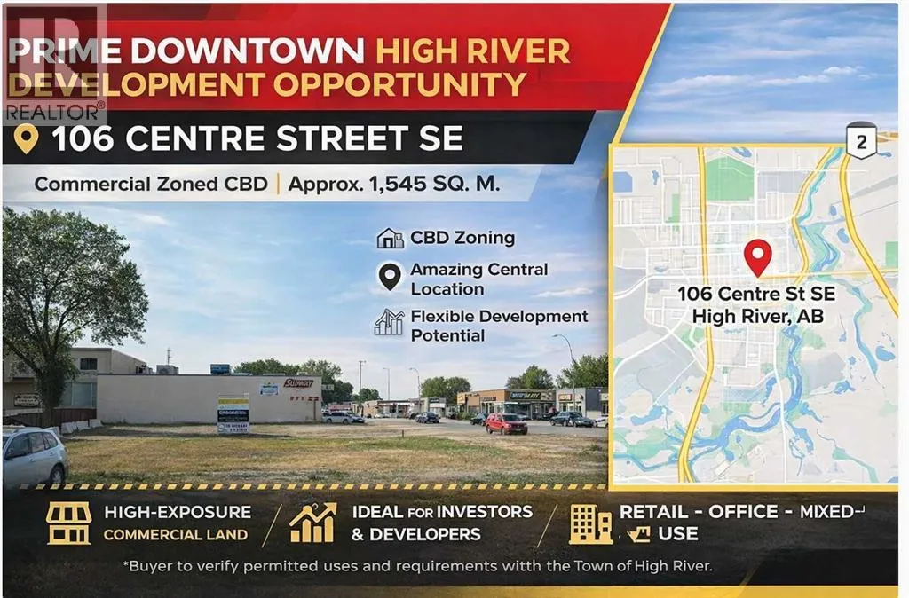 Prime downtown High River development opportunity at 106 Centre Street SE. Located in the Central Business District (CBD), this high-visibility commercial parcel offers exceptional potential for retail, office, restaurant, mixed-use, residential above commercial, and other approved downtown uses. Titled land area of approximately 1,545 sq. m., legally described as Plan 2245E, Block 8, Lots 1â4. A rare chance to secure a strategic site in High Riverâs core with strong future development potential. Permitted uses and development requirements can be checked with the Town of High River. (id:27476)