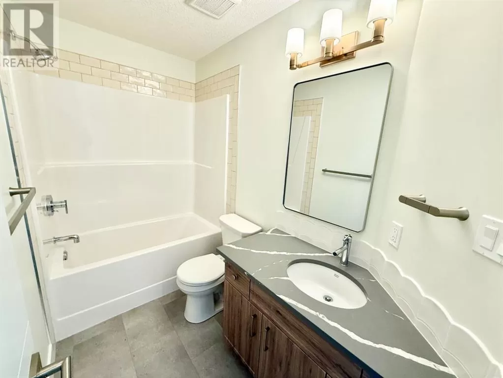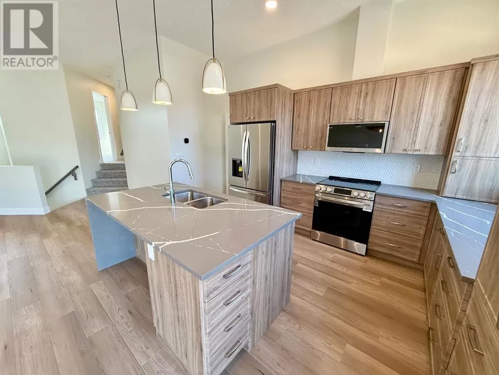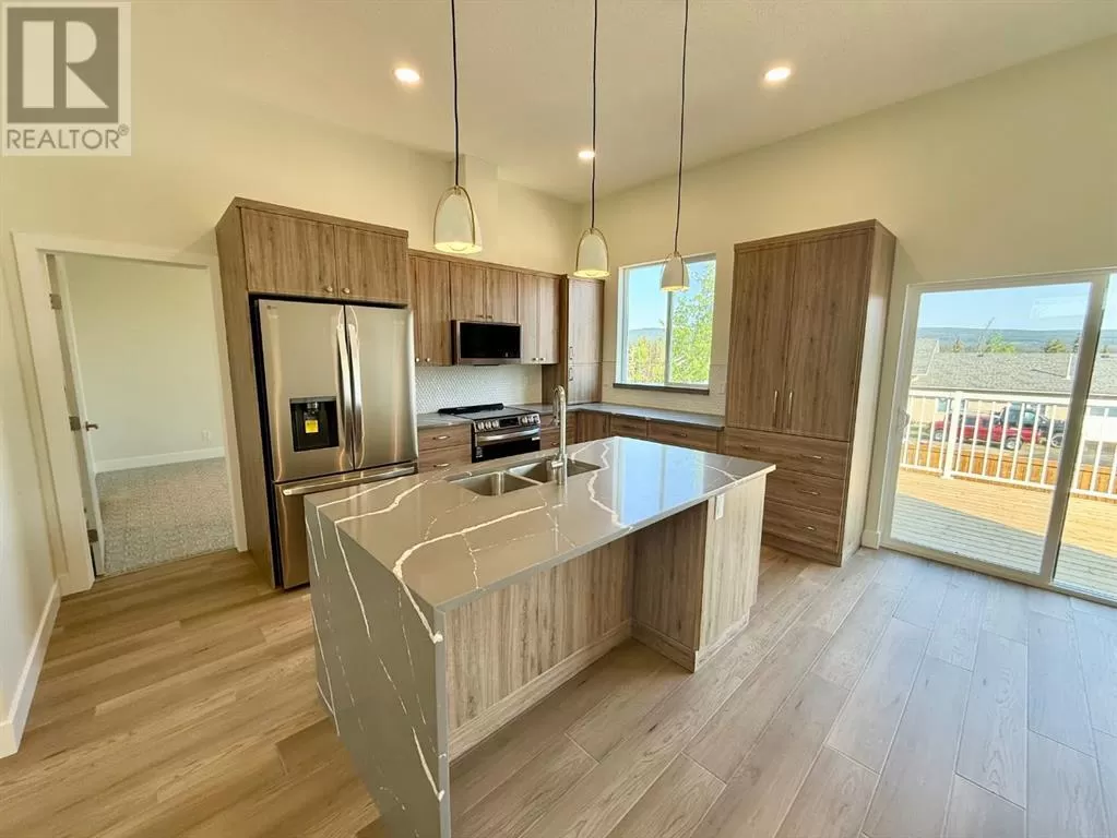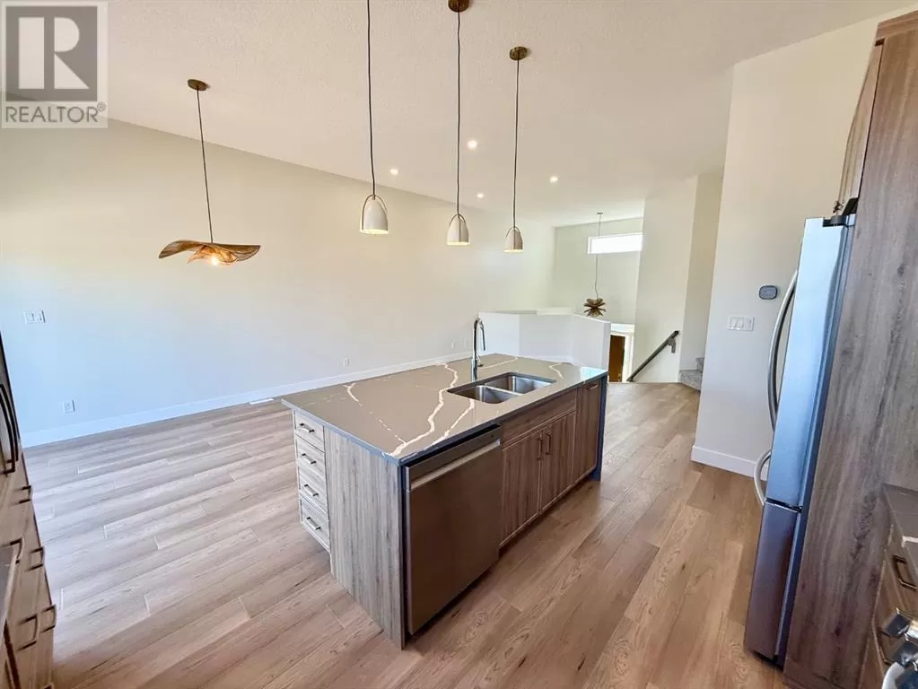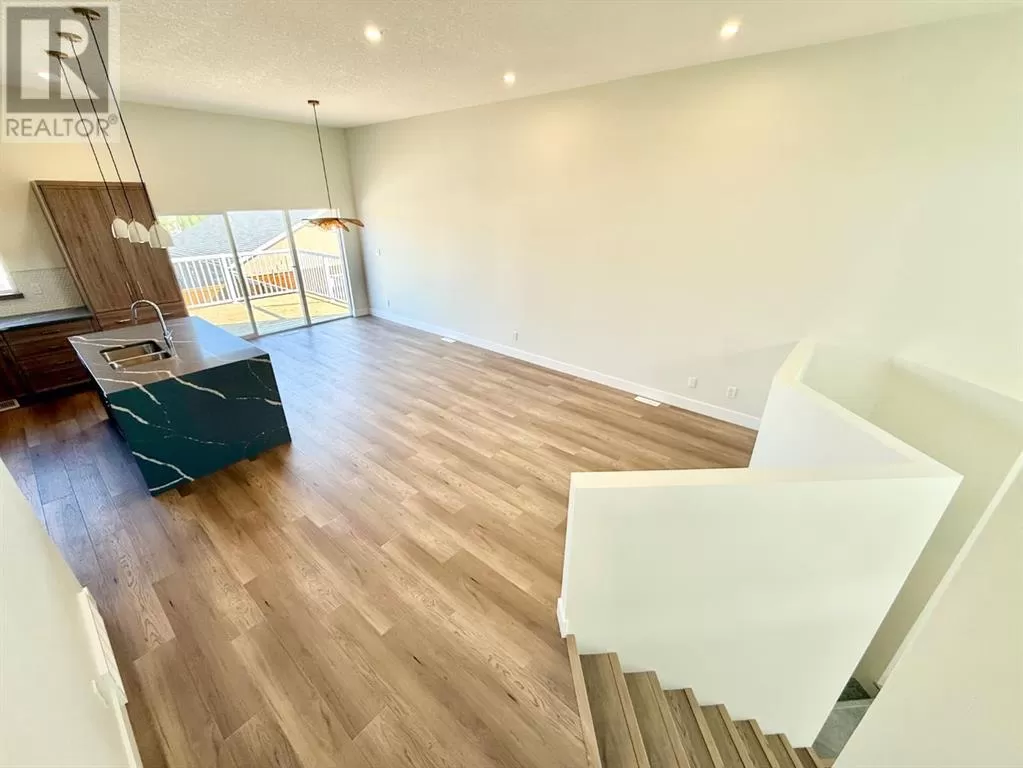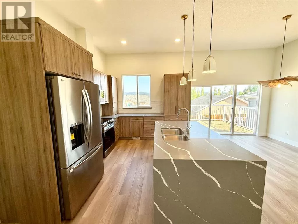 Welcome to this stunning brand new home by Hall-E-Wood Construction, offering over 2,200 sq. ft. of beautifully finished living space in a smart modified bi-level design. Finished with quality materials throughout, this home is ideal for families or anyone seeking style, comfort, and functionality. Step inside to find luxury vinyl plank flooring on the main level, a bright open concept living space, and the kitchen is complete with quartz countertops and stainless steel appliances. The spacious deck and fully fenced yard make it perfect for entertaining and relaxing outdoors. The main floor primary suite offers a walk in shower, make up vanity, and ample closet space. Two additional bedrooms and another full bath are located upstairs. The fully developed basement adds even more living space, featuring a large family room, 4th bedroom, another bathroom, laundry, and the comfort of in floor heating. This property boasts a 24 X 24 heated attached garage, massive concrete driveway, and a huge RV parking pad complete with a sani dump. With quick possession available and new home warranty included, this turn key home is move in ready and built to impress. (id:27476)