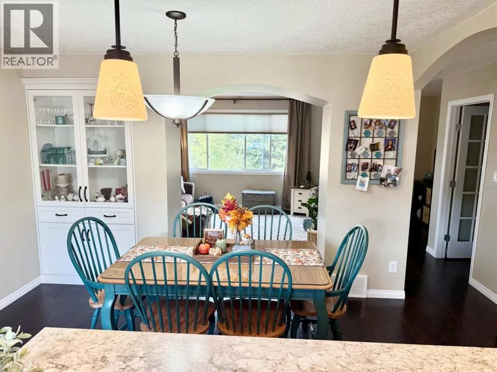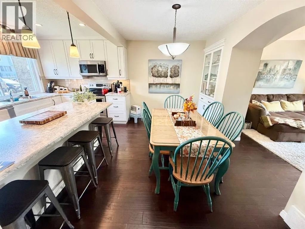 This beautifully renovated condo offers a unique open-concept layout with style and functionality throughout. The bright white kitchen features stainless steel appliances, a central island, and plenty of cabinetry, seamlessly flowing into the dining area and living room, all finished with rich engineered hardwood flooring. Upstairs, you'll find three generous bedrooms and a renovated 4 piece bathroom complete with a soaker tub. The fully finished walk out basement adds even more living space, featuring a large family room, a convenient 3 piece bathroom, laundry area, and direct access to the private back patio with maintenance free lawn and storage shed. This home includes 2 powered parking stalls right out front for your convenience. Ideally located close to walking trails, schools, and all amenities, this Carriage Lane gem is move in ready and waiting for you! (id:27476)