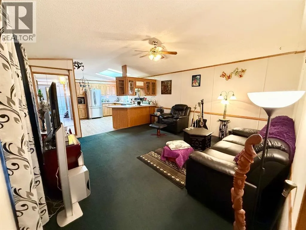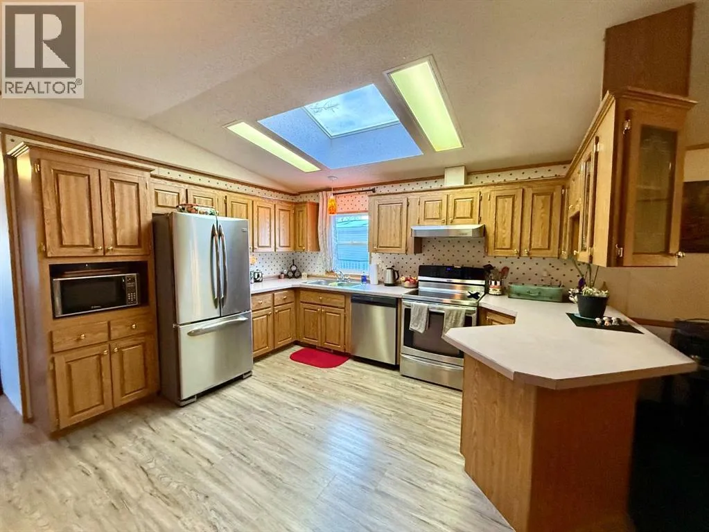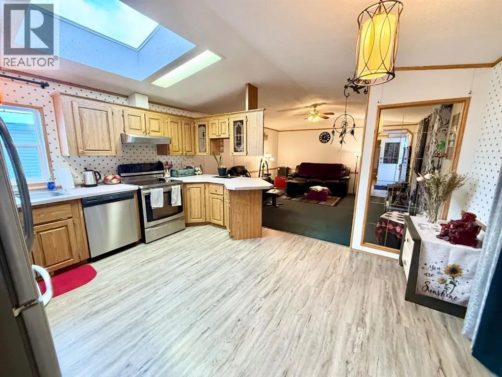 Beautifully maintained home in a quiet, adult only community! This spacious open-concept layout features large windows and a skylight the fill the living areas with natural light. The kitchen offers oak cabinetry, loads of cupboard space, all appliances included and a dedicated dining area. The primary bedroom is privately situated and includes a 4 piece ensuite with a soaker tub plus a large walk in closet. At the opposite end are two additional bedrooms and another 4 piece bathroom, perfect for guests or a home office. You'll love the convenience of the separate laundry room with sink, along with valuable recent upgrades including shingles, furnace, hot water tank, and eaves. Outside features a large deck, private yard, double driveway, and two storage sheds. Move-in ready and set in a peaceful location - this is affordable, low maintenance living at its best. (id:27476)