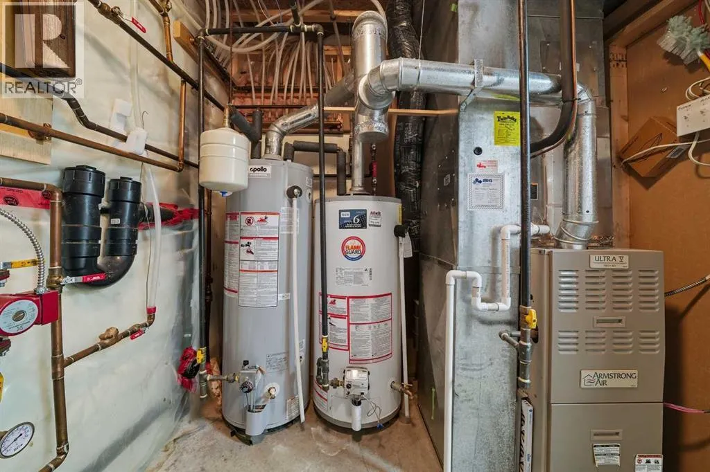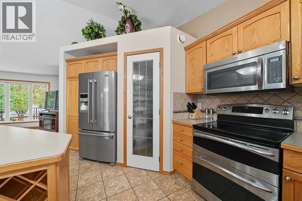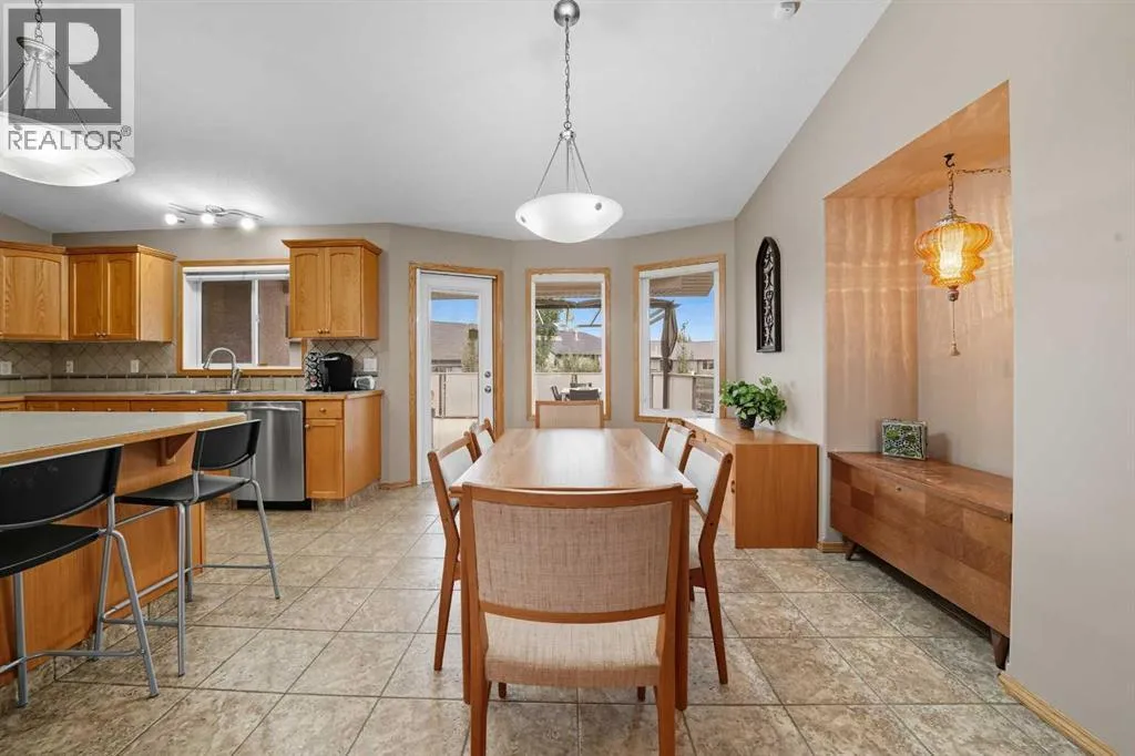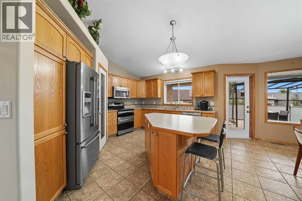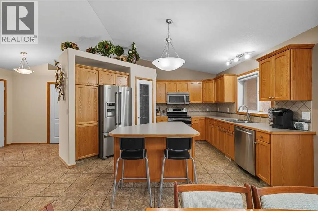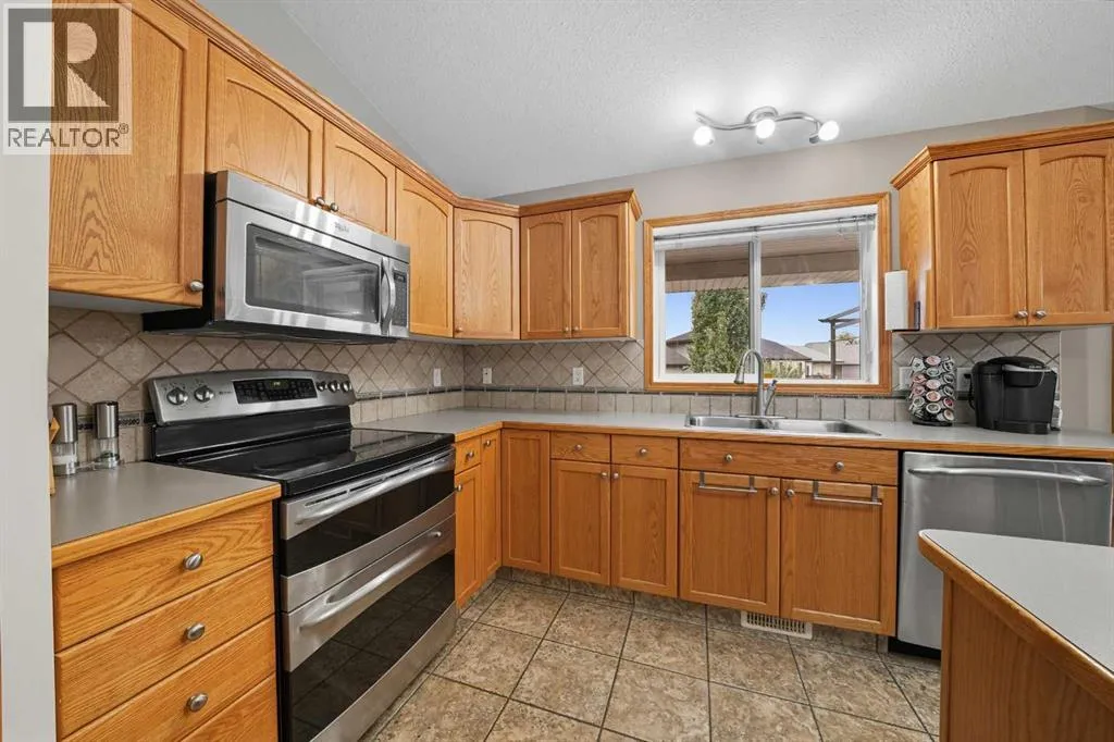 This stunning walkout bungalow not only has all the bells and whistles but also located in a quiet picturesque cul-de-sac. The main floor is an open concept with vaulted ceilings in a bright living room and a spacious dining room. Main floor has ceramic tile throughout. The kitchen has a large island with an abundance of cupboards, a large corner pantry, stainless steel appliances and a built-in wine rack. The dining area has space for a large dining table and a spot for a custom china cabinet. The living room has a spot for a 2nd fireplace, if desired. The upper level has two bedrooms, one being the master bedroom with a huge walk in closet and a three piece ensuite. The lower level has been freshly painted and has a fireplace, wet bar area and a large family room. There are two additional bedrooms both with walk-in closets and another three piece bathroom. There is also plenty of storage and in floor heating in both the lower level and the garage. The house is equipped with a water purification system, central air conditioning and outdoor hot water taps. The front yard is professionally landscaped and the backyard is maintenace free with RV parking and hookups (water & electric), a nice garden area, large storage shed and natural gas hookups on both upper and lower decks. This home has many features for a new owner to enjoy. Hurry call your realtor today. (id:27476)