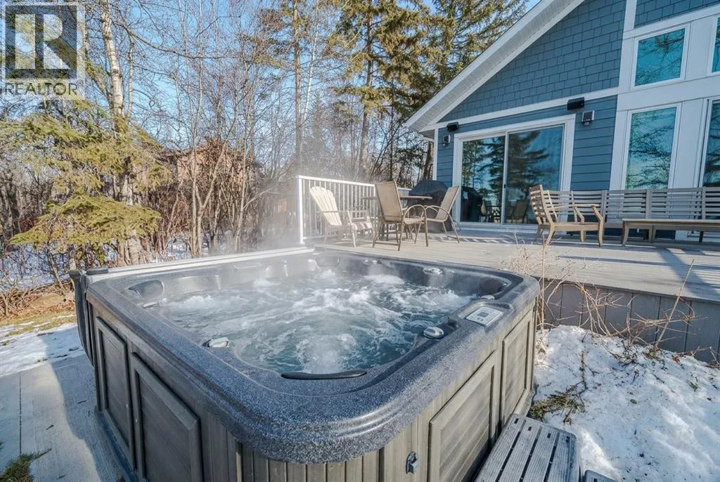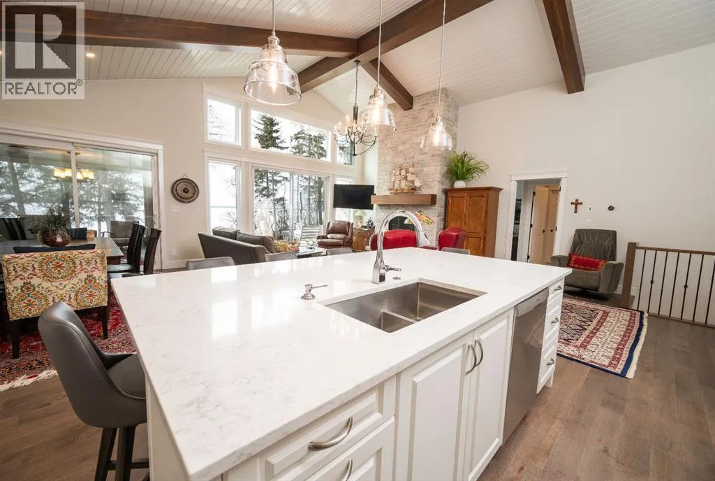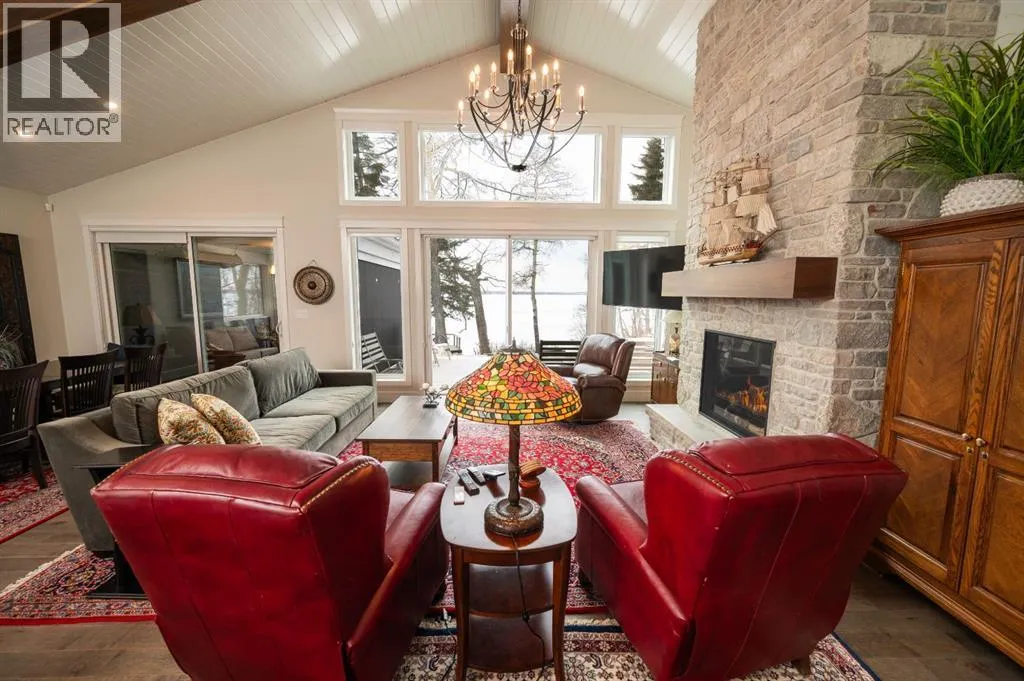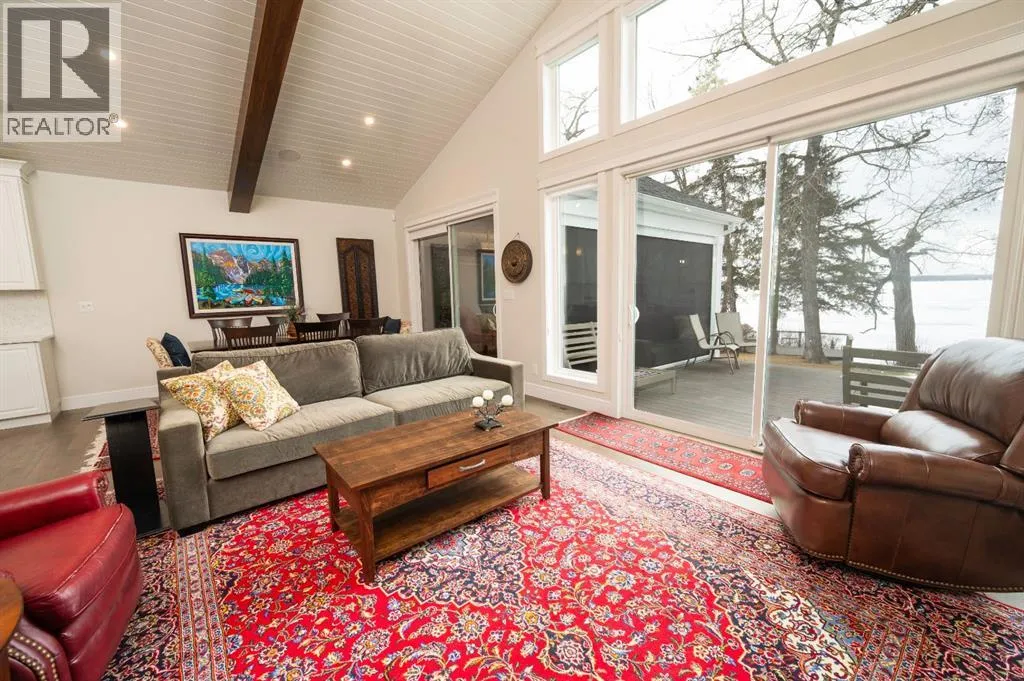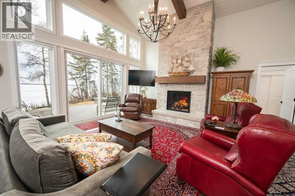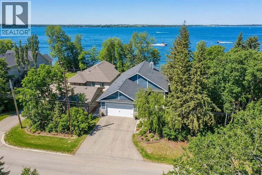 10/10 LAKEFRONT ON SYLVAN LAKE! Stunning from tip to tail, this custom-built Larkaun bungalow is sure to impress the most discerning buyer. Beautiful street appeal welcomes you to the property, with oversized double attached garage with an overhead door that can fit your boat! The composite siding and stone accents add character, as a covered front veranda welcomes you into the property. As you enter the large main foyer, you will find yourself in awe as you look through the main living area to unencumbered views of the lake via the west-facing wall of windows! Vaulted viewings with ship-lap and custom wood beam finishing adds to that cottage feel, as does the floor to ceiling custom gas fireplace with stone masonry accented by a centre room chandelier. The well appointed kitchen features a huge centre island, custom appliances and corner pantry.off the spacious dining room you can enjoy the evening sunsets or drinks with friends in a private enclosed patio with overhead heater. The primary bedroom also offers patio doors overlooking the lake - you will feel immersed in nature as you look out into the private treed yard, surrounded by natural foliage and tucked away from the outside world! The primary ensuite offers a large walk-in steam shower plus double vanity. The main level is completed with a large laundry room, and an additional bedroom with attached full bath. The basement will surprise you, with a massive rec room, 3 more oversized bedrooms with ample storage space, and an additional full bathroom. The lakefront yard is completed with a composite deck, included hot tub, stone fireplace sitting area and a lakefront deck with views overlooking the lake! Locate in the Summer Village of Jarvis Bay - a highly sought after community with west-facing views over Sylvan Lake, offering stunning sunsets, convenient lake access and private beachfront while located only a few minutes drive to the town and all amenities. An unique opportunity seldom available, this one d eserves consideration from anyone looking for that refined lake lifestyle. (id:27476)