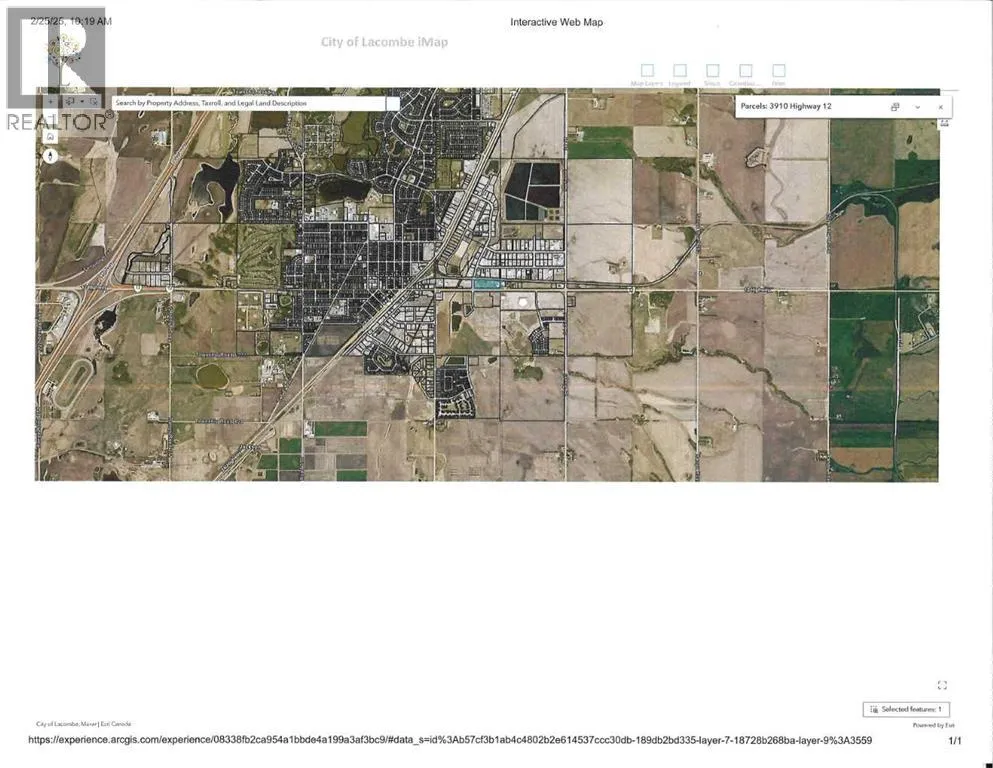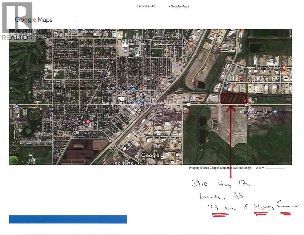 7.9 acres of high visibility, highway commercial frontage in the City of Lacombe with direct access off Hwy 12 and Wolf Creek Drive. In a 2021 letter, the City confirmed a minimum of two access points - one right in/right out entrance/exit off Hwy 12 and a second one off Wolf Creek Drive. A final decision with regards to more access points, left hand turns, etc. would be made after the City has reviewed the results of a (required) traffic impact study. The sight lines are ideal with direct exposure to major traffic routes. Trade activity in this community is growing and the site is surrounded by newer construction including Wendy's, Gary Moe Chrysler Dodge Jeep Ram, Pentagon Farm Centre, Police Station, Metcalf Ridge (residential), and more to come. The City of Lacombe has shown a strong interest in seeing this bustling corner developed. Permitted and discretionary uses for this Highway Commercial District provide the buyer with a wide range of development opportunities. All major services are located nearby. An environmental report was completed in 2011. The small house (new shingles and painted in 2016) and decent sized detached garage is tenant occupied and generates $1150 per month in rental revenue that helps offset the tax and insurance cost until development begins. Seller would consider trades for farmland or recreational property. (id:27476)