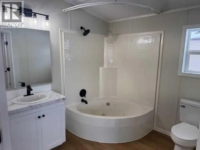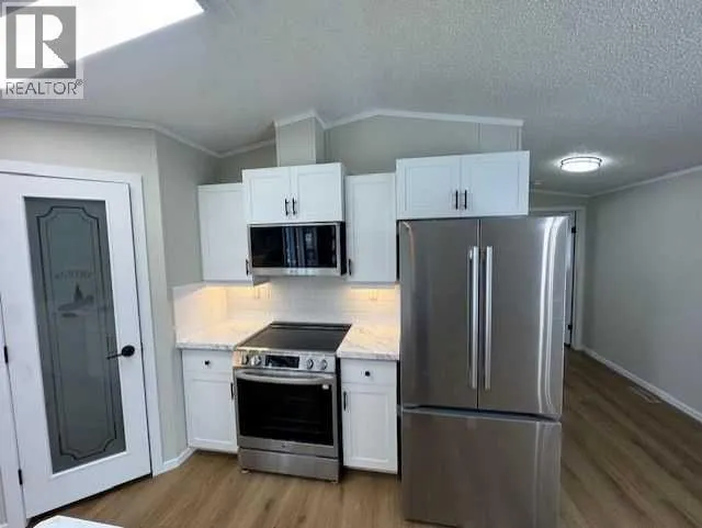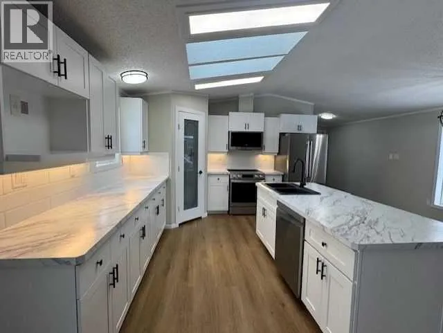 Click brochure link for more details. Fully renovated home in Mackenzie Ranch Estates in Lacombe with extensive upgrades. This unique home is vaulted all the way through, giving the home a larger feel. The open concept kitchen has ample counter space, island with granite sink and black faucet, walk in pantry, lots of cupboards and drawers, new LG appliances including stove, built in microwave, side by side fridge, and dishwasher. The kitchen also includes built-in under cabinet lighting and skylights. The windows in the dining room and living room are oversized to let tons of natural light in. There is a built-in desk with shelves and drawers for office space before the large master bedroom. The master offers a walk in closet, and full bathroom with an oval jetted tub. The laundry room includes cabinets above the new LG washer and dryer, and more storage cabinets by the back door. At the front of the home the front closet is a walk in to store all the seasonâs clothing. There are also 2 good-sized bedrooms, one with a walk-in closet. The front bathroom has a 5-foot walk-in-shower. All the counters, toilets, fixtures, flooring, appliances, siding, insulated skirting, hot water tank, and plug-ins are new. The home sits on piles and the oversized lot can accommodate a large attached garage. Included in the $525.00 lot rent is snow removal, grass cutting, and on-site manager. Water, sewer and garbage are billed by the park. RV storage is available on site for an additional cost. (id:27476)