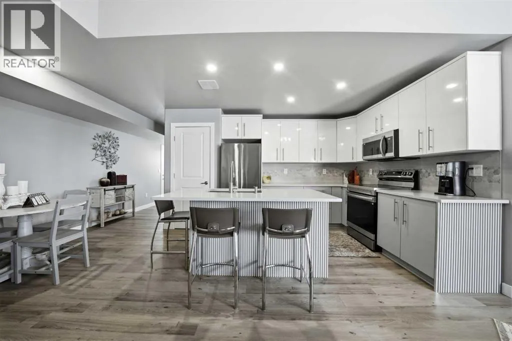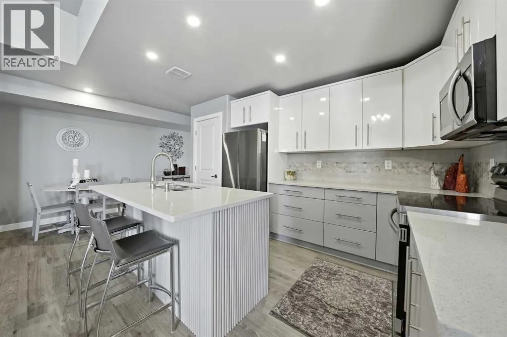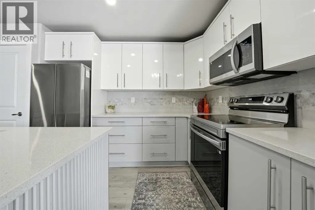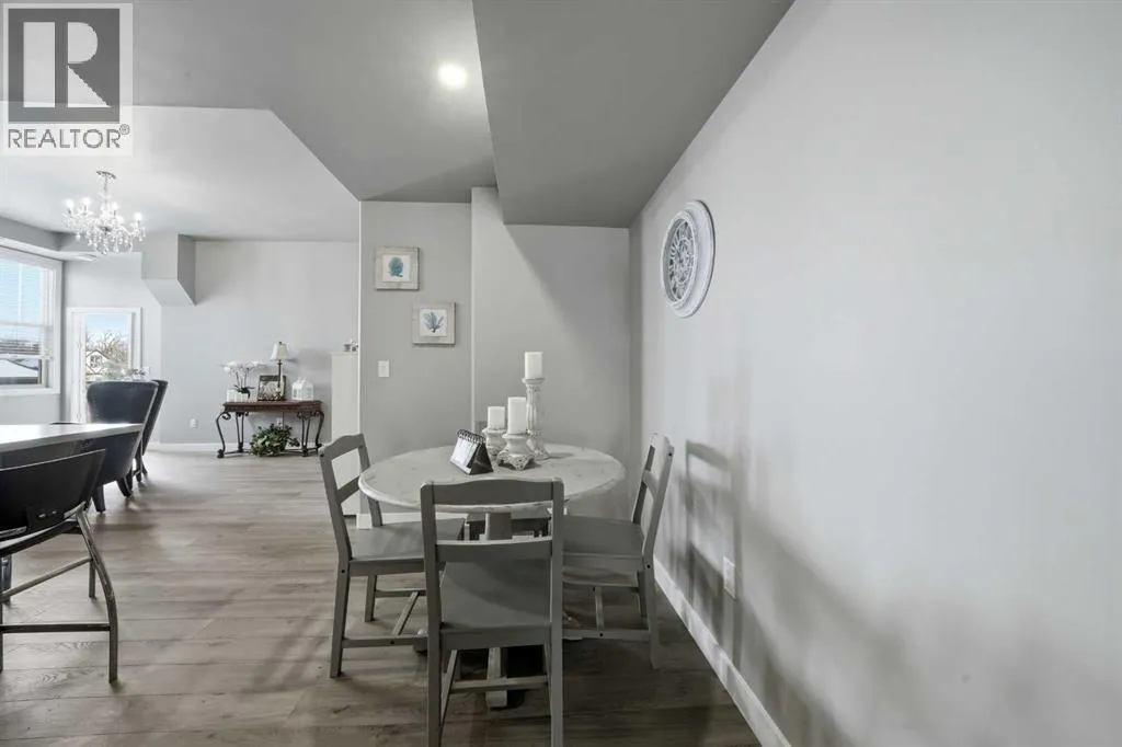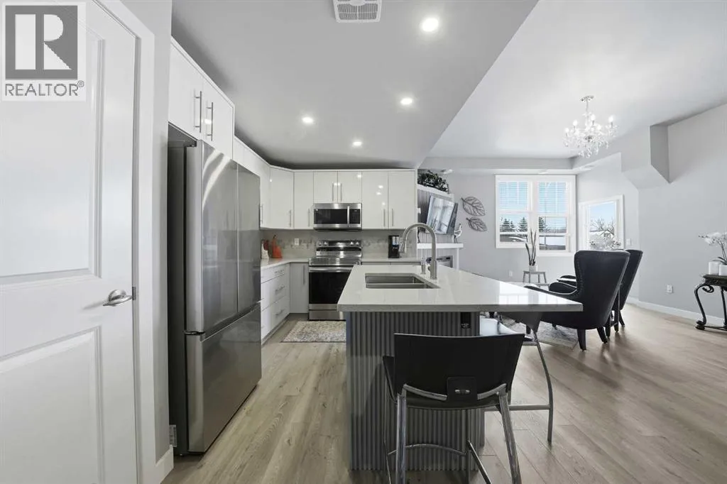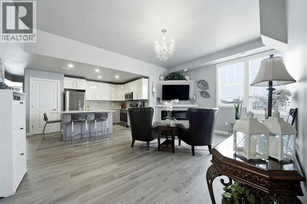 This exquisite, fully renovated top floor corner unit condo is a showstopper! From the high ceilings to the stunning quartz counter tops, fluted feature walls, chandelier lighting, and custom window coverings throughout, this suite has it all. The bright and open floor plan boast a dining area, kitchen with quartz countertops, island w/ eating bar, two-tone cabinets, wall pantry, and stainless appliances. The living room boasts a custom feature wall w/ electric fireplace and access to the east facing balcony to enjoy your morning coffee. The primary bedroom features built-in headboard and a good size walk-in closet. A second bedroom, 3 pc bathroom, and in-suite washer & dryer complete this stunning condo. This unit also comes with 1 assigned parking stall and an additional storage room. Located in the heart of downtown Lacombe, just steps from local amenities and shopping, this is low-maintenance living at its finest. (id:27476)